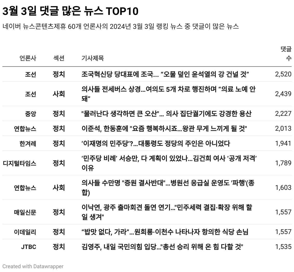 *데이터 수집 기간 : 2024년 3월 16일 *데이터 수집 대상 : 네이버 뉴스콘텐츠제휴 60개 언론사. 종합일간지 10개(경향신문, 국민일보, 동아일보, 문화일보, 서울신문, 세계일보, 조선일보, 중앙일보, 한겨레신문, 한국일보), 방송/통신사 14개(뉴스1, 뉴시스, 연합뉴스, 연합뉴스TV, 채널A, 한국경제TV, JTBC, KBS, MBC, MBN, SBS, SBS BIZ, TV조선, YTN), 경제지 11개(매일경제, 머니투데이, 비즈워치, 서울경제, 아시아경제, 이데일리, 조선비즈, 조세일보, 파이낸셜뉴스, 한국경제, 헤럴드경제) 인터넷 8개(노컷뉴스, 더팩트, 데일리안, 머니S, 미디어오늘, 아이뉴스24, 오마이뉴스, 프레시안), IT 5개(디지털데일리,디지털타임스, 블로터, 전자신문, 지디넷코리아), 지역 12개(강원도민일보, 강원일보, 경기일보, 국제신문, 대구MBC, 대전일보, 매일신문, 부산일보, 전주MBC, CJB청주방송, JIBS, kbc광주방송)