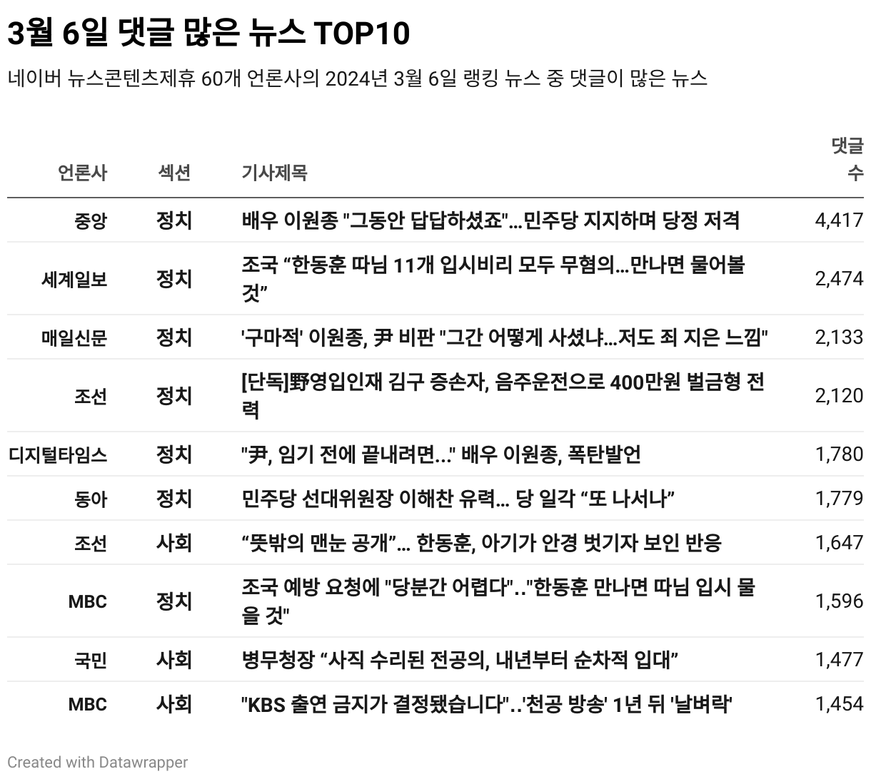 *데이터 수집 기간 : 2024년 3월 7일 *데이터 수집 대상 : 네이버 뉴스콘텐츠제휴 60개 언론사. 종합일간지 10개(경향신문, 국민일보, 동아일보, 문화일보, 서울신문, 세계일보, 조선일보, 중앙일보, 한겨레신문, 한국일보), 방송/통신사 14개(뉴스1, 뉴시스, 연합뉴스, 연합뉴스TV, 채널A, 한국경제TV, JTBC, KBS, MBC, MBN, SBS, SBS BIZ, TV조선, YTN), 경제지 11개(매일경제, 머니투데이, 비즈워치, 서울경제, 아시아경제, 이데일리, 조선비즈, 조세일보, 파이낸셜뉴스, 한국경제, 헤럴드경제) 인터넷 8개(노컷뉴스, 더팩트, 데일리안, 머니S, 미디어오늘, 아이뉴스24, 오마이뉴스, 프레시안), IT 5개(디지털데일리,디지털타임스, 블로터, 전자신문, 지디넷코리아), 지역 12개(강원도민일보, 강원일보, 경기일보, 국제신문, 대구MBC, 대전일보, 매일신문, 부산일보, 전주MBC, CJB청주방송, JIBS, kbc광주방송)