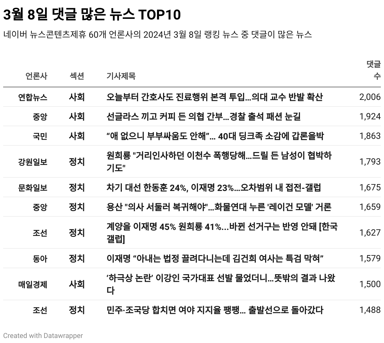 *데이터 수집 기간 : 2024년 3월 9일 *데이터 수집 대상 : 네이버 뉴스콘텐츠제휴 60개 언론사. 종합일간지 10개(경향신문, 국민일보, 동아일보, 문화일보, 서울신문, 세계일보, 조선일보, 중앙일보, 한겨레신문, 한국일보), 방송/통신사 14개(뉴스1, 뉴시스, 연합뉴스, 연합뉴스TV, 채널A, 한국경제TV, JTBC, KBS, MBC, MBN, SBS, SBS BIZ, TV조선, YTN), 경제지 11개(매일경제, 머니투데이, 비즈워치, 서울경제, 아시아경제, 이데일리, 조선비즈, 조세일보, 파이낸셜뉴스, 한국경제, 헤럴드경제) 인터넷 8개(노컷뉴스, 더팩트, 데일리안, 머니S, 미디어오늘, 아이뉴스24, 오마이뉴스, 프레시안), IT 5개(디지털데일리,디지털타임스, 블로터, 전자신문, 지디넷코리아), 지역 12개(강원도민일보, 강원일보, 경기일보, 국제신문, 대구MBC, 대전일보, 매일신문, 부산일보, 전주MBC, CJB청주방송, JIBS, kbc광주방송)
