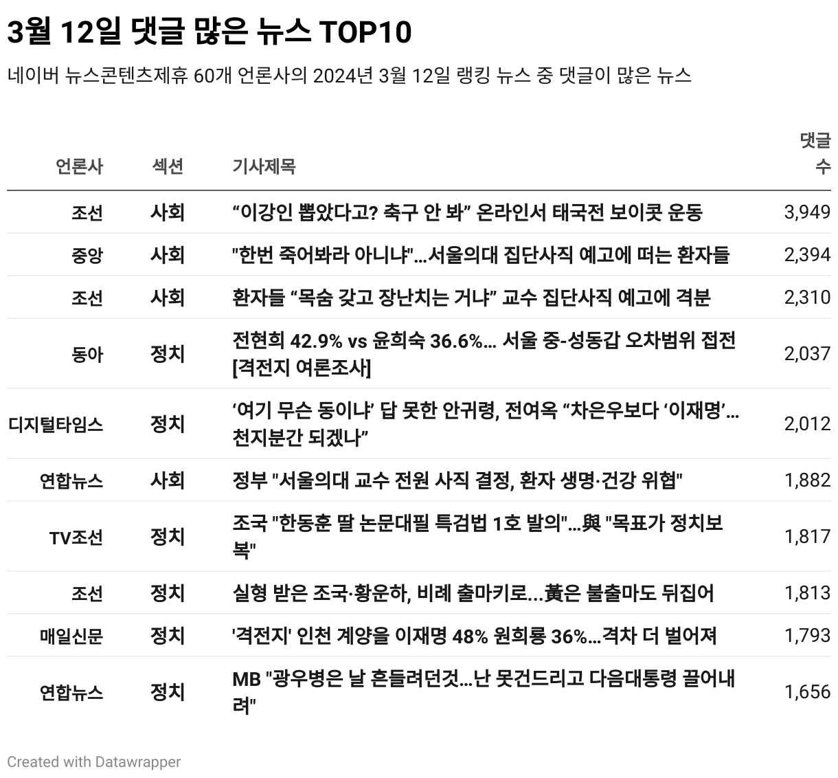 *데이터 수집 기간 : 2024년 3월 13일 *데이터 수집 대상 : 네이버 뉴스콘텐츠제휴 60개 언론사. 종합일간지 10개(경향신문, 국민일보, 동아일보, 문화일보, 서울신문, 세계일보, 조선일보, 중앙일보, 한겨레신문, 한국일보), 방송/통신사 14개(뉴스1, 뉴시스, 연합뉴스, 연합뉴스TV, 채널A, 한국경제TV, JTBC, KBS, MBC, MBN, SBS, SBS BIZ, TV조선, YTN), 경제지 11개(매일경제, 머니투데이, 비즈워치, 서울경제, 아시아경제, 이데일리, 조선비즈, 조세일보, 파이낸셜뉴스, 한국경제, 헤럴드경제) 인터넷 8개(노컷뉴스, 더팩트, 데일리안, 머니S, 미디어오늘, 아이뉴스24, 오마이뉴스, 프레시안), IT 5개(디지털데일리,디지털타임스, 블로터, 전자신문, 지디넷코리아), 지역 12개(강원도민일보, 강원일보, 경기일보, 국제신문, 대구MBC, 대전일보, 매일신문, 부산일보, 전주MBC, CJB청주방송, JIBS, kbc광주방송)