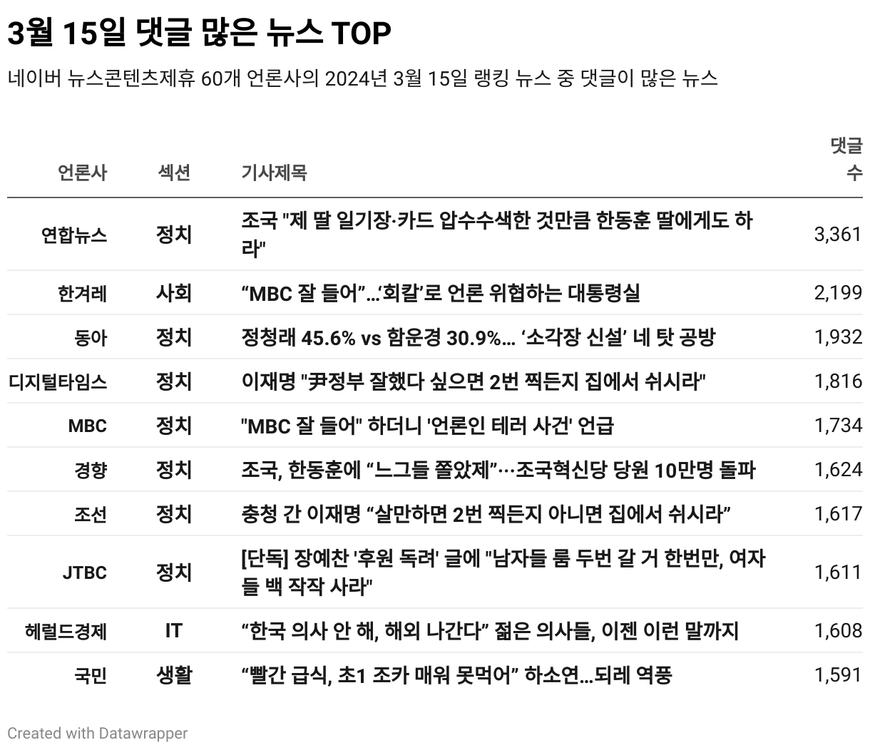 *데이터 수집 기간 : 2024년 3월 16일 *데이터 수집 대상 : 네이버 뉴스콘텐츠제휴 60개 언론사. 종합일간지 10개(경향신문, 국민일보, 동아일보, 문화일보, 서울신문, 세계일보, 조선일보, 중앙일보, 한겨레신문, 한국일보), 방송/통신사 14개(뉴스1, 뉴시스, 연합뉴스, 연합뉴스TV, 채널A, 한국경제TV, JTBC, KBS, MBC, MBN, SBS, SBS BIZ, TV조선, YTN), 경제지 11개(매일경제, 머니투데이, 비즈워치, 서울경제, 아시아경제, 이데일리, 조선비즈, 조세일보, 파이낸셜뉴스, 한국경제, 헤럴드경제) 인터넷 8개(노컷뉴스, 더팩트, 데일리안, 머니S, 미디어오늘, 아이뉴스24, 오마이뉴스, 프레시안), IT 5개(디지털데일리,디지털타임스, 블로터, 전자신문, 지디넷코리아), 지역 12개(강원도민일보, 강원일보, 경기일보, 국제신문, 대구MBC, 대전일보, 매일신문, 부산일보, 전주MBC, CJB청주방송, JIBS, kbc광주방송)