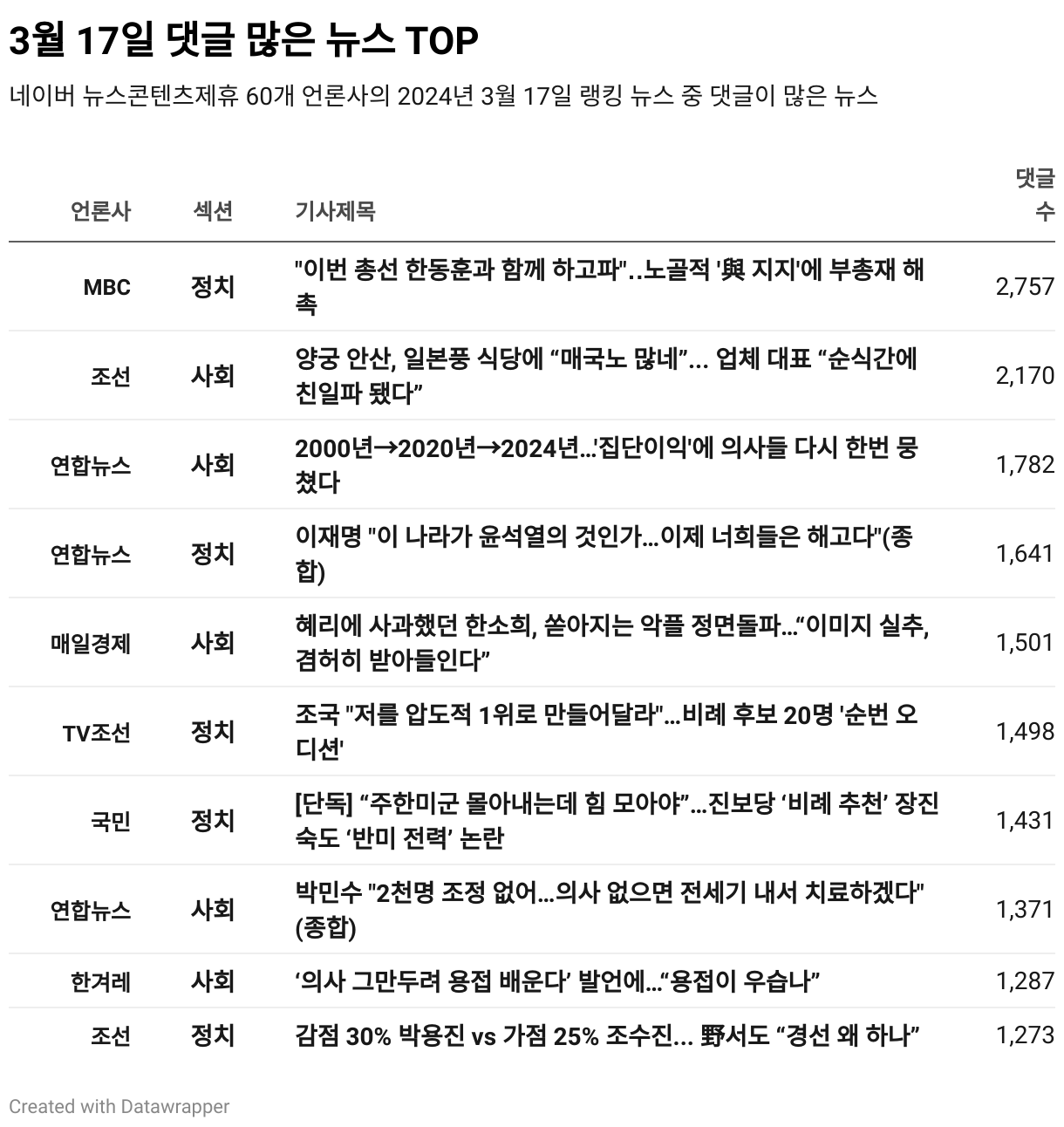 *데이터 수집 기간 : 2024년 3월 18일 *데이터 수집 대상 : 네이버 뉴스콘텐츠제휴 60개 언론사. 종합일간지 10개(경향신문, 국민일보, 동아일보, 문화일보, 서울신문, 세계일보, 조선일보, 중앙일보, 한겨레신문, 한국일보), 방송/통신사 14개(뉴스1, 뉴시스, 연합뉴스, 연합뉴스TV, 채널A, 한국경제TV, JTBC, KBS, MBC, MBN, SBS, SBS BIZ, TV조선, YTN), 경제지 11개(매일경제, 머니투데이, 비즈워치, 서울경제, 아시아경제, 이데일리, 조선비즈, 조세일보, 파이낸셜뉴스, 한국경제, 헤럴드경제) 인터넷 8개(노컷뉴스, 더팩트, 데일리안, 머니S, 미디어오늘, 아이뉴스24, 오마이뉴스, 프레시안), IT 5개(디지털데일리,디지털타임스, 블로터, 전자신문, 지디넷코리아), 지역 12개(강원도민일보, 강원일보, 경기일보, 국제신문, 대구MBC, 대전일보, 매일신문, 부산일보, 전주MBC, CJB청주방송, JIBS, kbc광주방송)