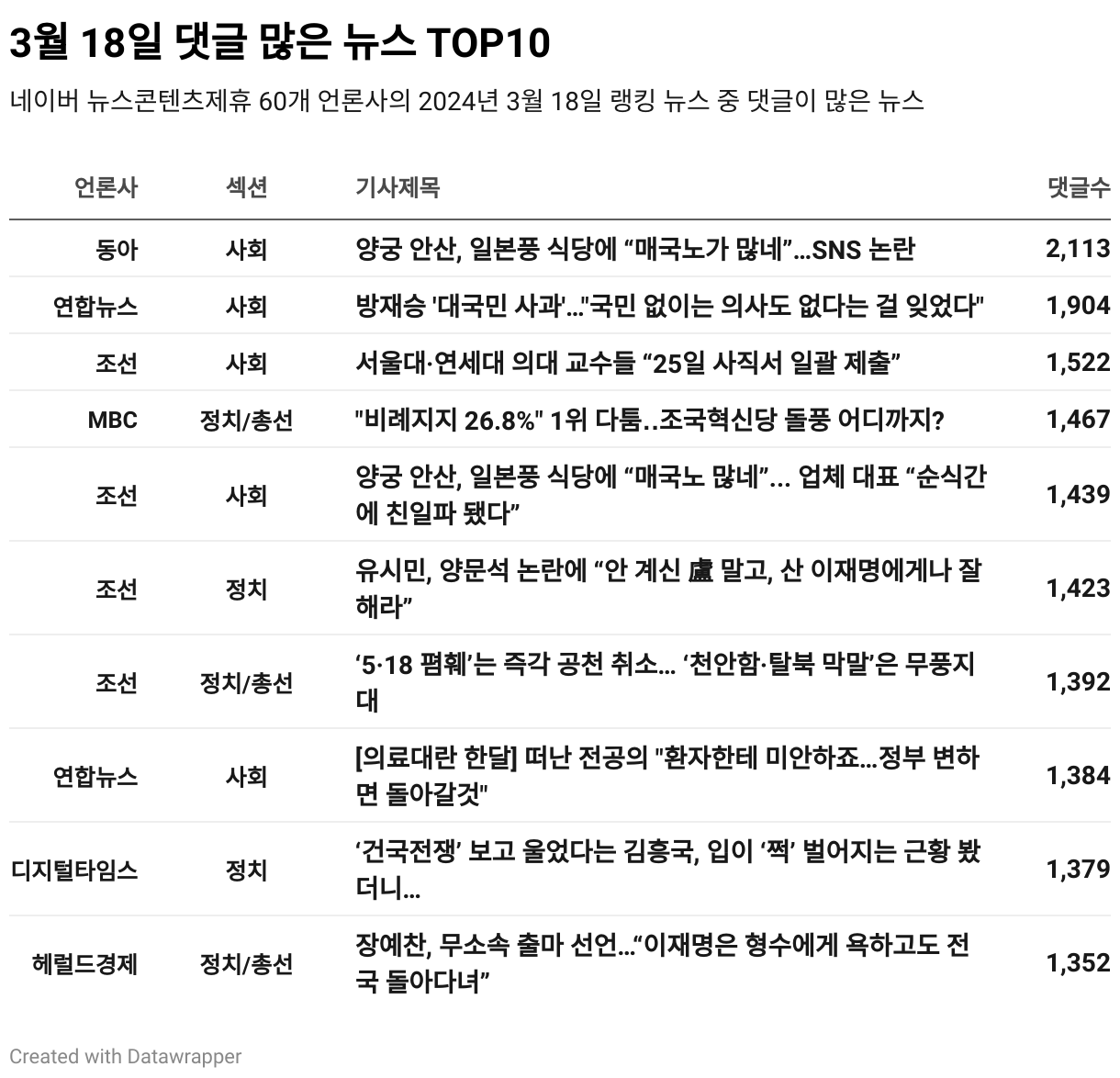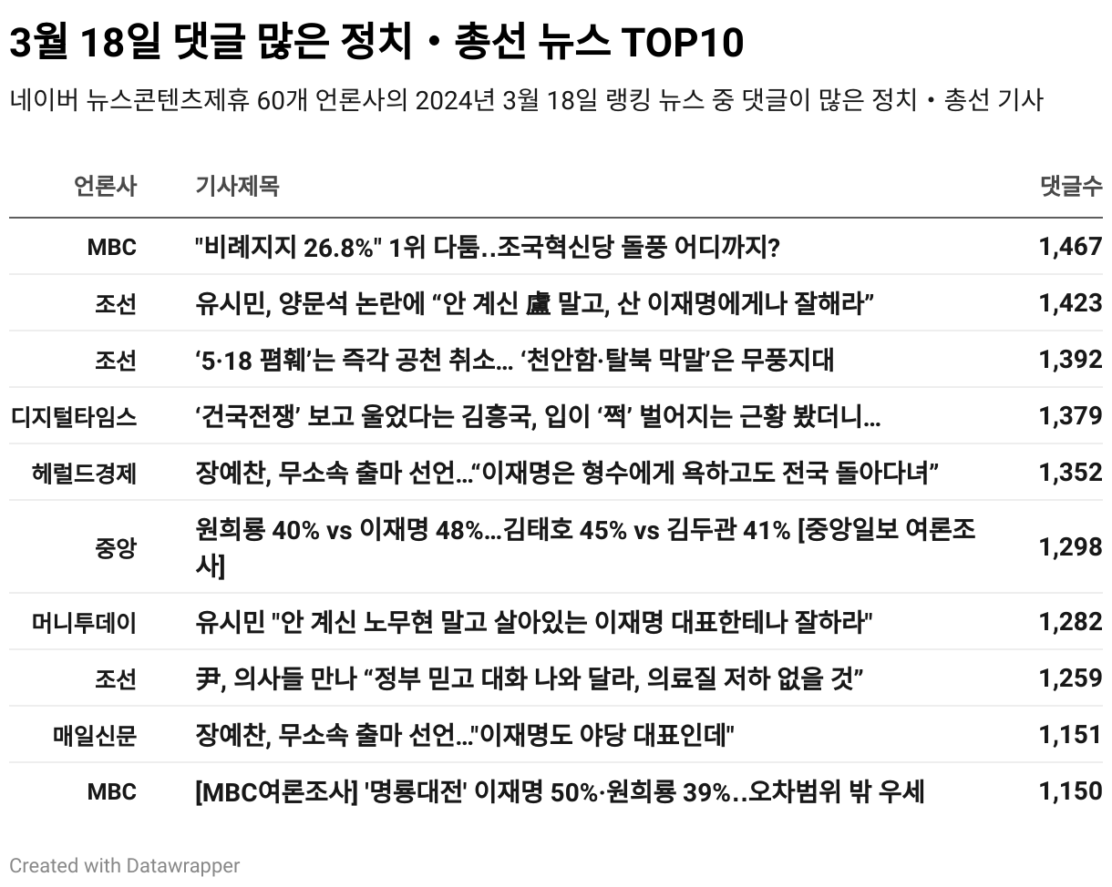 *데이터 수집 기간 : 2024년 3월 19일 *데이터 수집 대상 : 네이버 뉴스콘텐츠제휴 60개 언론사. 종합일간지 10개(경향신문, 국민일보, 동아일보, 문화일보, 서울신문, 세계일보, 조선일보, 중앙일보, 한겨레신문, 한국일보), 방송/통신사 14개(뉴스1, 뉴시스, 연합뉴스, 연합뉴스TV, 채널A, 한국경제TV, JTBC, KBS, MBC, MBN, SBS, SBS BIZ, TV조선, YTN), 경제지 11개(매일경제, 머니투데이, 비즈워치, 서울경제, 아시아경제, 이데일리, 조선비즈, 조세일보, 파이낸셜뉴스, 한국경제, 헤럴드경제) 인터넷 8개(노컷뉴스, 더팩트, 데일리안, 머니S, 미디어오늘, 아이뉴스24, 오마이뉴스, 프레시안), IT 5개(디지털데일리,디지털타임스, 블로터, 전자신문, 지디넷코리아), 지역 12개(강원도민일보, 강원일보, 경기일보, 국제신문, 대구MBC, 대전일보, 매일신문, 부산일보, 전주MBC, CJB청주방송, JIBS, kbc광주방송)
