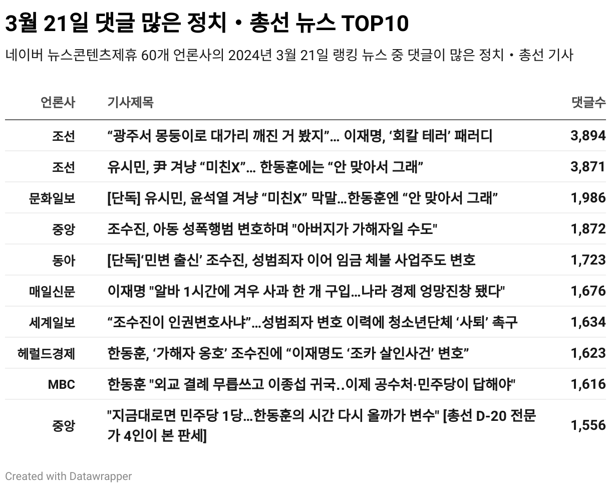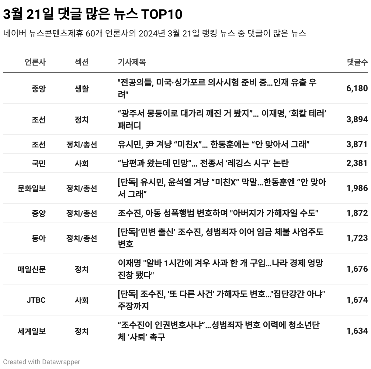 *데이터 수집 기간 : 2024년 3월 22일 *데이터 수집 대상 : 네이버 뉴스콘텐츠제휴 60개 언론사. 종합일간지 10개(경향신문, 국민일보, 동아일보, 문화일보, 서울신문, 세계일보, 조선일보, 중앙일보, 한겨레신문, 한국일보), 방송/통신사 14개(뉴스1, 뉴시스, 연합뉴스, 연합뉴스TV, 채널A, 한국경제TV, JTBC, KBS, MBC, MBN, SBS, SBS BIZ, TV조선, YTN), 경제지 11개(매일경제, 머니투데이, 비즈워치, 서울경제, 아시아경제, 이데일리, 조선비즈, 조세일보, 파이낸셜뉴스, 한국경제, 헤럴드경제) 인터넷 8개(노컷뉴스, 더팩트, 데일리안, 머니S, 미디어오늘, 아이뉴스24, 오마이뉴스, 프레시안), IT 5개(디지털데일리,디지털타임스, 블로터, 전자신문, 지디넷코리아), 지역 12개(강원도민일보, 강원일보, 경기일보, 국제신문, 대구MBC, 대전일보, 매일신문, 부산일보, 전주MBC, CJB청주방송, JIBS, kbc광주방송)