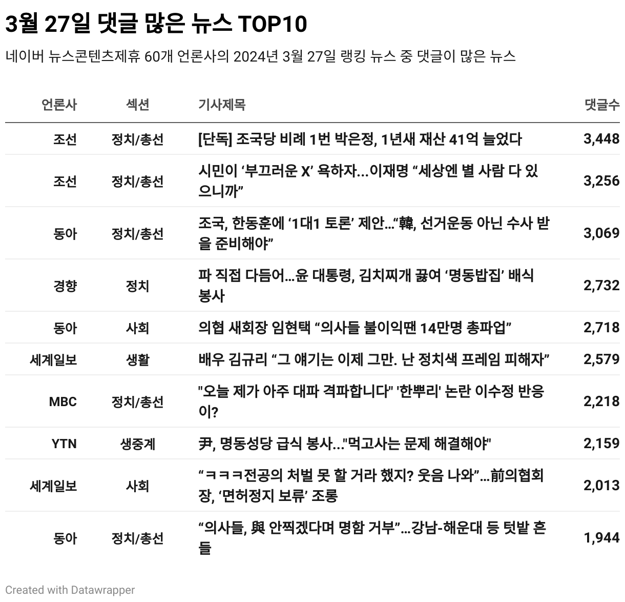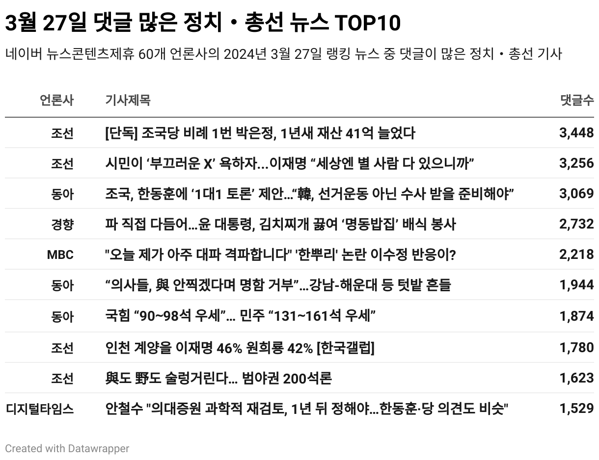 *데이터 수집 기간 : 2024년 3월 28일 *데이터 수집 대상 : 네이버 뉴스콘텐츠제휴 60개 언론사. 종합일간지 10개(경향신문, 국민일보, 동아일보, 문화일보, 서울신문, 세계일보, 조선일보, 중앙일보, 한겨레신문, 한국일보), 방송/통신사 14개(뉴스1, 뉴시스, 연합뉴스, 연합뉴스TV, 채널A, 한국경제TV, JTBC, KBS, MBC, MBN, SBS, SBS BIZ, TV조선, YTN), 경제지 11개(매일경제, 머니투데이, 비즈워치, 서울경제, 아시아경제, 이데일리, 조선비즈, 조세일보, 파이낸셜뉴스, 한국경제, 헤럴드경제) 인터넷 8개(노컷뉴스, 더팩트, 데일리안, 머니S, 미디어오늘, 아이뉴스24, 오마이뉴스, 프레시안), IT 5개(디지털데일리,디지털타임스, 블로터, 전자신문, 지디넷코리아), 지역 12개(강원도민일보, 강원일보, 경기일보, 국제신문, 대구MBC, 대전일보, 매일신문, 부산일보, 전주MBC, CJB청주방송, JIBS, kbc광주방송)
