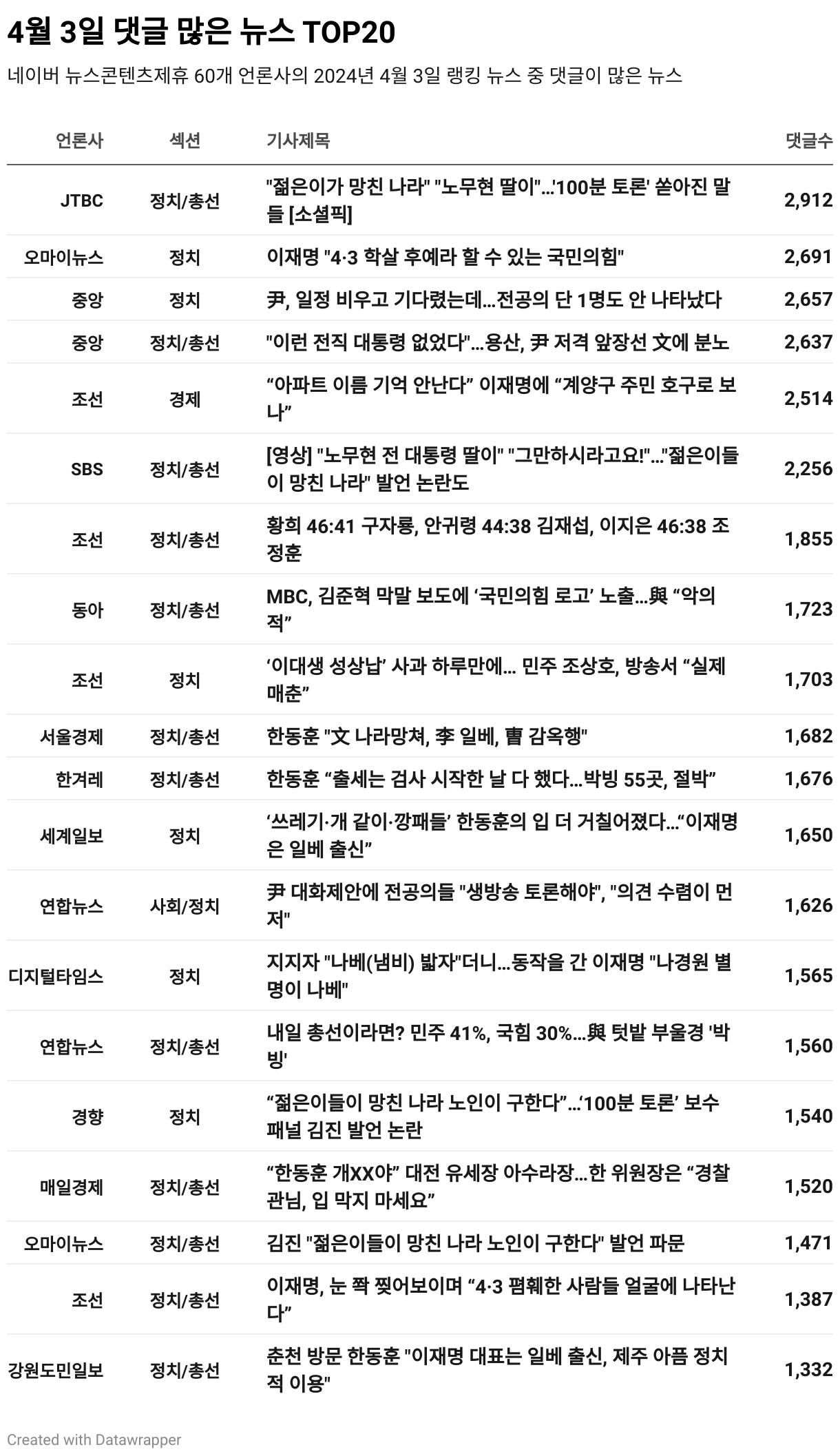 *데이터 수집 기간 : 2024년 4월 4일 *데이터 수집 대상 : 네이버 뉴스콘텐츠제휴 60개 언론사. 종합일간지 10개(경향신문, 국민일보, 동아일보, 문화일보, 서울신문, 세계일보, 조선일보, 중앙일보, 한겨레신문, 한국일보), 방송/통신사 14개(뉴스1, 뉴시스, 연합뉴스, 연합뉴스TV, 채널A, 한국경제TV, JTBC, KBS, MBC, MBN, SBS, SBS BIZ, TV조선, YTN), 경제지 11개(매일경제, 머니투데이, 비즈워치, 서울경제, 아시아경제, 이데일리, 조선비즈, 조세일보, 파이낸셜뉴스, 한국경제, 헤럴드경제) 인터넷 8개(노컷뉴스, 더팩트, 데일리안, 머니S, 미디어오늘, 아이뉴스24, 오마이뉴스, 프레시안), IT 5개(디지털데일리,디지털타임스, 블로터, 전자신문, 지디넷코리아), 지역 12개(강원도민일보, 강원일보, 경기일보, 국제신문, 대구MBC, 대전일보, 매일신문, 부산일보, 전주MBC, CJB청주방송, JIBS, kbc광주방송)