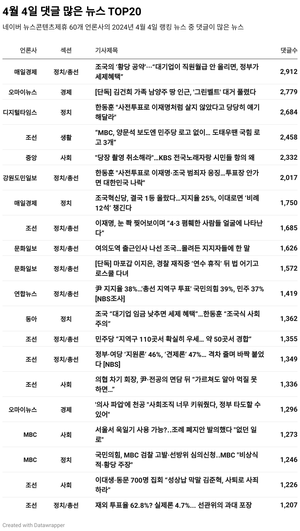 *데이터 수집 기간 : 2024년 4월 5일 *데이터 수집 대상 : 네이버 뉴스콘텐츠제휴 60개 언론사. 종합일간지 10개(경향신문, 국민일보, 동아일보, 문화일보, 서울신문, 세계일보, 조선일보, 중앙일보, 한겨레신문, 한국일보), 방송/통신사 14개(뉴스1, 뉴시스, 연합뉴스, 연합뉴스TV, 채널A, 한국경제TV, JTBC, KBS, MBC, MBN, SBS, SBS BIZ, TV조선, YTN), 경제지 11개(매일경제, 머니투데이, 비즈워치, 서울경제, 아시아경제, 이데일리, 조선비즈, 조세일보, 파이낸셜뉴스, 한국경제, 헤럴드경제) 인터넷 8개(노컷뉴스, 더팩트, 데일리안, 머니S, 미디어오늘, 아이뉴스24, 오마이뉴스, 프레시안), IT 5개(디지털데일리,디지털타임스, 블로터, 전자신문, 지디넷코리아), 지역 12개(강원도민일보, 강원일보, 경기일보, 국제신문, 대구MBC, 대전일보, 매일신문, 부산일보, 전주MBC, CJB청주방송, JIBS, kbc광주방송)