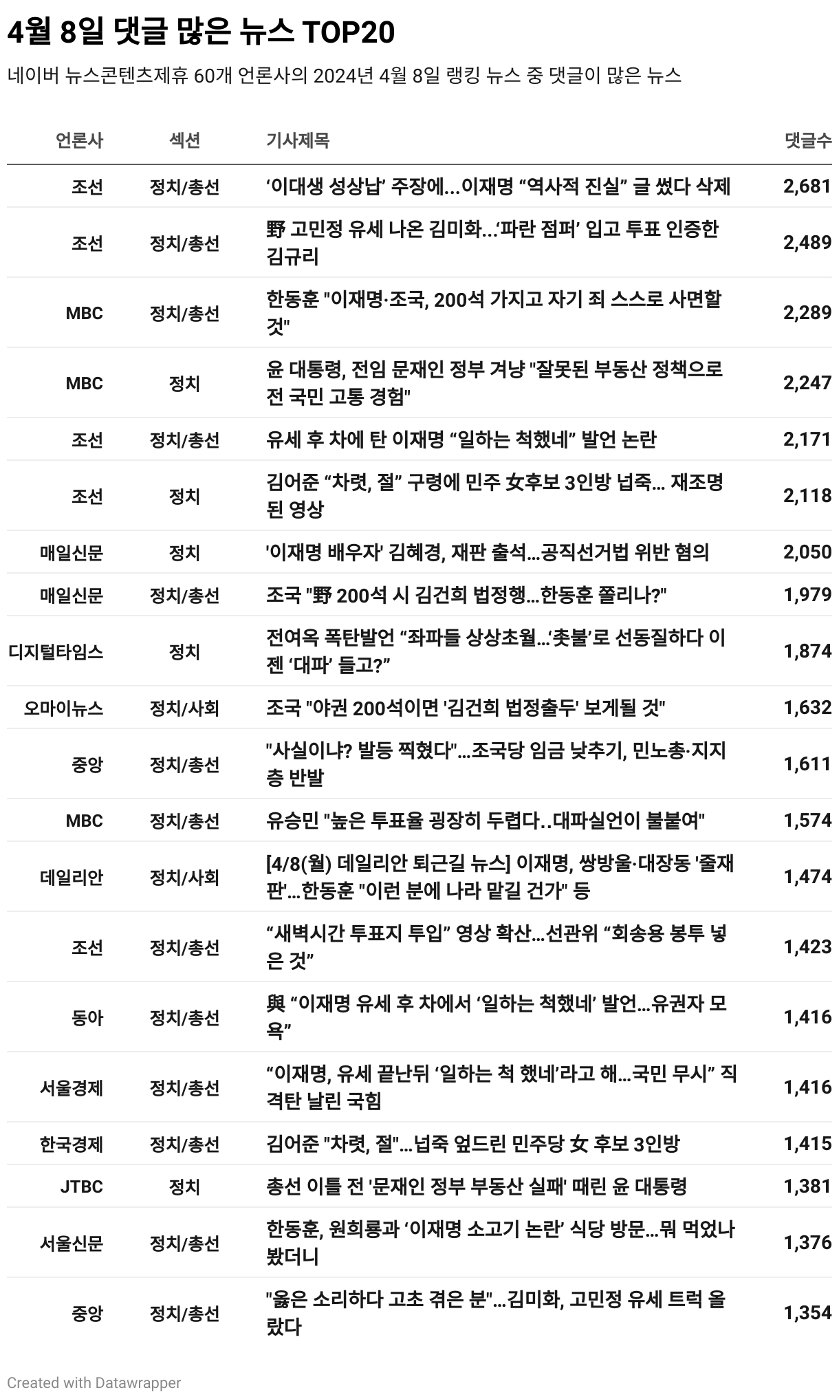 *데이터 수집 기간 : 2024년 4월 9일 *데이터 수집 대상 : 네이버 뉴스콘텐츠제휴 60개 언론사. 종합일간지 10개(경향신문, 국민일보, 동아일보, 문화일보, 서울신문, 세계일보, 조선일보, 중앙일보, 한겨레신문, 한국일보), 방송/통신사 14개(뉴스1, 뉴시스, 연합뉴스, 연합뉴스TV, 채널A, 한국경제TV, JTBC, KBS, MBC, MBN, SBS, SBS BIZ, TV조선, YTN), 경제지 11개(매일경제, 머니투데이, 비즈워치, 서울경제, 아시아경제, 이데일리, 조선비즈, 조세일보, 파이낸셜뉴스, 한국경제, 헤럴드경제) 인터넷 8개(노컷뉴스, 더팩트, 데일리안, 머니S, 미디어오늘, 아이뉴스24, 오마이뉴스, 프레시안), IT 5개(디지털데일리,디지털타임스, 블로터, 전자신문, 지디넷코리아), 지역 12개(강원도민일보, 강원일보, 경기일보, 국제신문, 대구MBC, 대전일보, 매일신문, 부산일보, 전주MBC, CJB청주방송, JIBS, kbc광주방송)