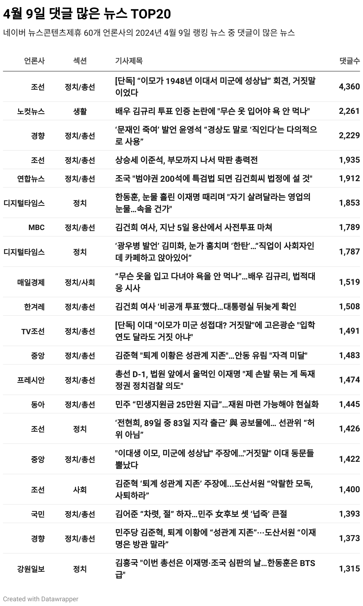 *데이터 수집 기간 : 2024년 4월 10일 *데이터 수집 대상 : 네이버 뉴스콘텐츠제휴 60개 언론사. 종합일간지 10개(경향신문, 국민일보, 동아일보, 문화일보, 서울신문, 세계일보, 조선일보, 중앙일보, 한겨레신문, 한국일보), 방송/통신사 14개(뉴스1, 뉴시스, 연합뉴스, 연합뉴스TV, 채널A, 한국경제TV, JTBC, KBS, MBC, MBN, SBS, SBS BIZ, TV조선, YTN), 경제지 11개(매일경제, 머니투데이, 비즈워치, 서울경제, 아시아경제, 이데일리, 조선비즈, 조세일보, 파이낸셜뉴스, 한국경제, 헤럴드경제) 인터넷 8개(노컷뉴스, 더팩트, 데일리안, 머니S, 미디어오늘, 아이뉴스24, 오마이뉴스, 프레시안), IT 5개(디지털데일리,디지털타임스, 블로터, 전자신문, 지디넷코리아), 지역 12개(강원도민일보, 강원일보, 경기일보, 국제신문, 대구MBC, 대전일보, 매일신문, 부산일보, 전주MBC, CJB청주방송, JIBS, kbc광주방송)