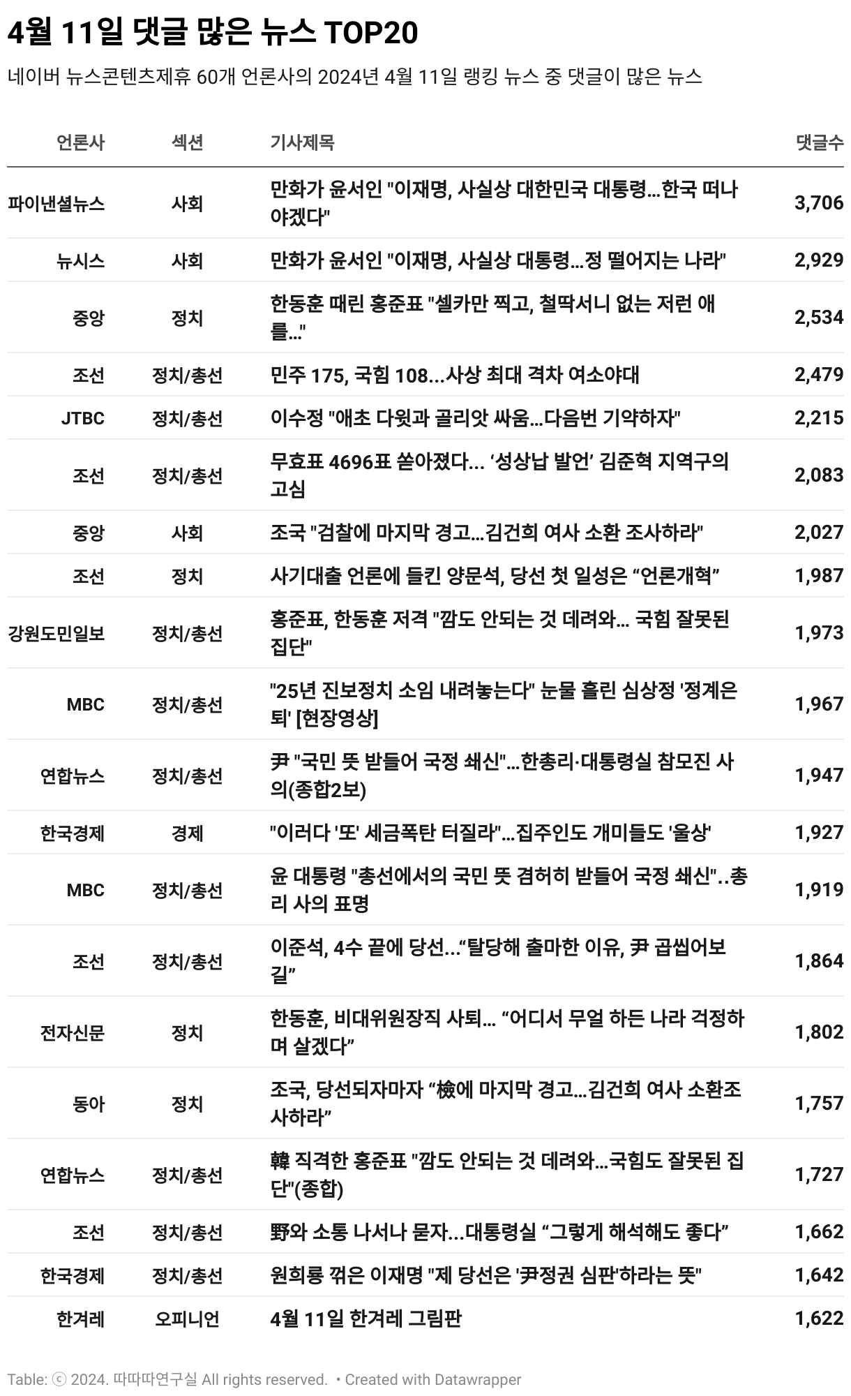 *데이터 수집 기간 : 2024년 4월 12일 *데이터 수집 대상 : 네이버 뉴스콘텐츠제휴 60개 언론사. 종합일간지 10개(경향신문, 국민일보, 동아일보, 문화일보, 서울신문, 세계일보, 조선일보, 중앙일보, 한겨레신문, 한국일보), 방송/통신사 14개(뉴스1, 뉴시스, 연합뉴스, 연합뉴스TV, 채널A, 한국경제TV, JTBC, KBS, MBC, MBN, SBS, SBS BIZ, TV조선, YTN), 경제지 11개(매일경제, 머니투데이, 비즈워치, 서울경제, 아시아경제, 이데일리, 조선비즈, 조세일보, 파이낸셜뉴스, 한국경제, 헤럴드경제) 인터넷 8개(노컷뉴스, 더팩트, 데일리안, 머니S, 미디어오늘, 아이뉴스24, 오마이뉴스, 프레시안), IT 5개(디지털데일리,디지털타임스, 블로터, 전자신문, 지디넷코리아), 지역 12개(강원도민일보, 강원일보, 경기일보, 국제신문, 대구MBC, 대전일보, 매일신문, 부산일보, 전주MBC, CJB청주방송, JIBS, kbc광주방송)