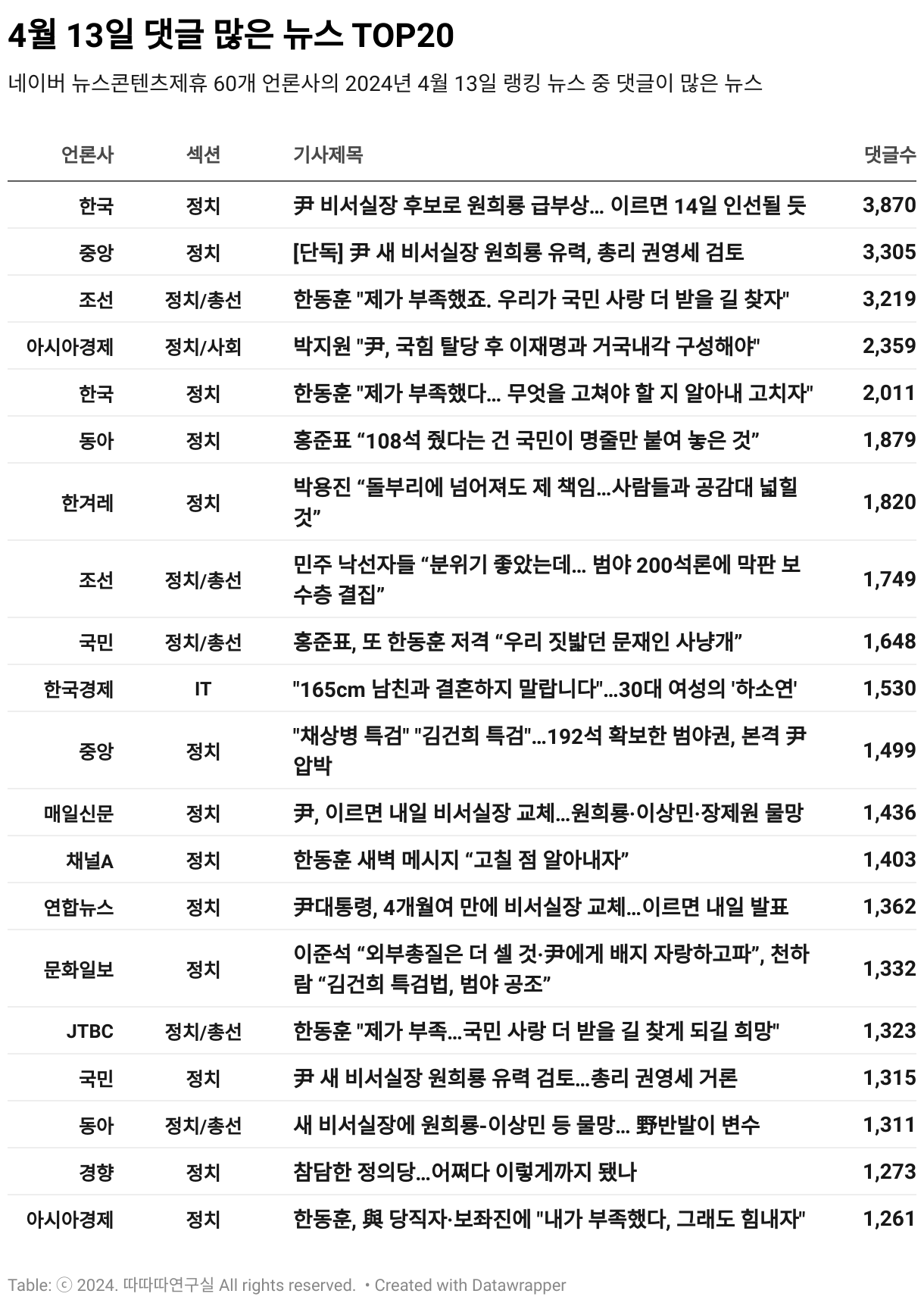 *데이터 수집 기간 : 2024년 4월 14일 *데이터 수집 대상 : 네이버 뉴스콘텐츠제휴 60개 언론사. 종합일간지 10개(경향신문, 국민일보, 동아일보, 문화일보, 서울신문, 세계일보, 조선일보, 중앙일보, 한겨레신문, 한국일보), 방송/통신사 14개(뉴스1, 뉴시스, 연합뉴스, 연합뉴스TV, 채널A, 한국경제TV, JTBC, KBS, MBC, MBN, SBS, SBS BIZ, TV조선, YTN), 경제지 11개(매일경제, 머니투데이, 비즈워치, 서울경제, 아시아경제, 이데일리, 조선비즈, 조세일보, 파이낸셜뉴스, 한국경제, 헤럴드경제) 인터넷 8개(노컷뉴스, 더팩트, 데일리안, 머니S, 미디어오늘, 아이뉴스24, 오마이뉴스, 프레시안), IT 5개(디지털데일리,디지털타임스, 블로터, 전자신문, 지디넷코리아), 지역 12개(강원도민일보, 강원일보, 경기일보, 국제신문, 대구MBC, 대전일보, 매일신문, 부산일보, 전주MBC, CJB청주방송, JIBS, kbc광주방송)