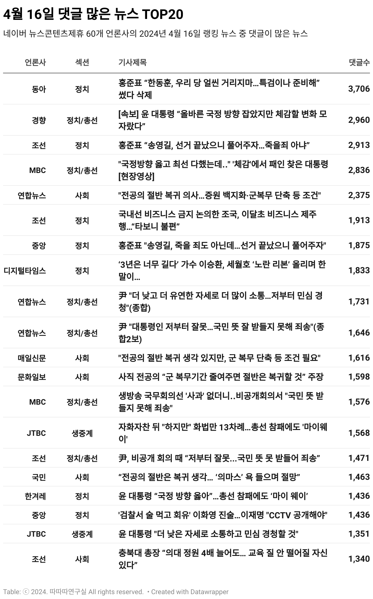 *데이터 수집 기간 : 2024년 4월 17일 *데이터 수집 대상 : 네이버 뉴스콘텐츠제휴 60개 언론사. 종합일간지 10개(경향신문, 국민일보, 동아일보, 문화일보, 서울신문, 세계일보, 조선일보, 중앙일보, 한겨레신문, 한국일보), 방송/통신사 14개(뉴스1, 뉴시스, 연합뉴스, 연합뉴스TV, 채널A, 한국경제TV, JTBC, KBS, MBC, MBN, SBS, SBS BIZ, TV조선, YTN), 경제지 11개(매일경제, 머니투데이, 비즈워치, 서울경제, 아시아경제, 이데일리, 조선비즈, 조세일보, 파이낸셜뉴스, 한국경제, 헤럴드경제) 인터넷 8개(노컷뉴스, 더팩트, 데일리안, 머니S, 미디어오늘, 아이뉴스24, 오마이뉴스, 프레시안), IT 5개(디지털데일리,디지털타임스, 블로터, 전자신문, 지디넷코리아), 지역 12개(강원도민일보, 강원일보, 경기일보, 국제신문, 대구MBC, 대전일보, 매일신문, 부산일보, 전주MBC, CJB청주방송, JIBS, kbc광주방송)