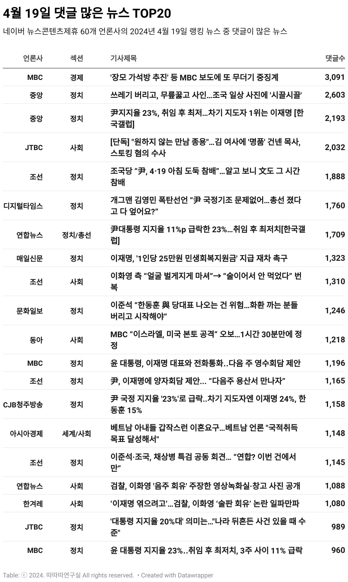*데이터 수집 기간 : 2024년 4월 20일 *데이터 수집 대상 : 네이버 뉴스콘텐츠제휴 60개 언론사. 종합일간지 10개(경향신문, 국민일보, 동아일보, 문화일보, 서울신문, 세계일보, 조선일보, 중앙일보, 한겨레신문, 한국일보), 방송/통신사 14개(뉴스1, 뉴시스, 연합뉴스, 연합뉴스TV, 채널A, 한국경제TV, JTBC, KBS, MBC, MBN, SBS, SBS BIZ, TV조선, YTN), 경제지 11개(매일경제, 머니투데이, 비즈워치, 서울경제, 아시아경제, 이데일리, 조선비즈, 조세일보, 파이낸셜뉴스, 한국경제, 헤럴드경제) 인터넷 8개(노컷뉴스, 더팩트, 데일리안, 머니S, 미디어오늘, 아이뉴스24, 오마이뉴스, 프레시안), IT 5개(디지털데일리,디지털타임스, 블로터, 전자신문, 지디넷코리아), 지역 12개(강원도민일보, 강원일보, 경기일보, 국제신문, 대구MBC, 대전일보, 매일신문, 부산일보, 전주MBC, CJB청주방송, JIBS, kbc광주방송)