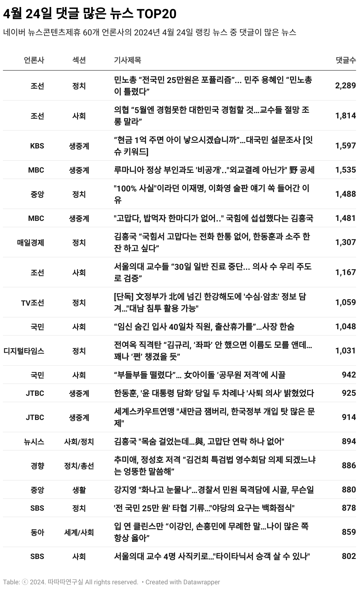 *데이터 수집 기간 : 2024년 4월 25일 *데이터 수집 대상 : 네이버 뉴스콘텐츠제휴 60개 언론사. 종합일간지 10개(경향신문, 국민일보, 동아일보, 문화일보, 서울신문, 세계일보, 조선일보, 중앙일보, 한겨레신문, 한국일보), 방송/통신사 14개(뉴스1, 뉴시스, 연합뉴스, 연합뉴스TV, 채널A, 한국경제TV, JTBC, KBS, MBC, MBN, SBS, SBS BIZ, TV조선, YTN), 경제지 11개(매일경제, 머니투데이, 비즈워치, 서울경제, 아시아경제, 이데일리, 조선비즈, 조세일보, 파이낸셜뉴스, 한국경제, 헤럴드경제) 인터넷 8개(노컷뉴스, 더팩트, 데일리안, 머니S, 미디어오늘, 아이뉴스24, 오마이뉴스, 프레시안), IT 5개(디지털데일리,디지털타임스, 블로터, 전자신문, 지디넷코리아), 지역 12개(강원도민일보, 강원일보, 경기일보, 국제신문, 대구MBC, 대전일보, 매일신문, 부산일보, 전주MBC, CJB청주방송, JIBS, kbc광주방송)