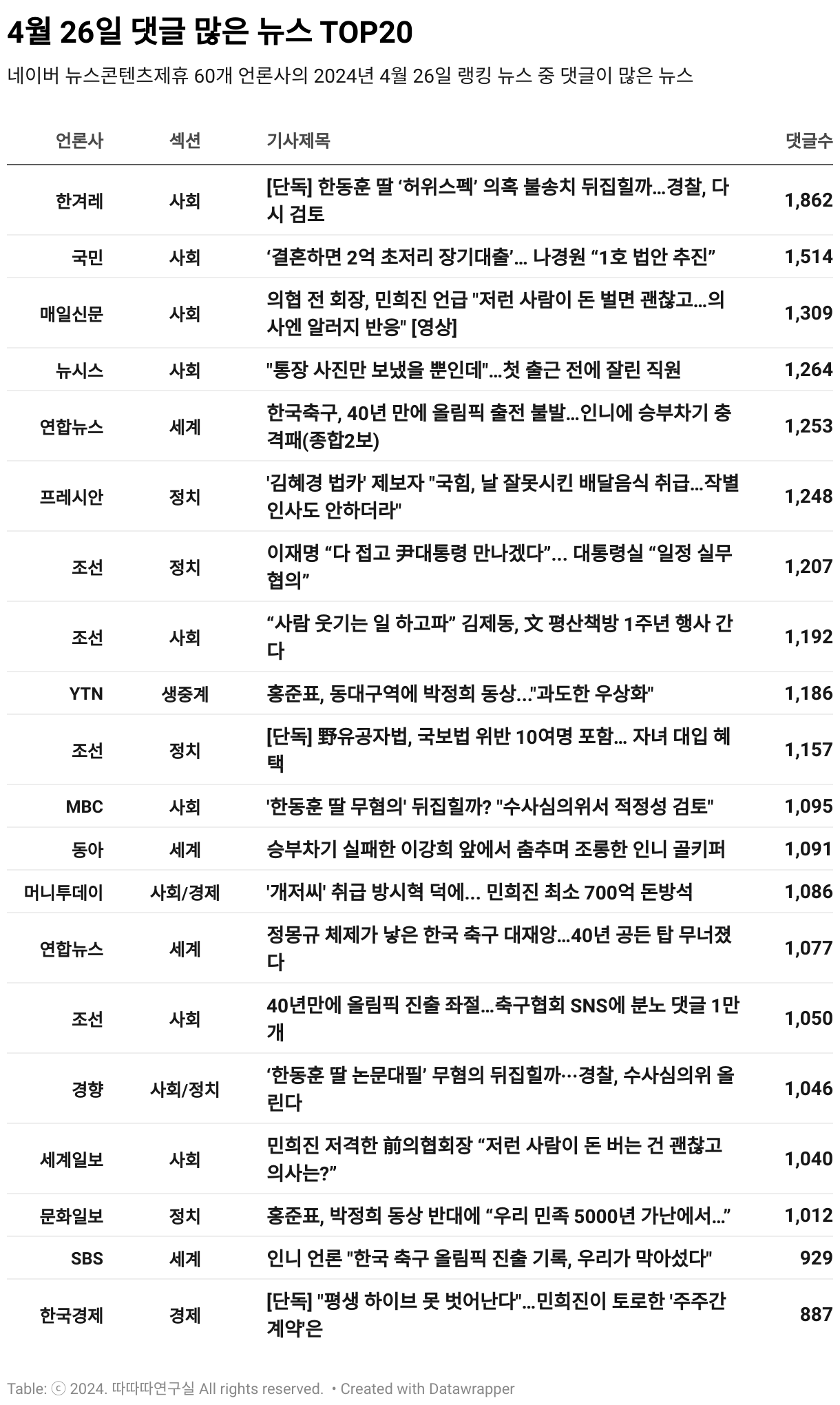 *데이터 수집 기간 : 2024년 4월 27일 *데이터 수집 대상 : 네이버 뉴스콘텐츠제휴 60개 언론사. 종합일간지 10개(경향신문, 국민일보, 동아일보, 문화일보, 서울신문, 세계일보, 조선일보, 중앙일보, 한겨레신문, 한국일보), 방송/통신사 14개(뉴스1, 뉴시스, 연합뉴스, 연합뉴스TV, 채널A, 한국경제TV, JTBC, KBS, MBC, MBN, SBS, SBS BIZ, TV조선, YTN), 경제지 11개(매일경제, 머니투데이, 비즈워치, 서울경제, 아시아경제, 이데일리, 조선비즈, 조세일보, 파이낸셜뉴스, 한국경제, 헤럴드경제) 인터넷 8개(노컷뉴스, 더팩트, 데일리안, 머니S, 미디어오늘, 아이뉴스24, 오마이뉴스, 프레시안), IT 5개(디지털데일리,디지털타임스, 블로터, 전자신문, 지디넷코리아), 지역 12개(강원도민일보, 강원일보, 경기일보, 국제신문, 대구MBC, 대전일보, 매일신문, 부산일보, 전주MBC, CJB청주방송, JIBS, kbc광주방송)
