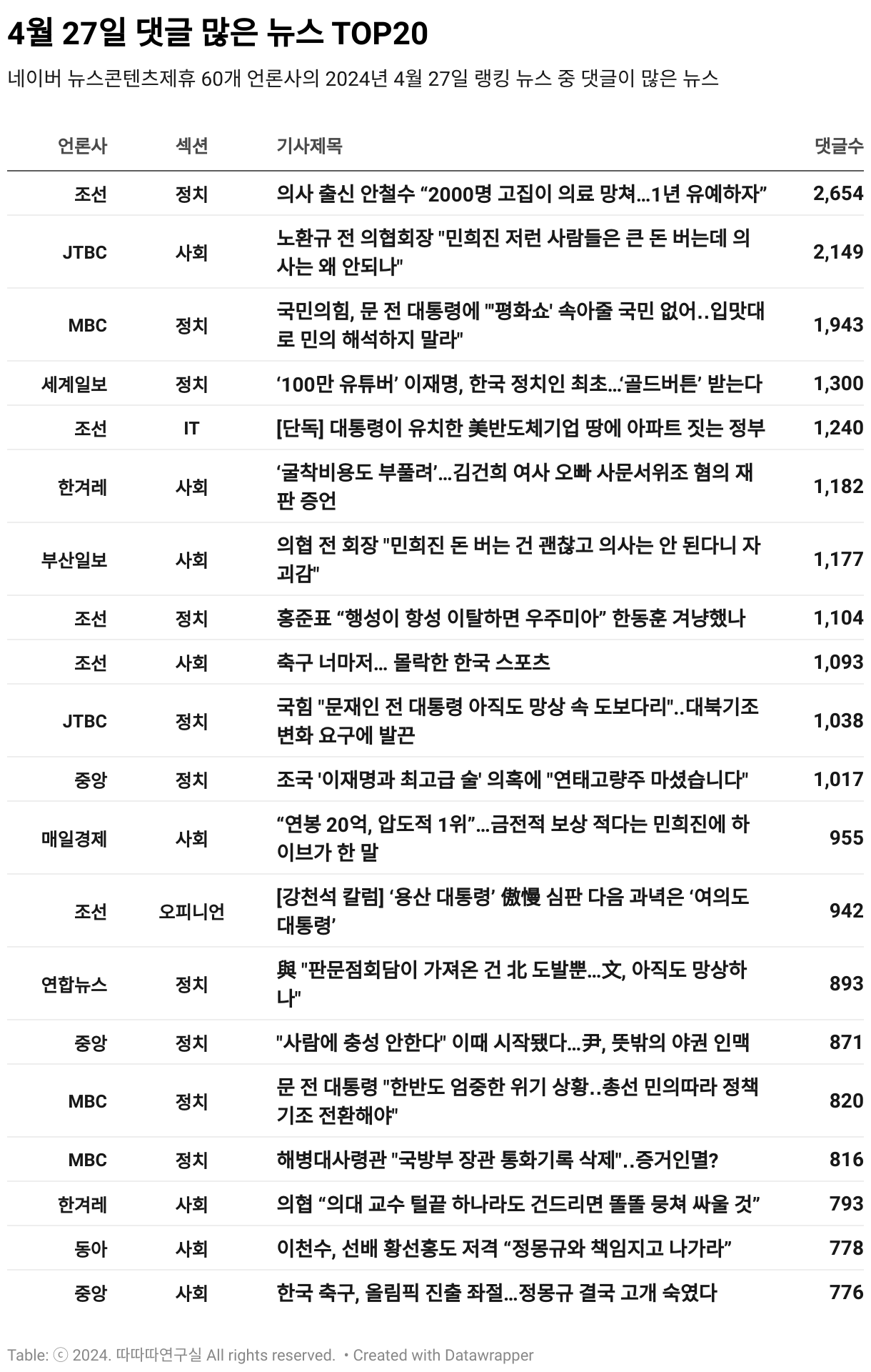 *데이터 수집 기간 : 2024년 4월 28일 *데이터 수집 대상 : 네이버 뉴스콘텐츠제휴 60개 언론사. 종합일간지 10개(경향신문, 국민일보, 동아일보, 문화일보, 서울신문, 세계일보, 조선일보, 중앙일보, 한겨레신문, 한국일보), 방송/통신사 14개(뉴스1, 뉴시스, 연합뉴스, 연합뉴스TV, 채널A, 한국경제TV, JTBC, KBS, MBC, MBN, SBS, SBS BIZ, TV조선, YTN), 경제지 11개(매일경제, 머니투데이, 비즈워치, 서울경제, 아시아경제, 이데일리, 조선비즈, 조세일보, 파이낸셜뉴스, 한국경제, 헤럴드경제) 인터넷 8개(노컷뉴스, 더팩트, 데일리안, 머니S, 미디어오늘, 아이뉴스24, 오마이뉴스, 프레시안), IT 5개(디지털데일리,디지털타임스, 블로터, 전자신문, 지디넷코리아), 지역 12개(강원도민일보, 강원일보, 경기일보, 국제신문, 대구MBC, 대전일보, 매일신문, 부산일보, 전주MBC, CJB청주방송, JIBS, kbc광주방송)