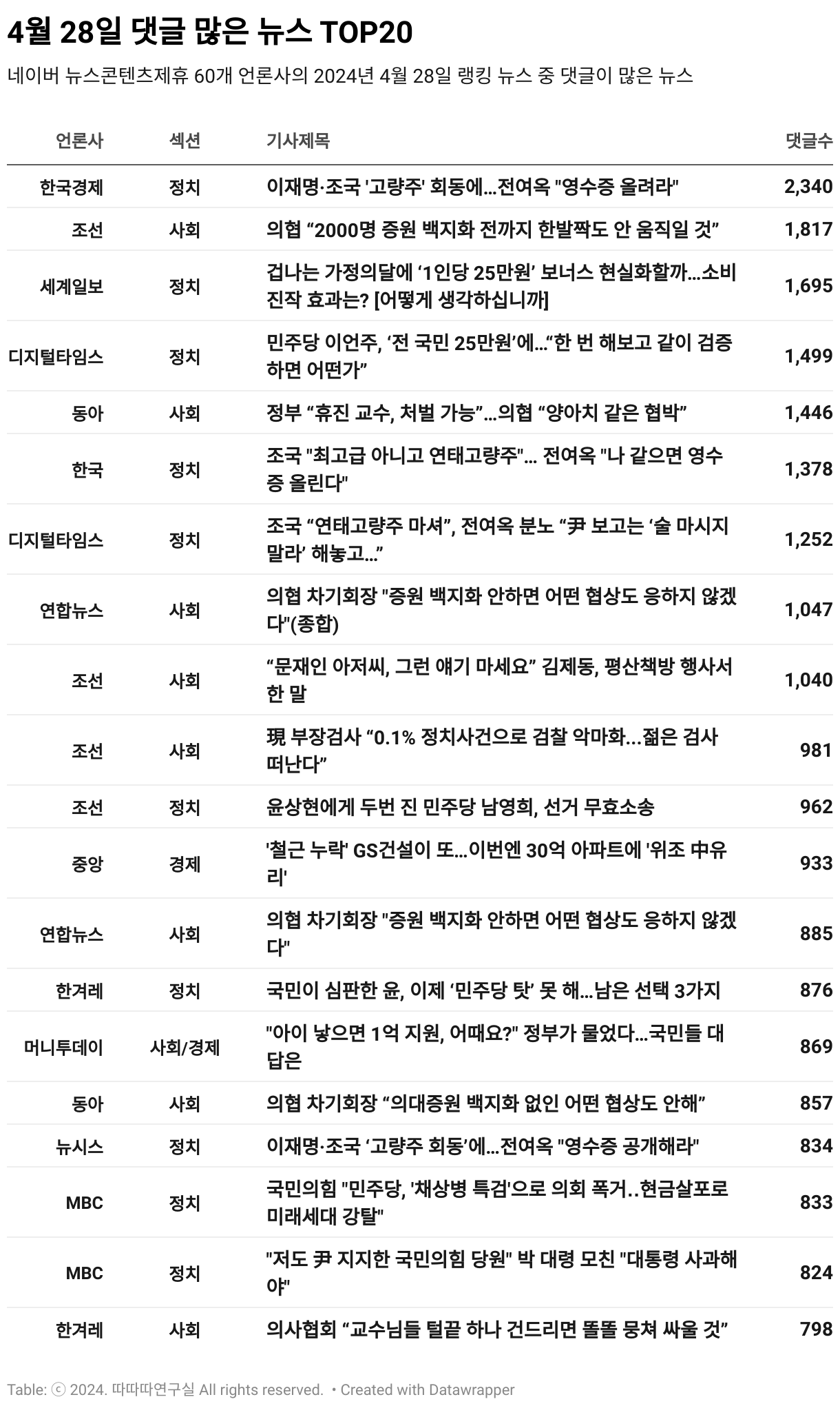 *데이터 수집 기간 : 2024년 4월 29일 *데이터 수집 대상 : 네이버 뉴스콘텐츠제휴 60개 언론사. 종합일간지 10개(경향신문, 국민일보, 동아일보, 문화일보, 서울신문, 세계일보, 조선일보, 중앙일보, 한겨레신문, 한국일보), 방송/통신사 14개(뉴스1, 뉴시스, 연합뉴스, 연합뉴스TV, 채널A, 한국경제TV, JTBC, KBS, MBC, MBN, SBS, SBS BIZ, TV조선, YTN), 경제지 11개(매일경제, 머니투데이, 비즈워치, 서울경제, 아시아경제, 이데일리, 조선비즈, 조세일보, 파이낸셜뉴스, 한국경제, 헤럴드경제) 인터넷 8개(노컷뉴스, 더팩트, 데일리안, 머니S, 미디어오늘, 아이뉴스24, 오마이뉴스, 프레시안), IT 5개(디지털데일리,디지털타임스, 블로터, 전자신문, 지디넷코리아), 지역 12개(강원도민일보, 강원일보, 경기일보, 국제신문, 대구MBC, 대전일보, 매일신문, 부산일보, 전주MBC, CJB청주방송, JIBS, kbc광주방송)