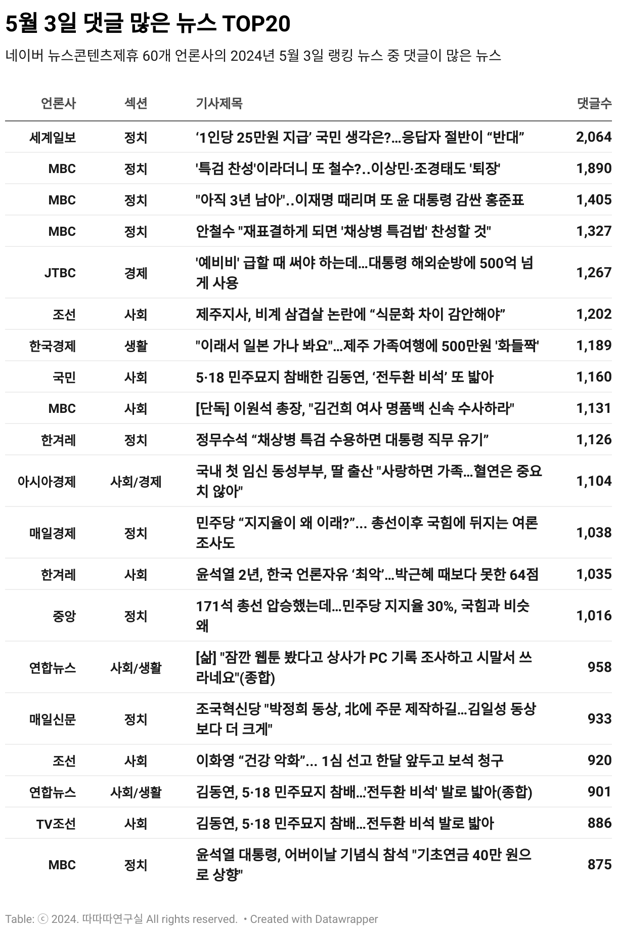 *데이터 수집 기간 : 2024년 5월 4일 *데이터 수집 대상 : 네이버 뉴스콘텐츠제휴 60개 언론사. 종합일간지 10개(경향신문, 국민일보, 동아일보, 문화일보, 서울신문, 세계일보, 조선일보, 중앙일보, 한겨레신문, 한국일보), 방송/통신사 14개(뉴스1, 뉴시스, 연합뉴스, 연합뉴스TV, 채널A, 한국경제TV, JTBC, KBS, MBC, MBN, SBS, SBS BIZ, TV조선, YTN), 경제지 11개(매일경제, 머니투데이, 비즈워치, 서울경제, 아시아경제, 이데일리, 조선비즈, 조세일보, 파이낸셜뉴스, 한국경제, 헤럴드경제) 인터넷 8개(노컷뉴스, 더팩트, 데일리안, 머니S, 미디어오늘, 아이뉴스24, 오마이뉴스, 프레시안), IT 5개(디지털데일리,디지털타임스, 블로터, 전자신문, 지디넷코리아), 지역 12개(강원도민일보, 강원일보, 경기일보, 국제신문, 대구MBC, 대전일보, 매일신문, 부산일보, 전주MBC, CJB청주방송, JIBS, kbc광주방송)