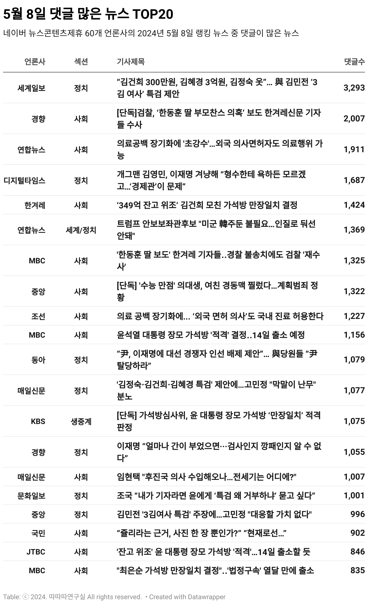 *데이터 수집 기간 : 2024년 5월 9일 *데이터 수집 대상 : 네이버 뉴스콘텐츠제휴 60개 언론사. 종합일간지 10개(경향신문, 국민일보, 동아일보, 문화일보, 서울신문, 세계일보, 조선일보, 중앙일보, 한겨레신문, 한국일보), 방송/통신사 14개(뉴스1, 뉴시스, 연합뉴스, 연합뉴스TV, 채널A, 한국경제TV, JTBC, KBS, MBC, MBN, SBS, SBS BIZ, TV조선, YTN), 경제지 11개(매일경제, 머니투데이, 비즈워치, 서울경제, 아시아경제, 이데일리, 조선비즈, 조세일보, 파이낸셜뉴스, 한국경제, 헤럴드경제) 인터넷 8개(노컷뉴스, 더팩트, 데일리안, 머니S, 미디어오늘, 아이뉴스24, 오마이뉴스, 프레시안), IT 5개(디지털데일리,디지털타임스, 블로터, 전자신문, 지디넷코리아), 지역 12개(강원도민일보, 강원일보, 경기일보, 국제신문, 대구MBC, 대전일보, 매일신문, 부산일보, 전주MBC, CJB청주방송, JIBS, kbc광주방송)