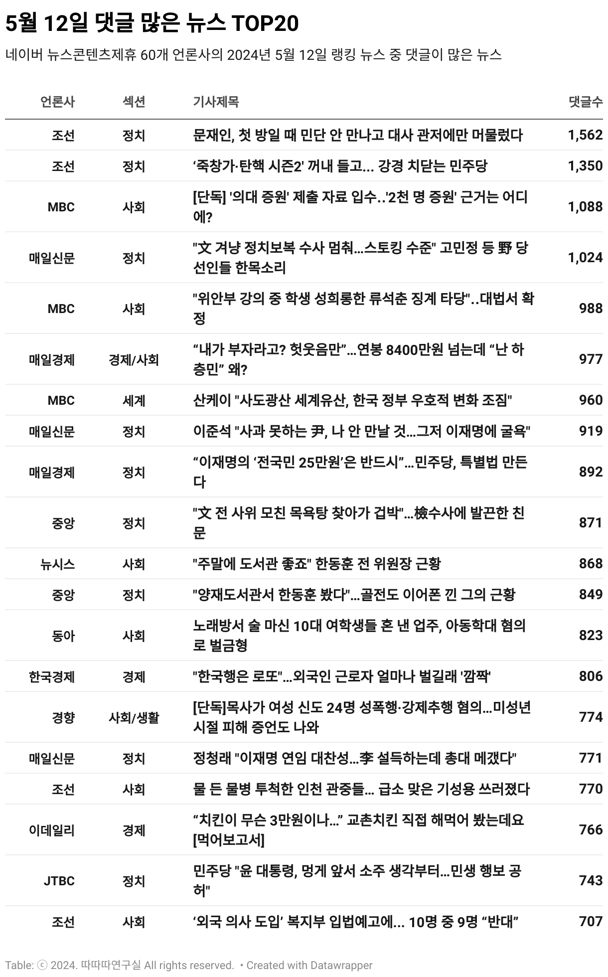 *데이터 수집 기간 : 2024년 5월 13일 *데이터 수집 대상 : 네이버 뉴스콘텐츠제휴 60개 언론사. 종합일간지 10개(경향신문, 국민일보, 동아일보, 문화일보, 서울신문, 세계일보, 조선일보, 중앙일보, 한겨레신문, 한국일보), 방송/통신사 14개(뉴스1, 뉴시스, 연합뉴스, 연합뉴스TV, 채널A, 한국경제TV, JTBC, KBS, MBC, MBN, SBS, SBS BIZ, TV조선, YTN), 경제지 11개(매일경제, 머니투데이, 비즈워치, 서울경제, 아시아경제, 이데일리, 조선비즈, 조세일보, 파이낸셜뉴스, 한국경제, 헤럴드경제) 인터넷 8개(노컷뉴스, 더팩트, 데일리안, 머니S, 미디어오늘, 아이뉴스24, 오마이뉴스, 프레시안), IT 5개(디지털데일리,디지털타임스, 블로터, 전자신문, 지디넷코리아), 지역 12개(강원도민일보, 강원일보, 경기일보, 국제신문, 대구MBC, 대전일보, 매일신문, 부산일보, 전주MBC, CJB청주방송, JIBS, kbc광주방송)