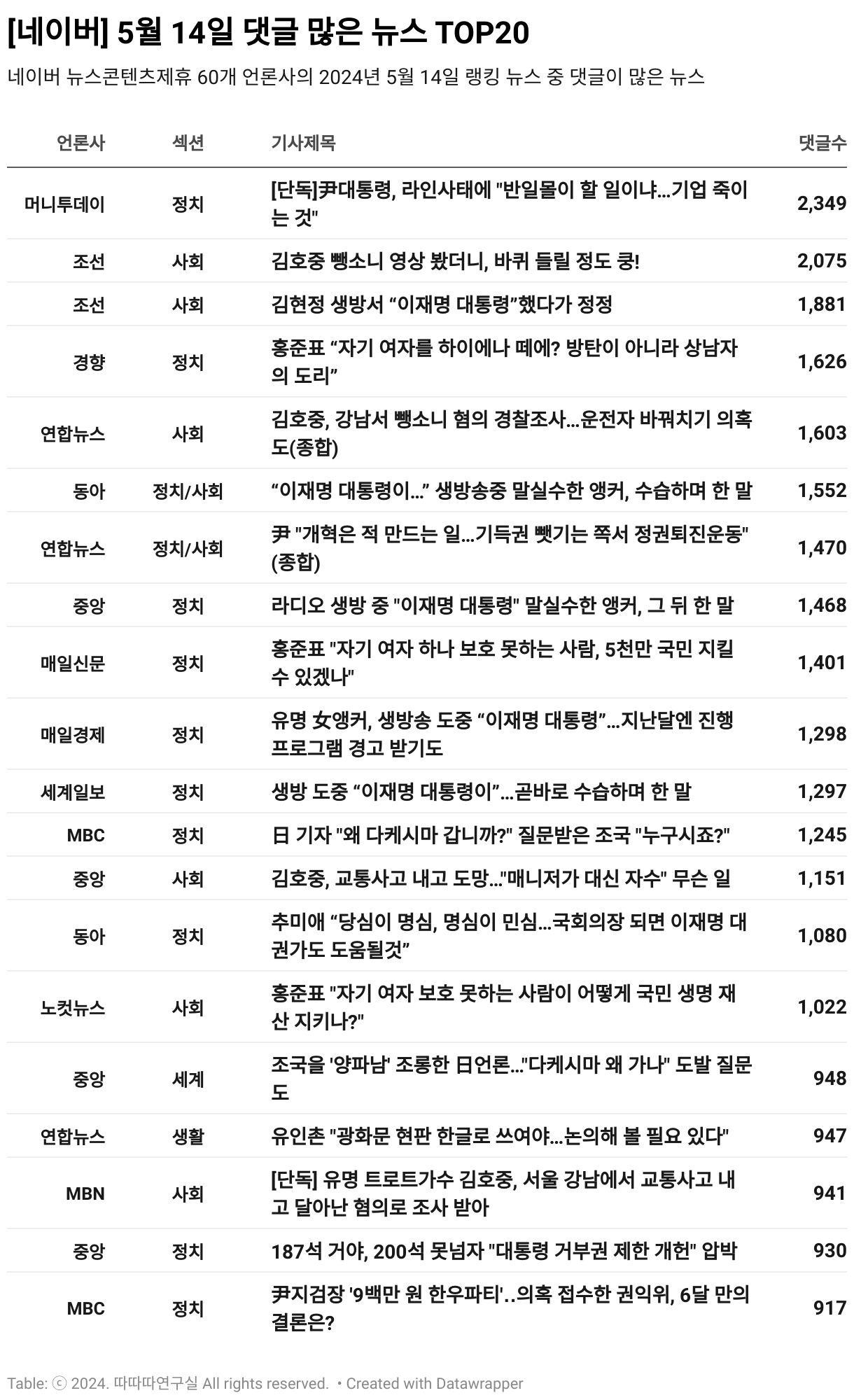 *데이터 수집 기간 : 2024년 5월 15일 *데이터 수집 대상 : 네이버 뉴스콘텐츠제휴 60개 언론사. 종합일간지 10개(경향신문, 국민일보, 동아일보, 문화일보, 서울신문, 세계일보, 조선일보, 중앙일보, 한겨레신문, 한국일보), 방송/통신사 14개(뉴스1, 뉴시스, 연합뉴스, 연합뉴스TV, 채널A, 한국경제TV, JTBC, KBS, MBC, MBN, SBS, SBS BIZ, TV조선, YTN), 경제지 11개(매일경제, 머니투데이, 비즈워치, 서울경제, 아시아경제, 이데일리, 조선비즈, 조세일보, 파이낸셜뉴스, 한국경제, 헤럴드경제) 인터넷 8개(노컷뉴스, 더팩트, 데일리안, 머니S, 미디어오늘, 아이뉴스24, 오마이뉴스, 프레시안), IT 5개(디지털데일리,디지털타임스, 블로터, 전자신문, 지디넷코리아), 지역 12개(강원도민일보, 강원일보, 경기일보, 국제신문, 대구MBC, 대전일보, 매일신문, 부산일보, 전주MBC, CJB청주방송, JIBS, kbc광주방송)