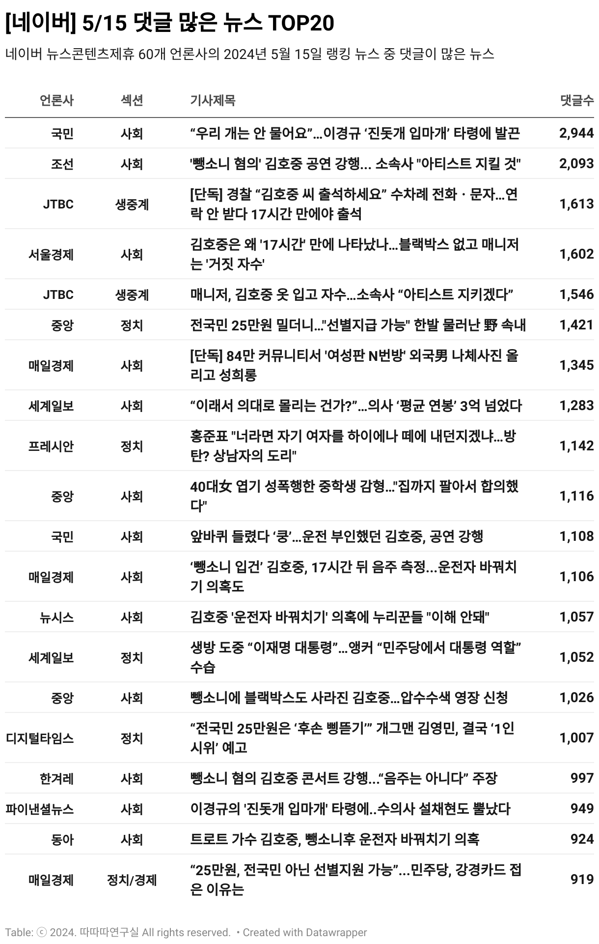 *데이터 수집 기간 : 2024년 5월 16일 *데이터 수집 대상 : 네이버 뉴스콘텐츠제휴 60개 언론사. 종합일간지 10개(경향신문, 국민일보, 동아일보, 문화일보, 서울신문, 세계일보, 조선일보, 중앙일보, 한겨레신문, 한국일보), 방송/통신사 14개(뉴스1, 뉴시스, 연합뉴스, 연합뉴스TV, 채널A, 한국경제TV, JTBC, KBS, MBC, MBN, SBS, SBS BIZ, TV조선, YTN), 경제지 11개(매일경제, 머니투데이, 비즈워치, 서울경제, 아시아경제, 이데일리, 조선비즈, 조세일보, 파이낸셜뉴스, 한국경제, 헤럴드경제) 인터넷 8개(노컷뉴스, 더팩트, 데일리안, 머니S, 미디어오늘, 아이뉴스24, 오마이뉴스, 프레시안), IT 5개(디지털데일리,디지털타임스, 블로터, 전자신문, 지디넷코리아), 지역 12개(강원도민일보, 강원일보, 경기일보, 국제신문, 대구MBC, 대전일보, 매일신문, 부산일보, 전주MBC, CJB청주방송, JIBS, kbc광주방송)