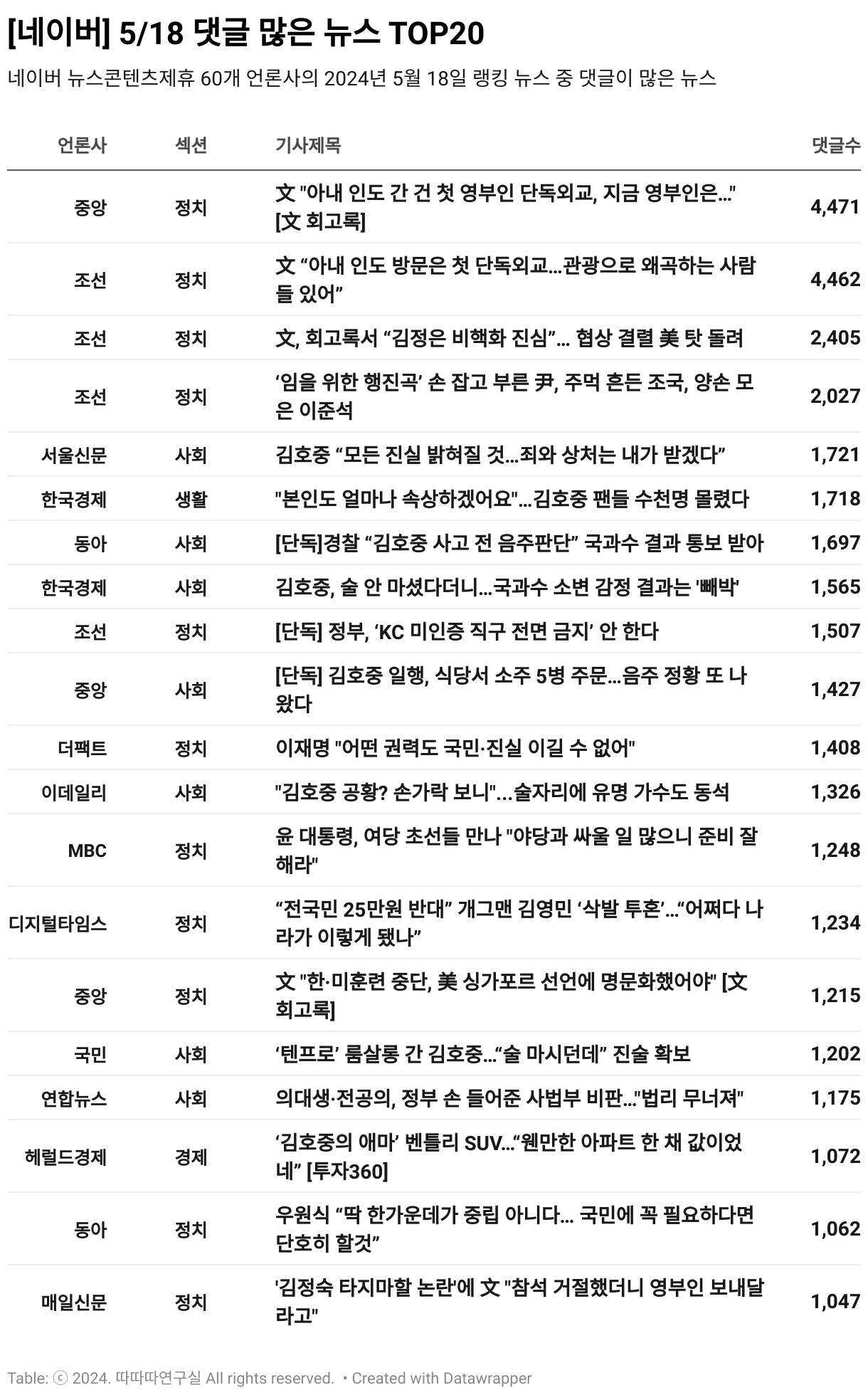 *데이터 수집 기간 : 2024년 5월 19일 *데이터 수집 대상 : 네이버 뉴스콘텐츠제휴 60개 언론사. 종합일간지 10개(경향신문, 국민일보, 동아일보, 문화일보, 서울신문, 세계일보, 조선일보, 중앙일보, 한겨레신문, 한국일보), 방송/통신사 14개(뉴스1, 뉴시스, 연합뉴스, 연합뉴스TV, 채널A, 한국경제TV, JTBC, KBS, MBC, MBN, SBS, SBS BIZ, TV조선, YTN), 경제지 11개(매일경제, 머니투데이, 비즈워치, 서울경제, 아시아경제, 이데일리, 조선비즈, 조세일보, 파이낸셜뉴스, 한국경제, 헤럴드경제) 인터넷 8개(노컷뉴스, 더팩트, 데일리안, 머니S, 미디어오늘, 아이뉴스24, 오마이뉴스, 프레시안), IT 5개(디지털데일리,디지털타임스, 블로터, 전자신문, 지디넷코리아), 지역 12개(강원도민일보, 강원일보, 경기일보, 국제신문, 대구MBC, 대전일보, 매일신문, 부산일보, 전주MBC, CJB청주방송, JIBS, kbc광주방송)