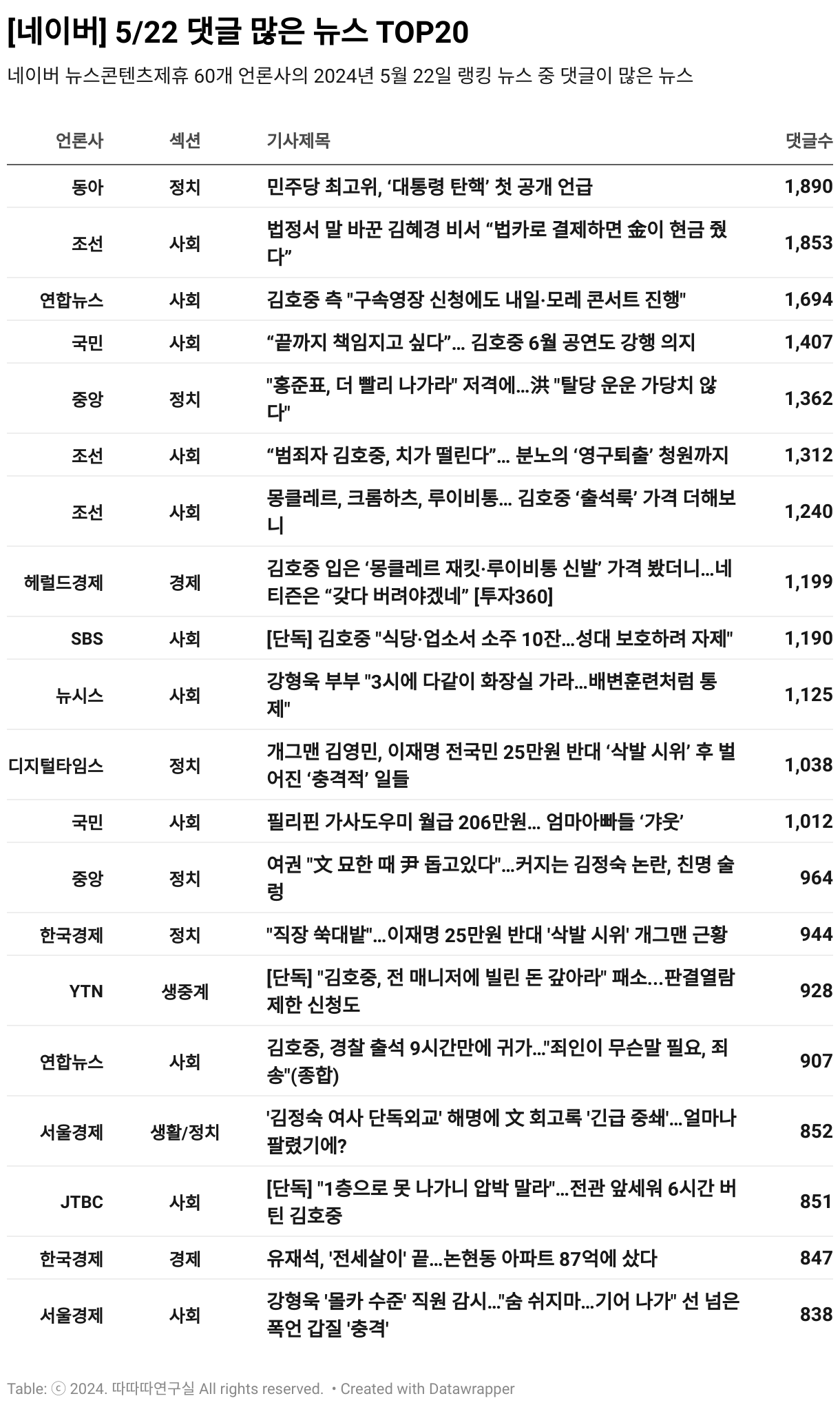 *데이터 수집 기간 : 2024년 5월 23일 *데이터 수집 대상 : 네이버 뉴스콘텐츠제휴 60개 언론사. 종합일간지 10개(경향신문, 국민일보, 동아일보, 문화일보, 서울신문, 세계일보, 조선일보, 중앙일보, 한겨레신문, 한국일보), 방송/통신사 14개(뉴스1, 뉴시스, 연합뉴스, 연합뉴스TV, 채널A, 한국경제TV, JTBC, KBS, MBC, MBN, SBS, SBS BIZ, TV조선, YTN), 경제지 11개(매일경제, 머니투데이, 비즈워치, 서울경제, 아시아경제, 이데일리, 조선비즈, 조세일보, 파이낸셜뉴스, 한국경제(유튜브제외), 헤럴드경제) 인터넷 8개(노컷뉴스, 더팩트, 데일리안, 머니S, 미디어오늘, 아이뉴스24, 오마이뉴스, 프레시안), IT 5개(디지털데일리,디지털타임스, 블로터, 전자신문, 지디넷코리아), 지역 12개(강원도민일보, 강원일보, 경기일보, 국제신문, 대구MBC, 대전일보, 매일신문, 부산일보, 전주MBC, CJB청주방송, JIBS, kbc광주방송)