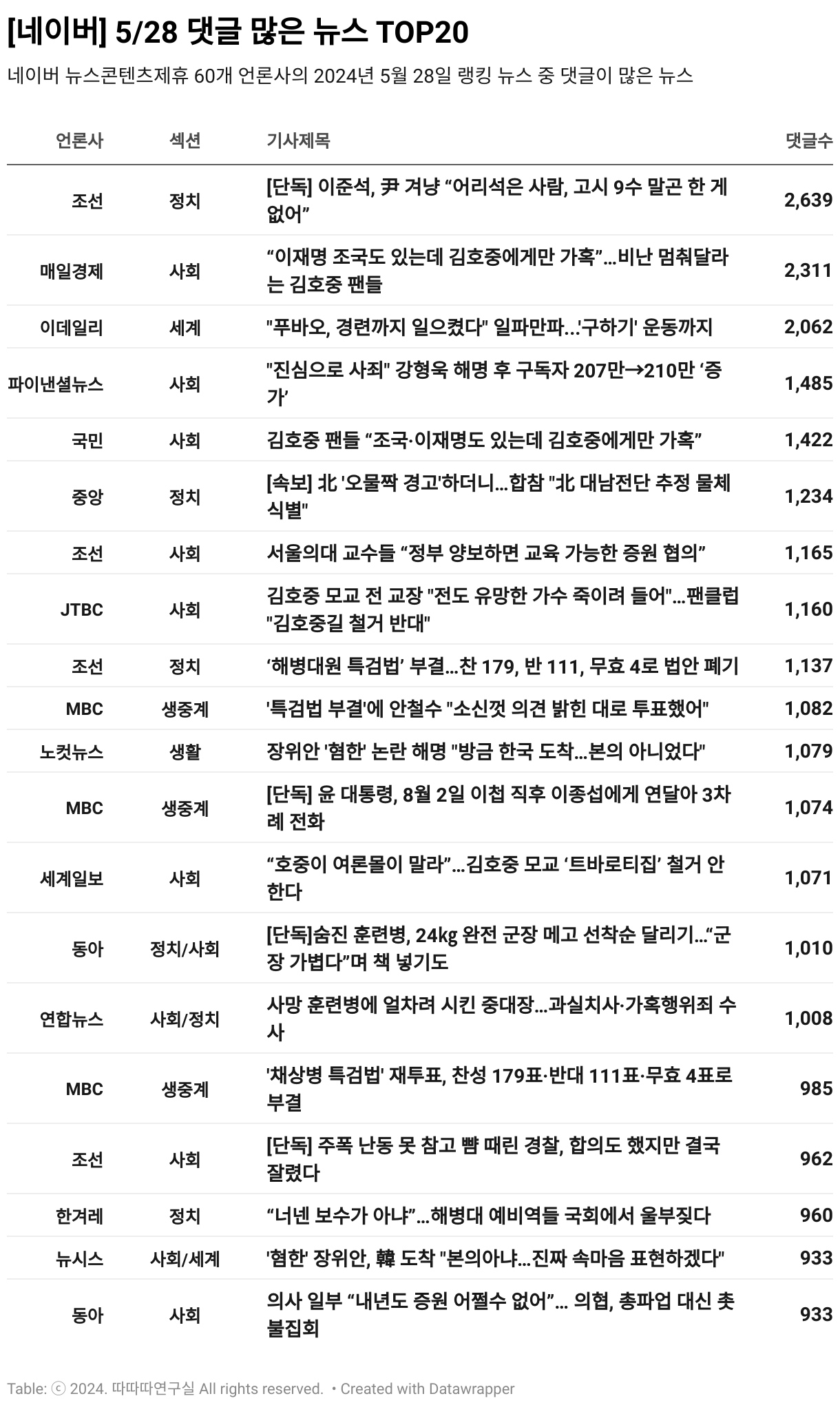 *데이터 수집 기간 : 2024년 5월 29일 *데이터 수집 대상 : 네이버 뉴스콘텐츠제휴 60개 언론사. 종합일간지 10개(경향신문, 국민일보, 동아일보, 문화일보, 서울신문, 세계일보, 조선일보, 중앙일보, 한겨레신문, 한국일보), 방송/통신사 14개(뉴스1, 뉴시스, 연합뉴스, 연합뉴스TV, 채널A, 한국경제TV, JTBC, KBS, MBC, MBN, SBS, SBS BIZ, TV조선, YTN), 경제지 11개(매일경제, 머니투데이, 비즈워치, 서울경제, 아시아경제, 이데일리, 조선비즈, 조세일보, 파이낸셜뉴스, 한국경제(유튜브제외), 헤럴드경제) 인터넷 8개(노컷뉴스, 더팩트, 데일리안, 머니S, 미디어오늘, 아이뉴스24, 오마이뉴스, 프레시안), IT 5개(디지털데일리,디지털타임스, 블로터, 전자신문, 지디넷코리아), 지역 12개(강원도민일보, 강원일보, 경기일보, 국제신문, 대구MBC, 대전일보, 매일신문, 부산일보, 전주MBC, CJB청주방송, JIBS, kbc광주방송)