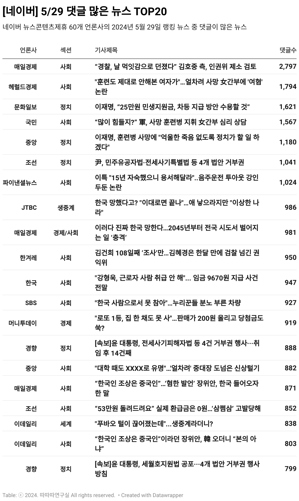 *데이터 수집 기간 : 2024년 5월 30일 *데이터 수집 대상 : 네이버 뉴스콘텐츠제휴 60개 언론사. 종합일간지 10개(경향신문, 국민일보, 동아일보, 문화일보, 서울신문, 세계일보, 조선일보, 중앙일보, 한겨레신문, 한국일보), 방송/통신사 14개(뉴스1, 뉴시스, 연합뉴스, 연합뉴스TV, 채널A, 한국경제TV, JTBC, KBS, MBC, MBN, SBS, SBS BIZ, TV조선, YTN), 경제지 11개(매일경제, 머니투데이, 비즈워치, 서울경제, 아시아경제, 이데일리, 조선비즈, 조세일보, 파이낸셜뉴스, 한국경제(유튜브제외), 헤럴드경제) 인터넷 8개(노컷뉴스, 더팩트, 데일리안, 머니S, 미디어오늘, 아이뉴스24, 오마이뉴스, 프레시안), IT 5개(디지털데일리,디지털타임스, 블로터, 전자신문, 지디넷코리아), 지역 12개(강원도민일보, 강원일보, 경기일보, 국제신문, 대구MBC, 대전일보, 매일신문, 부산일보, 전주MBC, CJB청주방송, JIBS, kbc광주방송)