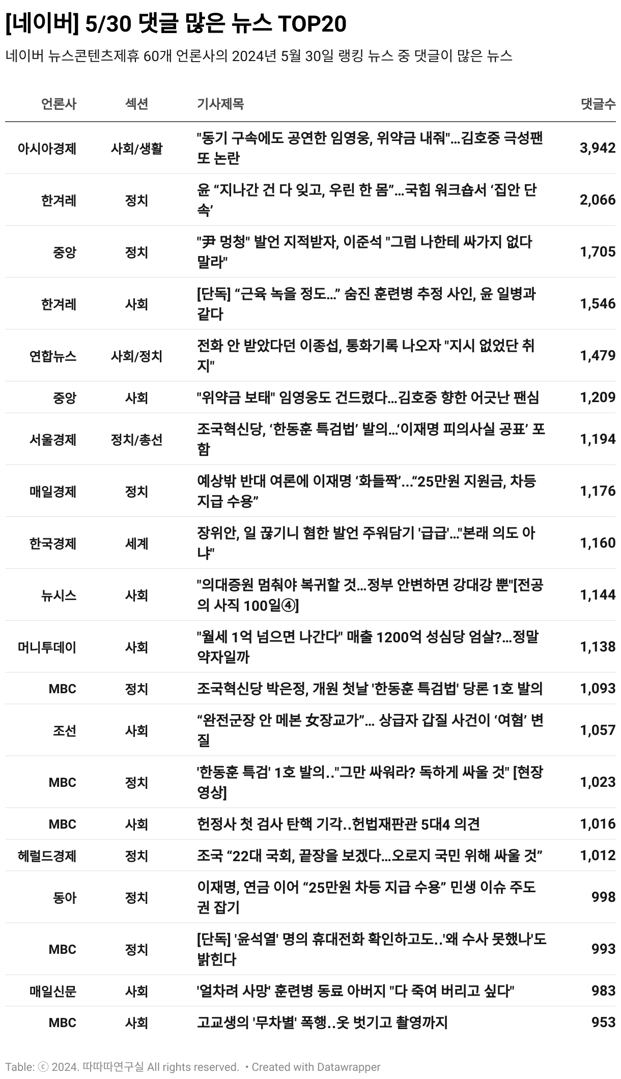 *데이터 수집 기간 : 2024년 5월 31일 *데이터 수집 대상 : 네이버 뉴스콘텐츠제휴 60개 언론사. 종합일간지 10개(경향신문, 국민일보, 동아일보, 문화일보, 서울신문, 세계일보, 조선일보, 중앙일보, 한겨레신문, 한국일보), 방송/통신사 14개(뉴스1, 뉴시스, 연합뉴스, 연합뉴스TV, 채널A, 한국경제TV, JTBC, KBS, MBC, MBN, SBS, SBS BIZ, TV조선, YTN), 경제지 11개(매일경제, 머니투데이, 비즈워치, 서울경제, 아시아경제, 이데일리, 조선비즈, 조세일보, 파이낸셜뉴스, 한국경제(유튜브제외), 헤럴드경제) 인터넷 8개(노컷뉴스, 더팩트, 데일리안, 머니S, 미디어오늘, 아이뉴스24, 오마이뉴스, 프레시안), IT 5개(디지털데일리,디지털타임스, 블로터, 전자신문, 지디넷코리아), 지역 12개(강원도민일보, 강원일보, 경기일보, 국제신문, 대구MBC, 대전일보, 매일신문, 부산일보, 전주MBC, CJB청주방송, JIBS, kbc광주방송)