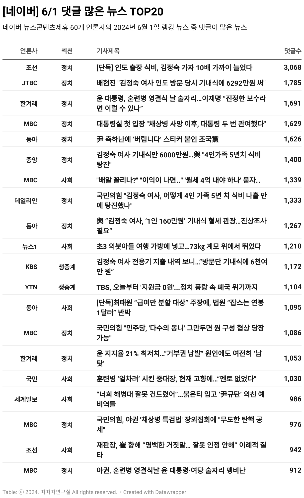 *데이터 수집 기간 : 2024년 6월 2일 *데이터 수집 대상 : 네이버 뉴스콘텐츠제휴 60개 언론사. 종합일간지 10개(경향신문, 국민일보, 동아일보, 문화일보, 서울신문, 세계일보, 조선일보, 중앙일보, 한겨레신문, 한국일보), 방송/통신사 14개(뉴스1, 뉴시스, 연합뉴스, 연합뉴스TV, 채널A, 한국경제TV, JTBC, KBS, MBC, MBN, SBS, SBS BIZ, TV조선, YTN), 경제지 11개(매일경제, 머니투데이, 비즈워치, 서울경제, 아시아경제, 이데일리, 조선비즈, 조세일보, 파이낸셜뉴스, 한국경제(유튜브제외), 헤럴드경제) 인터넷 8개(노컷뉴스, 더팩트, 데일리안, 머니S, 미디어오늘, 아이뉴스24, 오마이뉴스, 프레시안), IT 5개(디지털데일리,디지털타임스, 블로터, 전자신문, 지디넷코리아), 지역 12개(강원도민일보, 강원일보, 경기일보, 국제신문, 대구MBC, 대전일보, 매일신문, 부산일보, 전주MBC, CJB청주방송, JIBS, kbc광주방송)