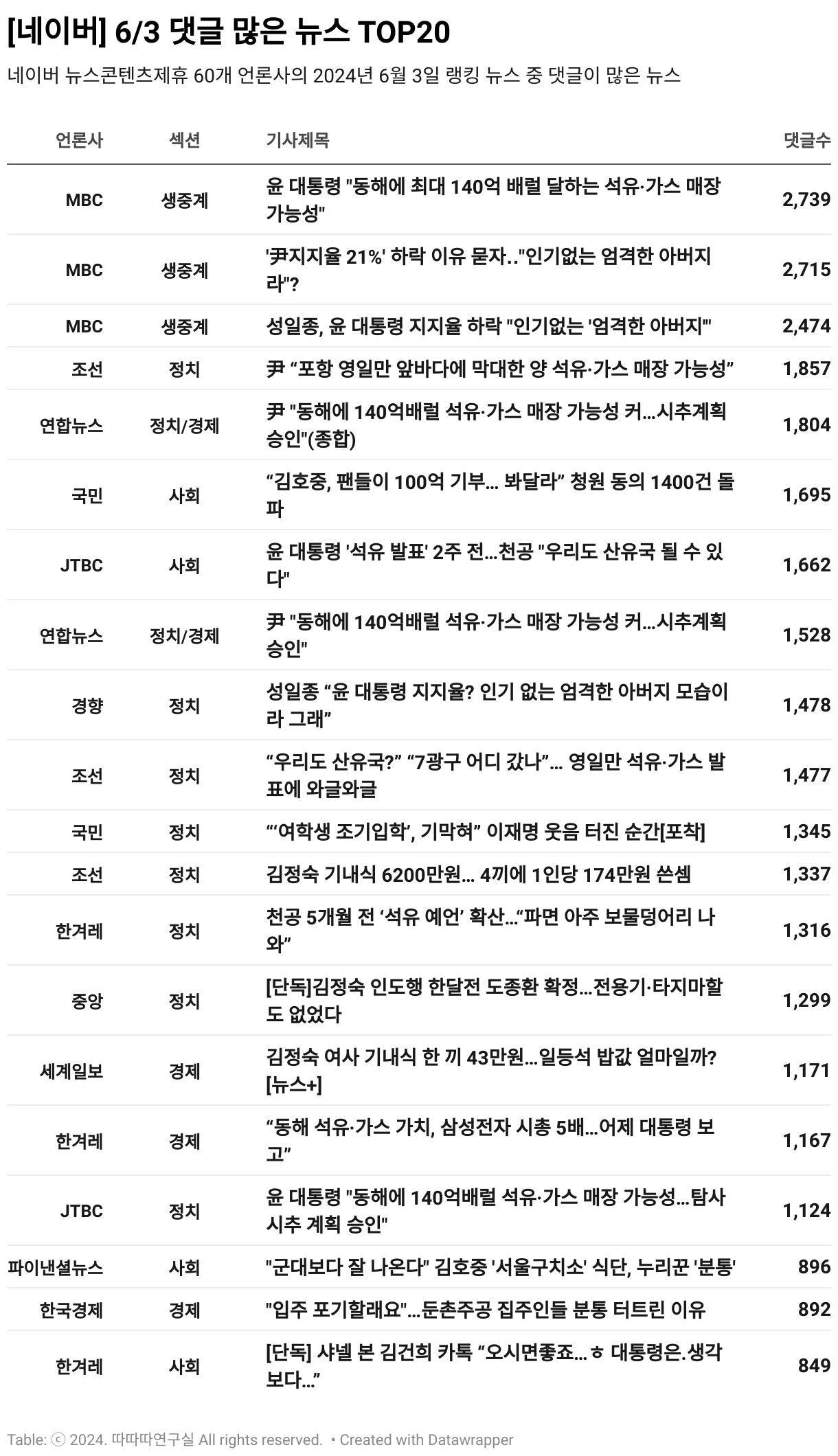 *데이터 수집 기간 : 2024년 6월 3일 *데이터 수집 대상 : 네이버 뉴스콘텐츠제휴 60개 언론사. 종합일간지 10개(경향신문, 국민일보, 동아일보, 문화일보, 서울신문, 세계일보, 조선일보, 중앙일보, 한겨레신문, 한국일보), 방송/통신사 14개(뉴스1, 뉴시스, 연합뉴스, 연합뉴스TV, 채널A, 한국경제TV, JTBC, KBS, MBC, MBN, SBS, SBS BIZ, TV조선, YTN), 경제지 11개(매일경제, 머니투데이, 비즈워치, 서울경제, 아시아경제, 이데일리, 조선비즈, 조세일보, 파이낸셜뉴스, 한국경제(유튜브제외), 헤럴드경제) 인터넷 8개(노컷뉴스, 더팩트, 데일리안, 머니S, 미디어오늘, 아이뉴스24, 오마이뉴스, 프레시안), IT 5개(디지털데일리,디지털타임스, 블로터, 전자신문, 지디넷코리아), 지역 12개(강원도민일보, 강원일보, 경기일보, 국제신문, 대구MBC, 대전일보, 매일신문, 부산일보, 전주MBC, CJB청주방송, JIBS, kbc광주방송)