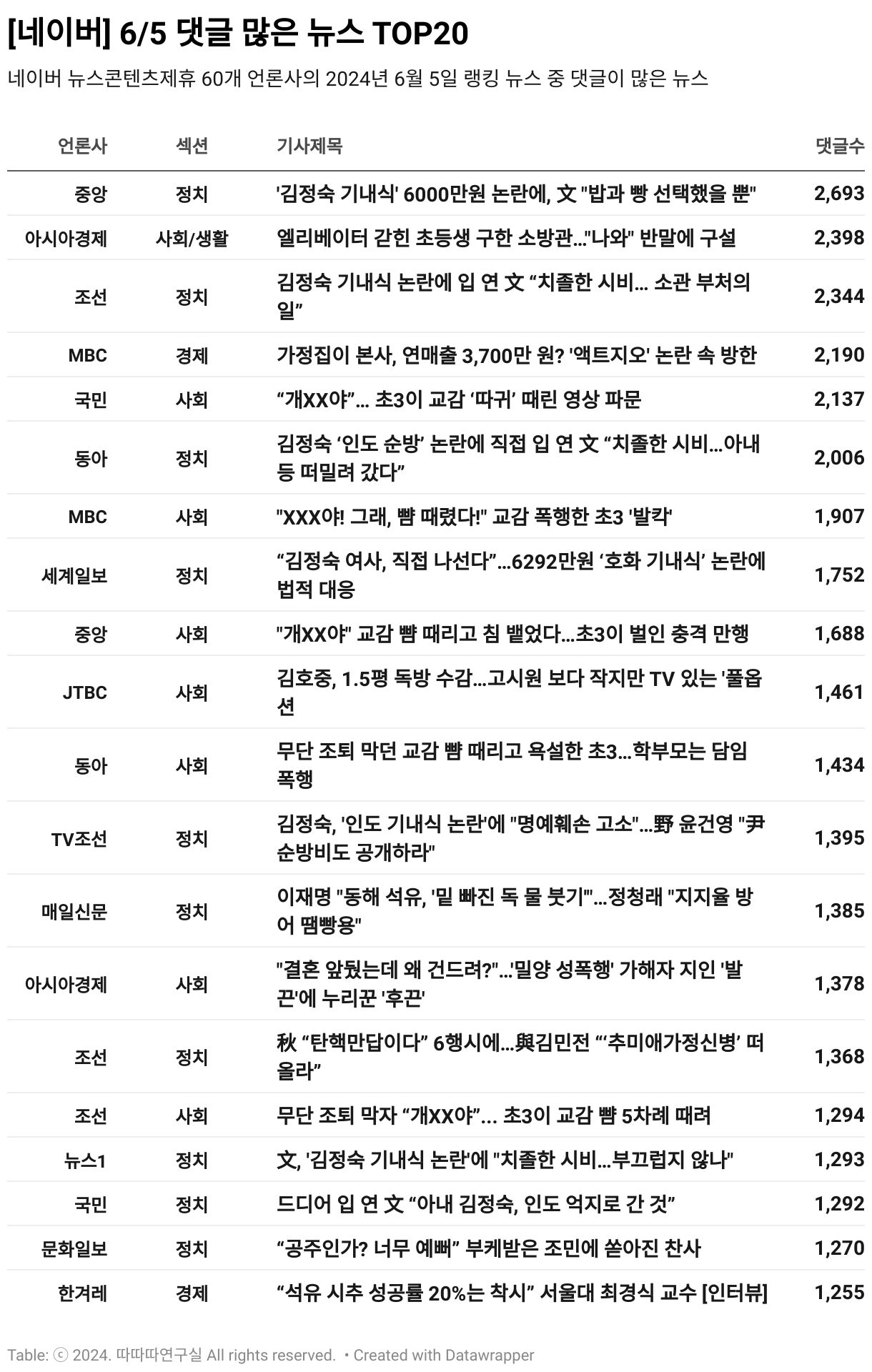 *데이터 수집 기간 : 2024년 6월 6일 *데이터 수집 대상 : 네이버 뉴스콘텐츠제휴 60개 언론사. 종합일간지 10개(경향신문, 국민일보, 동아일보, 문화일보, 서울신문, 세계일보, 조선일보, 중앙일보, 한겨레신문, 한국일보), 방송/통신사 14개(뉴스1, 뉴시스, 연합뉴스, 연합뉴스TV, 채널A, 한국경제TV, JTBC, KBS, MBC, MBN, SBS, SBS BIZ, TV조선, YTN), 경제지 11개(매일경제, 머니투데이, 비즈워치, 서울경제, 아시아경제, 이데일리, 조선비즈, 조세일보, 파이낸셜뉴스, 한국경제(유튜브제외), 헤럴드경제) 인터넷 8개(노컷뉴스, 더팩트, 데일리안, 머니S, 미디어오늘, 아이뉴스24, 오마이뉴스, 프레시안), IT 5개(디지털데일리,디지털타임스, 블로터, 전자신문, 지디넷코리아), 지역 12개(강원도민일보, 강원일보, 경기일보, 국제신문, 대구MBC, 대전일보, 매일신문, 부산일보, 전주MBC, CJB청주방송, JIBS, kbc광주방송)