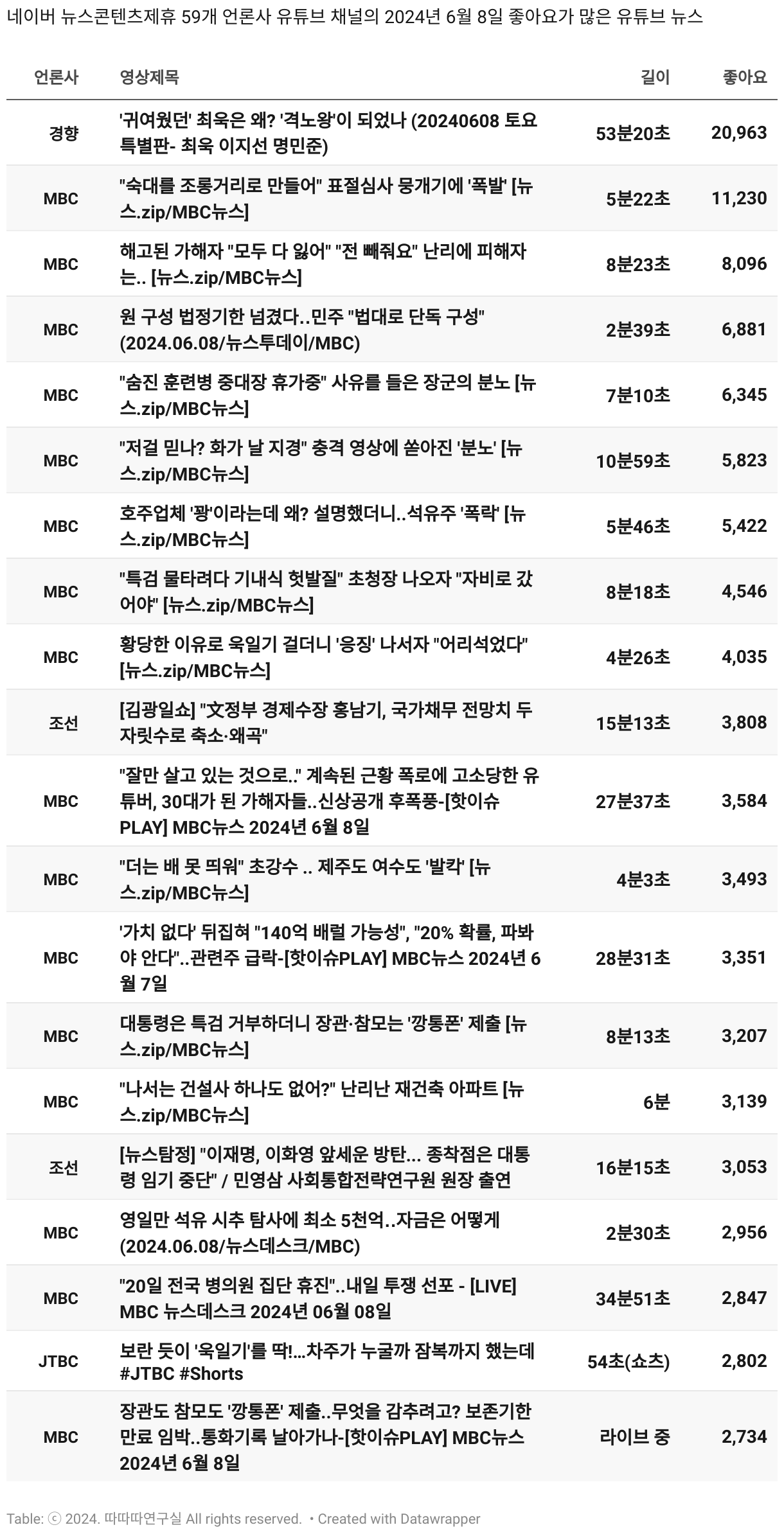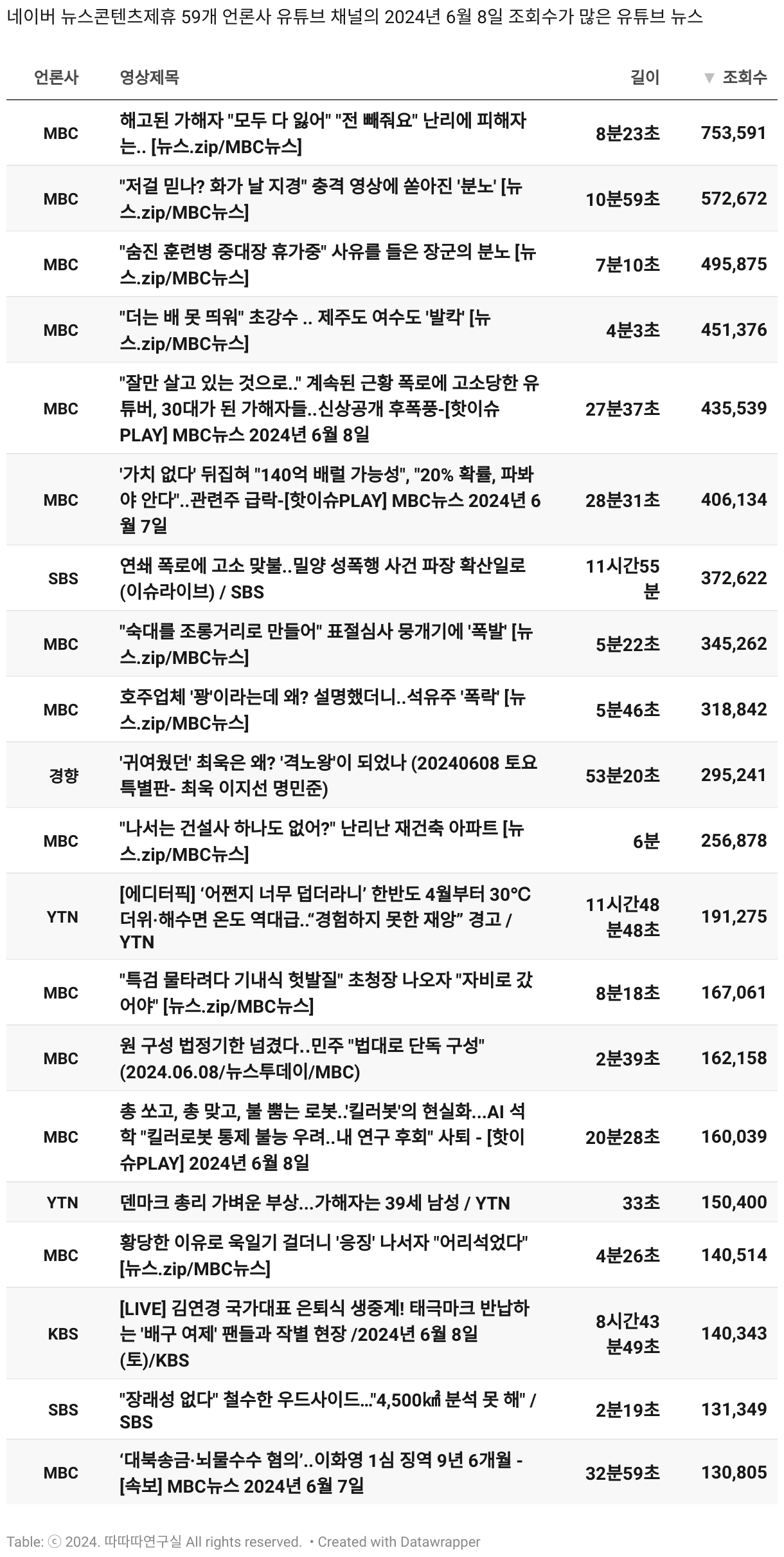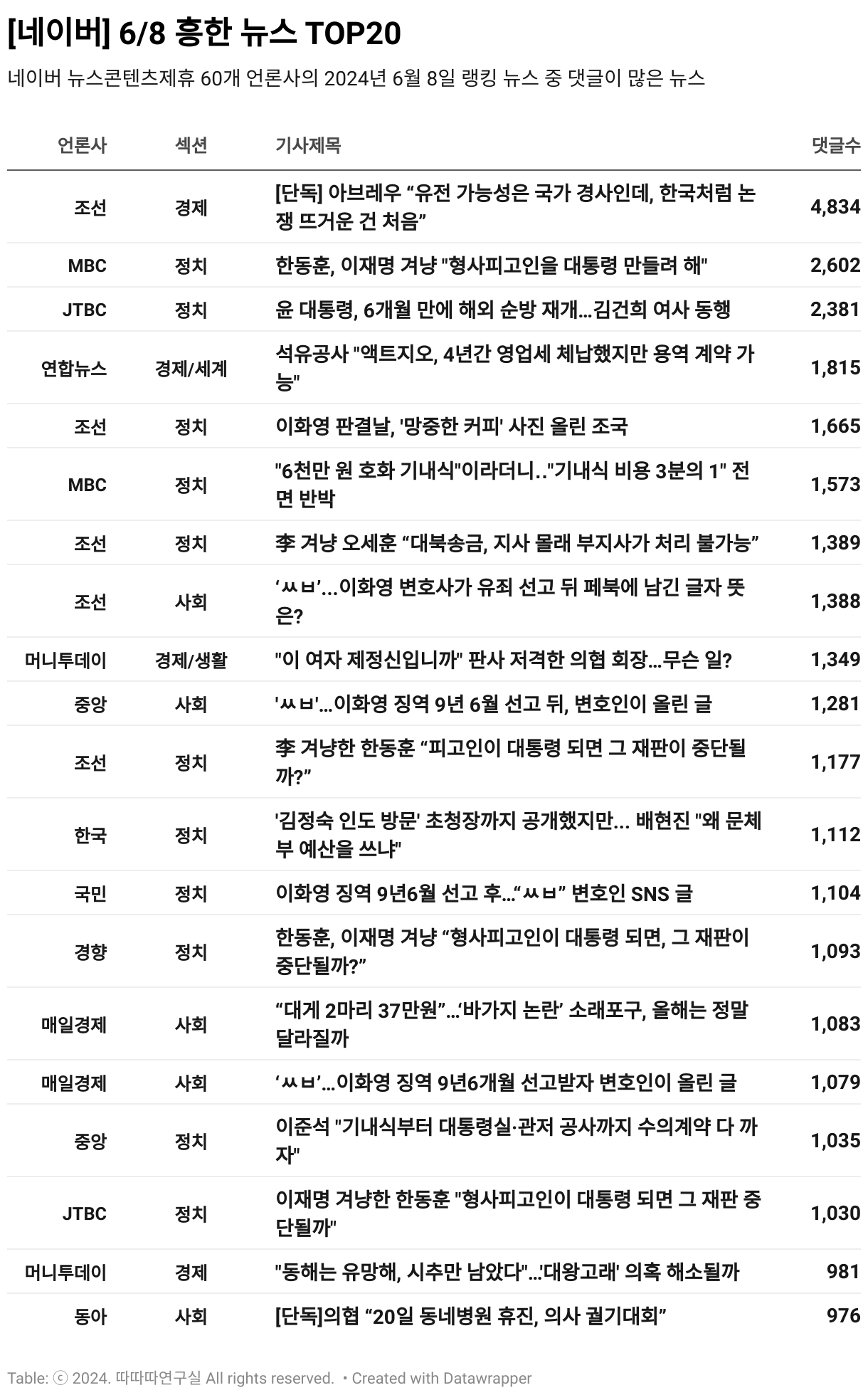 *데이터 수집 기간 : 2024년 6월 9일 *데이터 수집 대상 : 네이버 뉴스콘텐츠제휴 60개 언론사. 종합일간지 10개(경향신문, 국민일보, 동아일보, 문화일보, 서울신문, 세계일보, 조선일보, 중앙일보, 한겨레신문, 한국일보), 방송/통신사 14개(뉴스1, 뉴시스, 연합뉴스, 연합뉴스TV, 채널A, 한국경제TV, JTBC, KBS, MBC, MBN, SBS, SBS BIZ, TV조선, YTN), 경제지 11개(매일경제, 머니투데이, 비즈워치, 서울경제, 아시아경제, 이데일리, 조선비즈, 조세일보, 파이낸셜뉴스, 한국경제(유튜브제외), 헤럴드경제) 인터넷 8개(노컷뉴스, 더팩트, 데일리안, 머니S, 미디어오늘, 아이뉴스24, 오마이뉴스, 프레시안), IT 5개(디지털데일리,디지털타임스, 블로터, 전자신문, 지디넷코리아), 지역 12개(강원도민일보, 강원일보, 경기일보, 국제신문, 대구MBC, 대전일보, 매일신문, 부산일보, 전주MBC, CJB청주방송, JIBS, kbc광주방송)