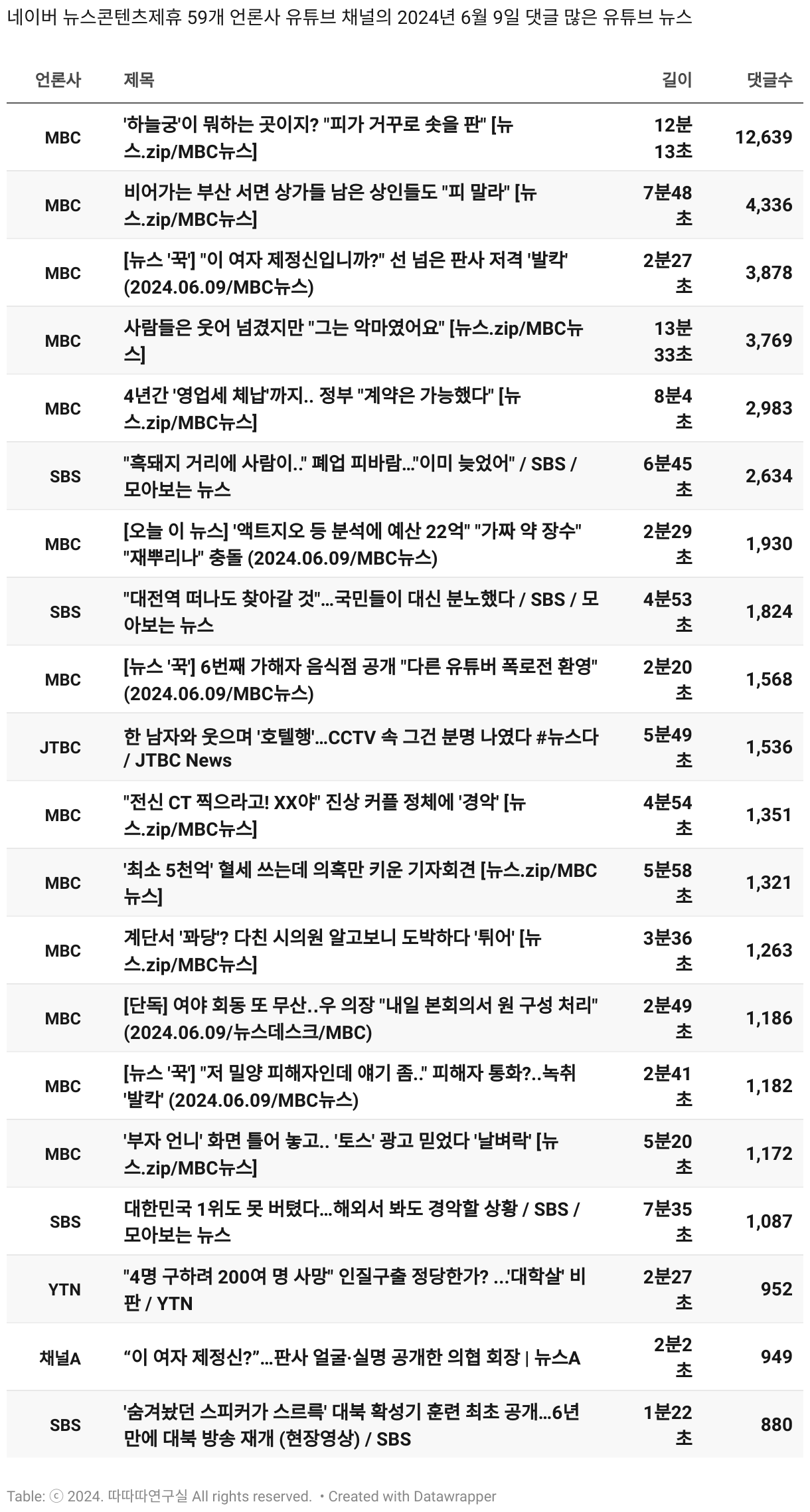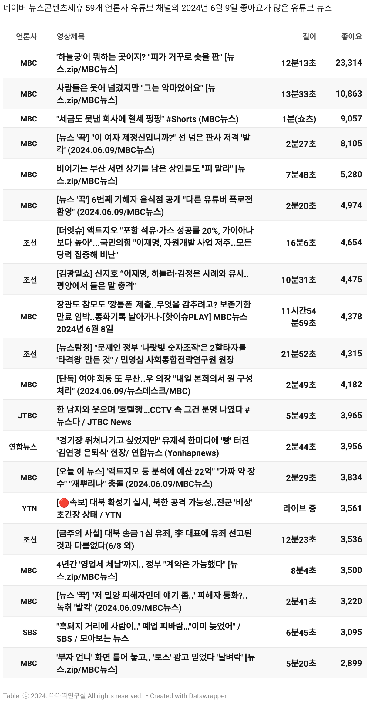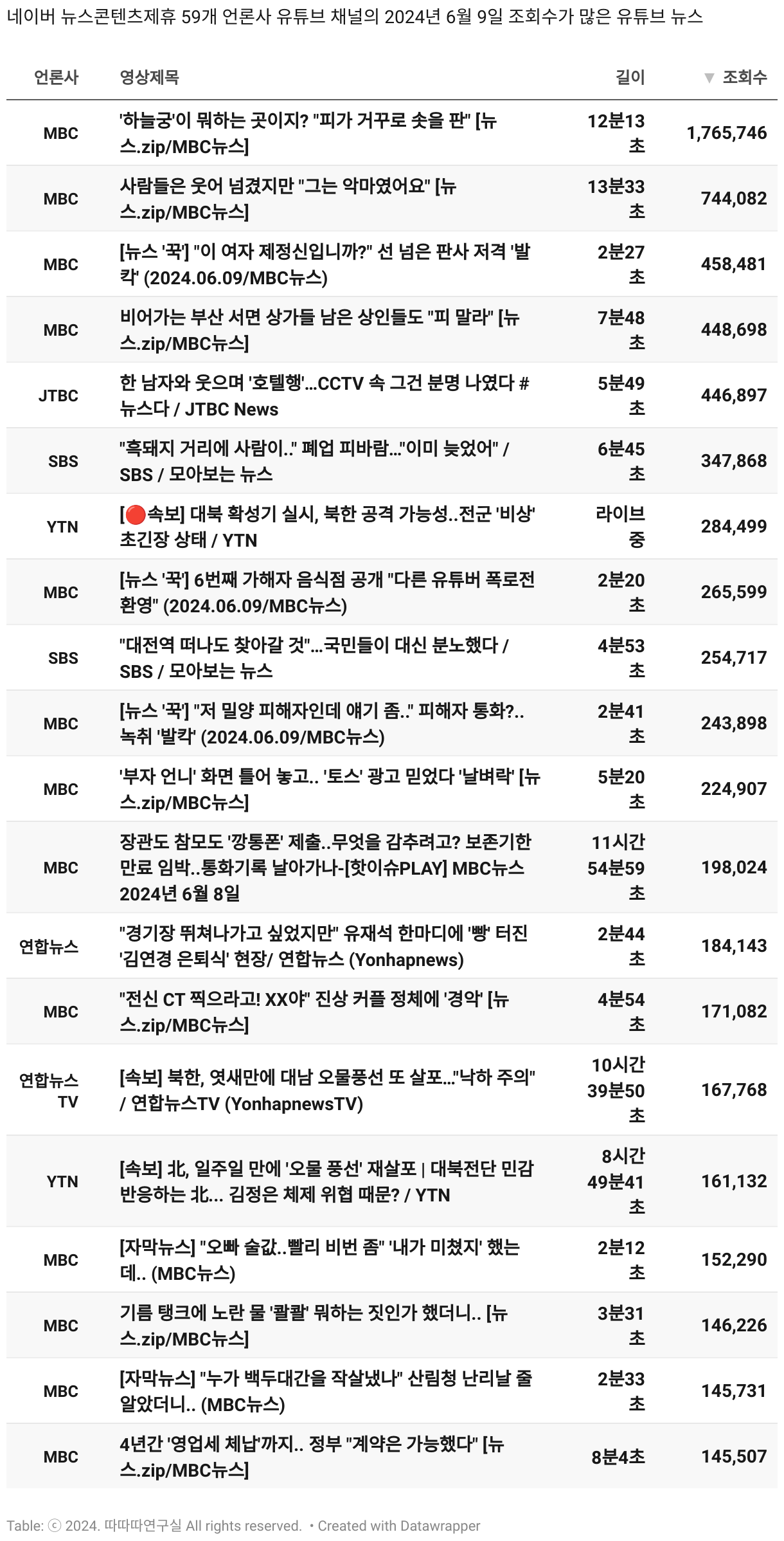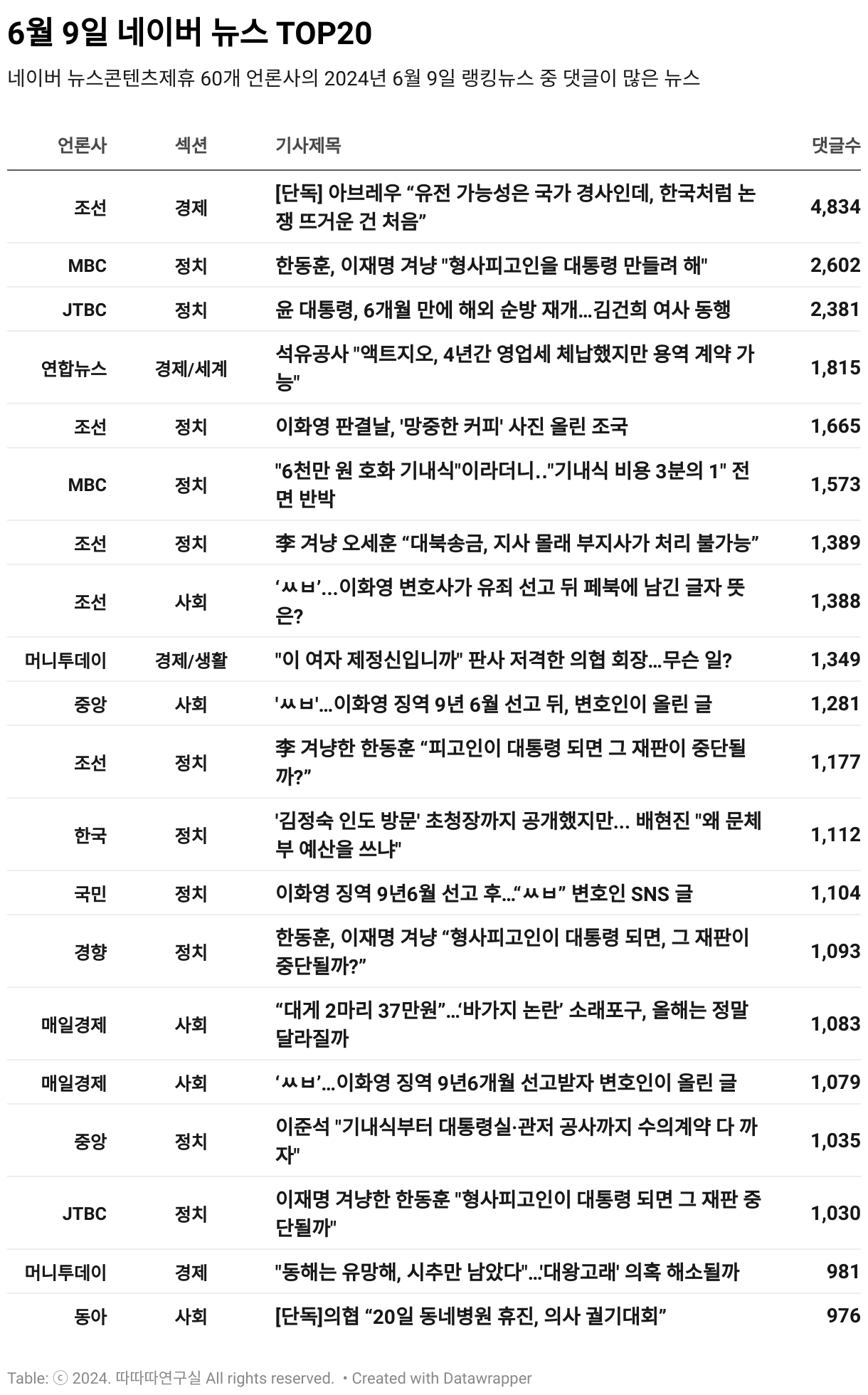 *데이터 수집 기간 : 2024년 6월 10일 *데이터 수집 대상 : 네이버 뉴스콘텐츠제휴 60개 언론사. 종합일간지 10개(경향신문, 국민일보, 동아일보, 문화일보, 서울신문, 세계일보, 조선일보, 중앙일보, 한겨레신문, 한국일보), 방송/통신사 14개(뉴스1, 뉴시스, 연합뉴스, 연합뉴스TV, 채널A, 한국경제TV, JTBC, KBS, MBC, MBN, SBS, SBS BIZ, TV조선, YTN), 경제지 11개(매일경제, 머니투데이, 비즈워치, 서울경제, 아시아경제, 이데일리, 조선비즈, 조세일보, 파이낸셜뉴스, 한국경제(유튜브제외), 헤럴드경제) 인터넷 8개(노컷뉴스, 더팩트, 데일리안, 머니S, 미디어오늘, 아이뉴스24, 오마이뉴스, 프레시안), IT 5개(디지털데일리,디지털타임스, 블로터, 전자신문, 지디넷코리아), 지역 12개(강원도민일보, 강원일보, 경기일보, 국제신문, 대구MBC, 대전일보, 매일신문, 부산일보, 전주MBC, CJB청주방송, JIBS, kbc광주방송)