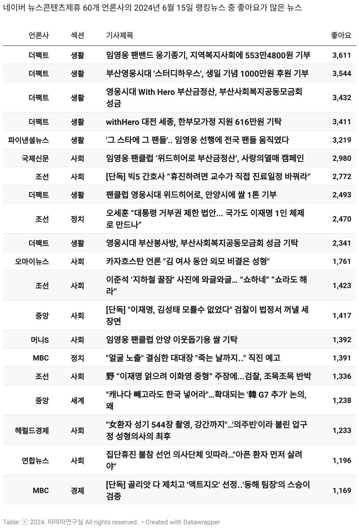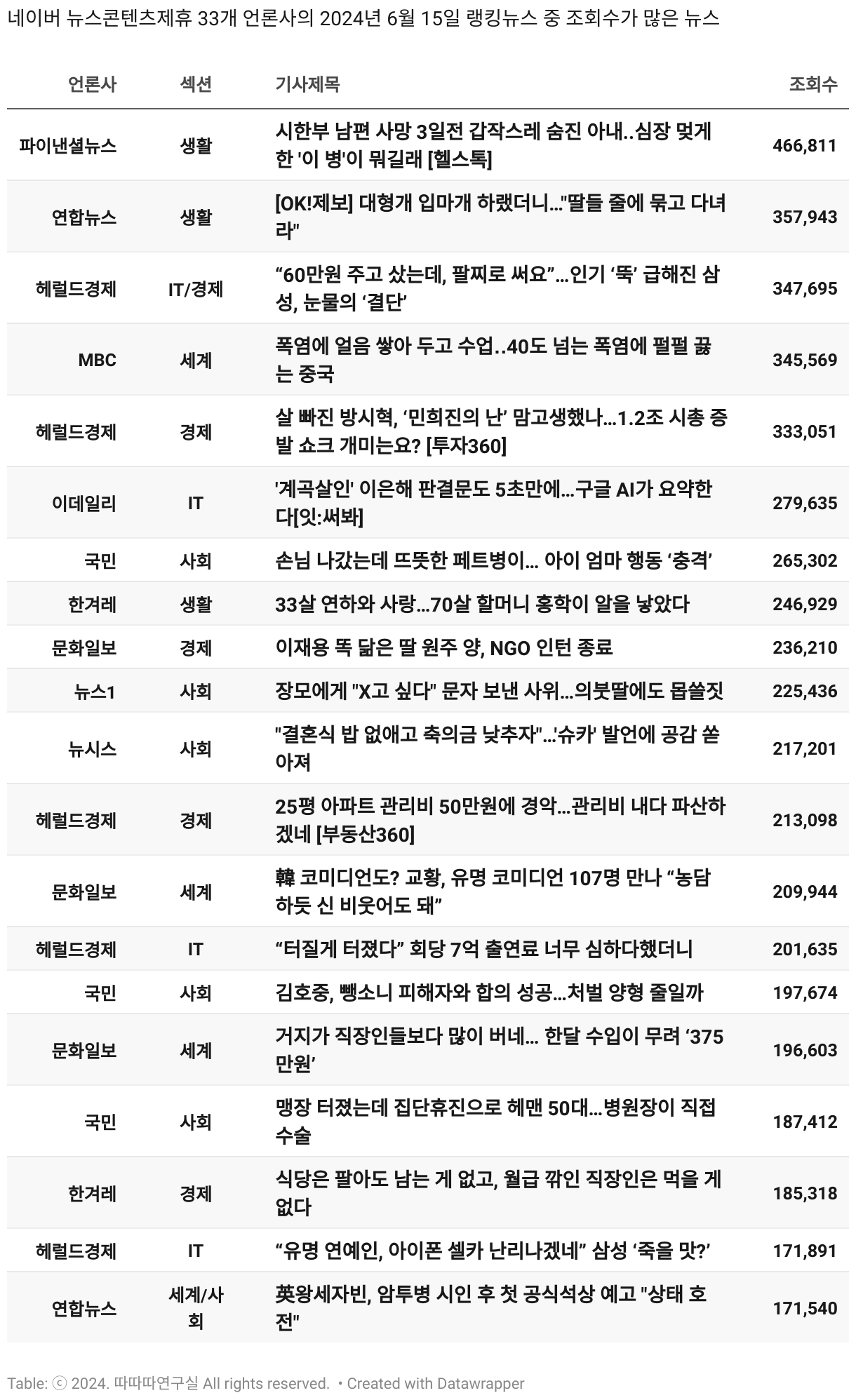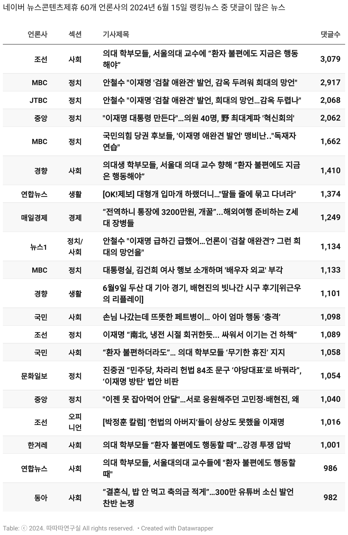 *데이터 수집 기간 : 2024년 6월 10일 *데이터 수집 대상 : 네이버 뉴스콘텐츠제휴 60개 언론사. 종합일간지 10개(경향신문, 국민일보, 동아일보, 문화일보, 서울신문, 세계일보, 조선일보, 중앙일보, 한겨레신문, 한국일보), 방송/통신사 14개(뉴스1, 뉴시스, 연합뉴스, 연합뉴스TV, 채널A, 한국경제TV, JTBC, KBS, MBC, MBN, SBS, SBS BIZ, TV조선, YTN), 경제지 11개(매일경제, 머니투데이, 비즈워치, 서울경제, 아시아경제, 이데일리, 조선비즈, 조세일보, 파이낸셜뉴스, 한국경제(유튜브제외), 헤럴드경제) 인터넷 8개(노컷뉴스, 더팩트, 데일리안, 머니S, 미디어오늘, 아이뉴스24, 오마이뉴스, 프레시안), IT 5개(디지털데일리,디지털타임스, 블로터, 전자신문, 지디넷코리아), 지역 12개(강원도민일보, 강원일보, 경기일보, 국제신문, 대구MBC, 대전일보, 매일신문, 부산일보, 전주MBC, CJB청주방송, JIBS, kbc광주방송)