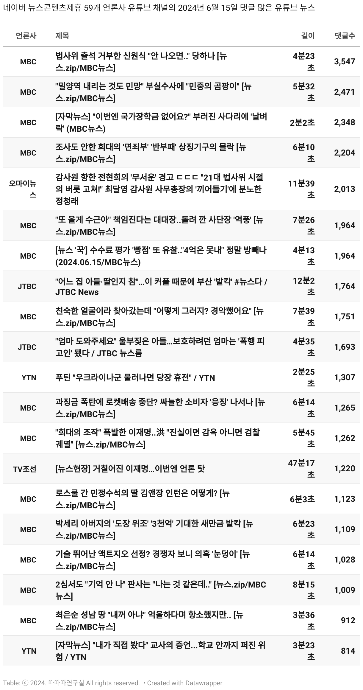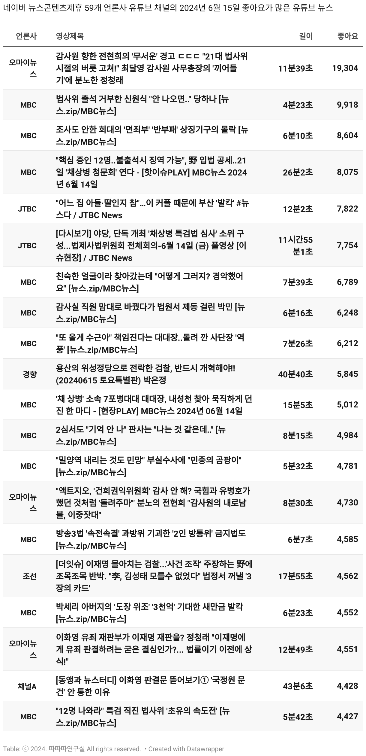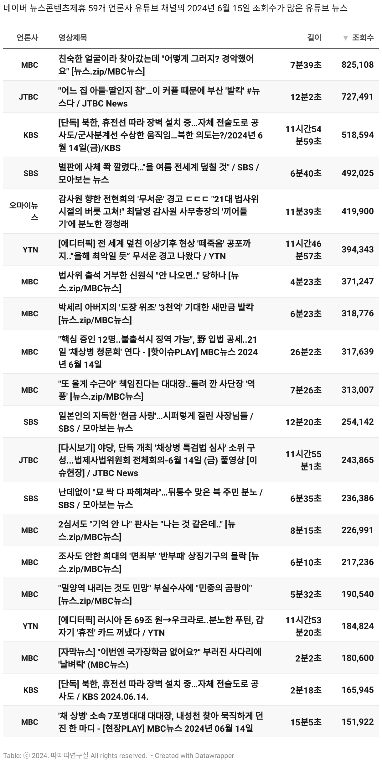 *데이터 수집 기간 : 2024년 6월 10일 *데이터 수집 대상 : 네이버 뉴스콘텐츠제휴 60개 언론사. 종합일간지 10개(경향신문, 국민일보, 동아일보, 문화일보, 서울신문, 세계일보, 조선일보, 중앙일보, 한겨레신문, 한국일보), 방송/통신사 14개(뉴스1, 뉴시스, 연합뉴스, 연합뉴스TV, 채널A, 한국경제TV, JTBC, KBS, MBC, MBN, SBS, SBS BIZ, TV조선, YTN), 경제지 11개(매일경제, 머니투데이, 비즈워치, 서울경제, 아시아경제, 이데일리, 조선비즈, 조세일보, 파이낸셜뉴스, 한국경제(유튜브제외), 헤럴드경제) 인터넷 8개(노컷뉴스, 더팩트, 데일리안, 머니S, 미디어오늘, 아이뉴스24, 오마이뉴스, 프레시안), IT 5개(디지털데일리,디지털타임스, 블로터, 전자신문, 지디넷코리아), 지역 12개(강원도민일보, 강원일보, 경기일보, 국제신문, 대구MBC, 대전일보, 매일신문, 부산일보, 전주MBC, CJB청주방송, JIBS, kbc광주방송)
