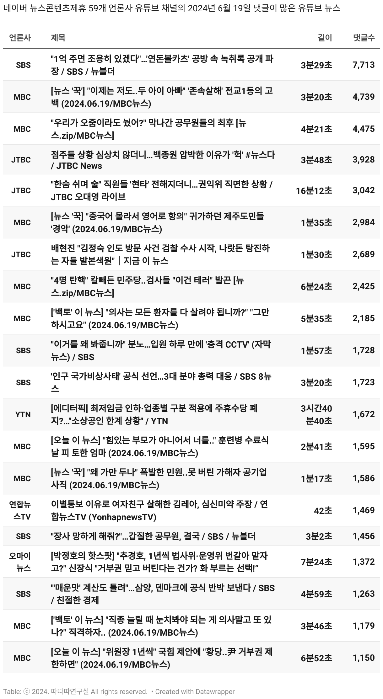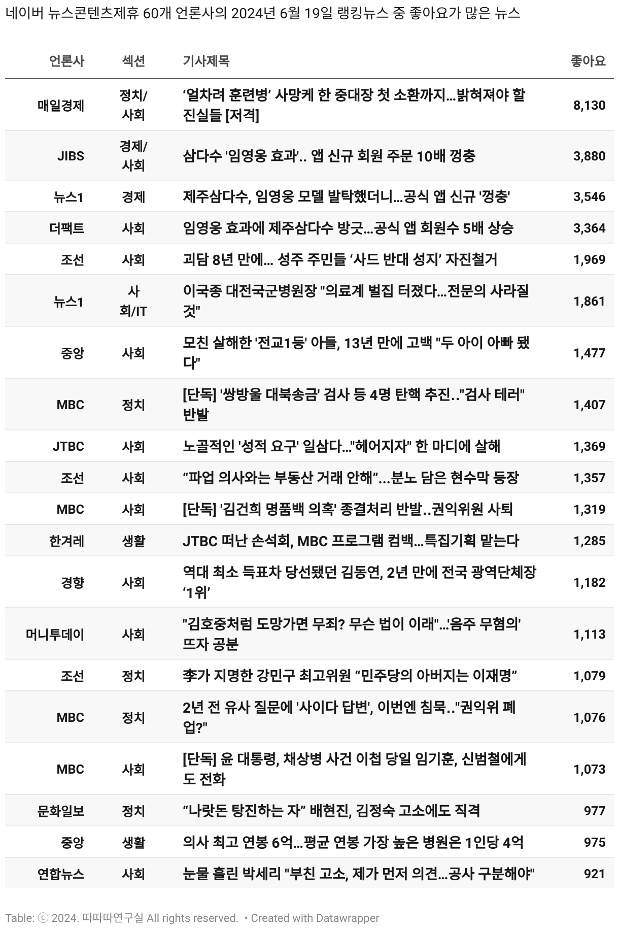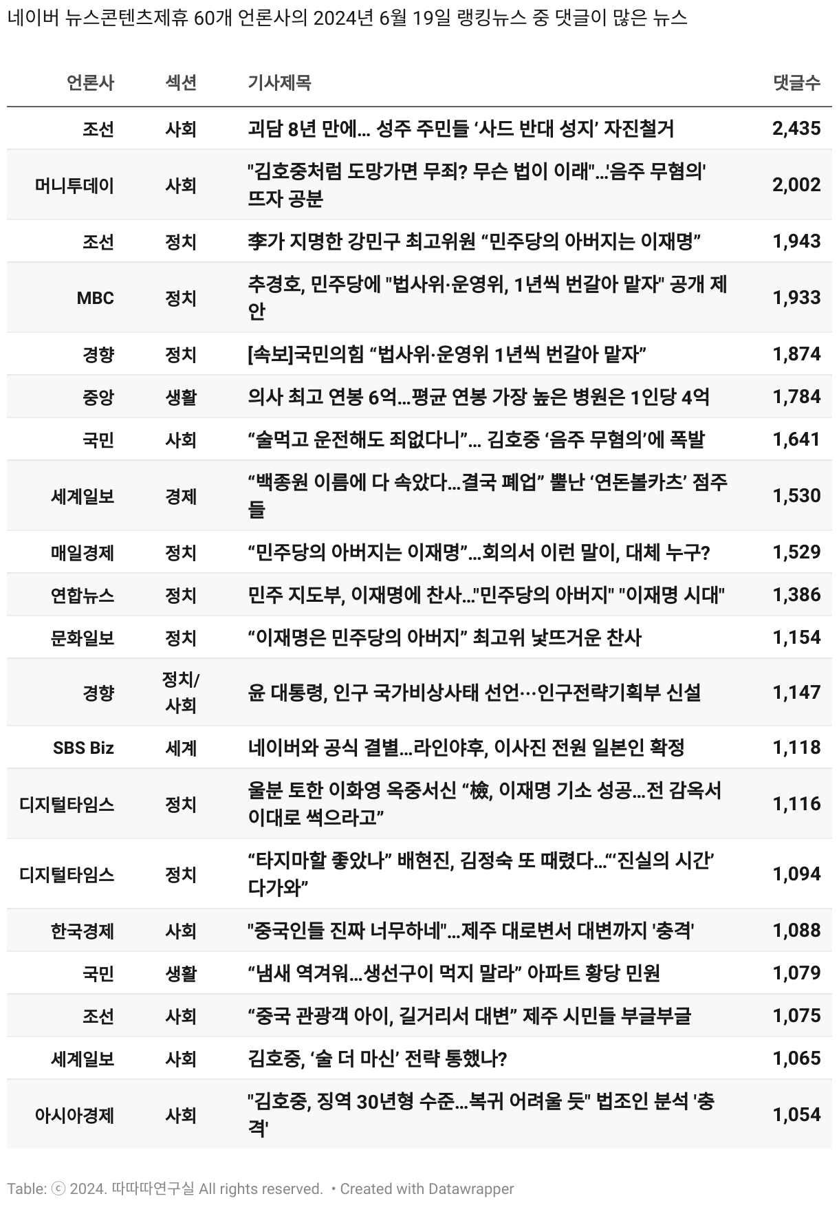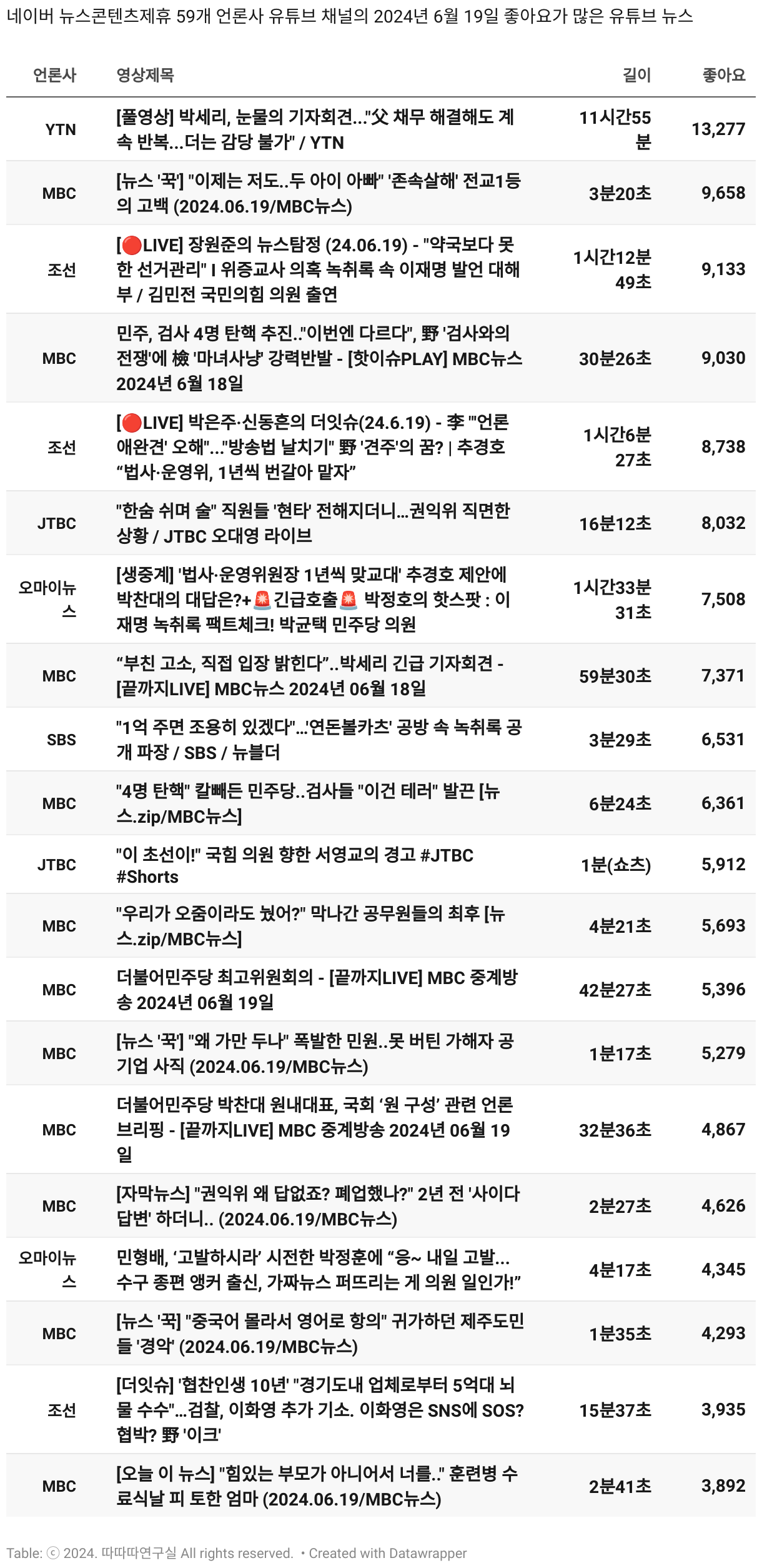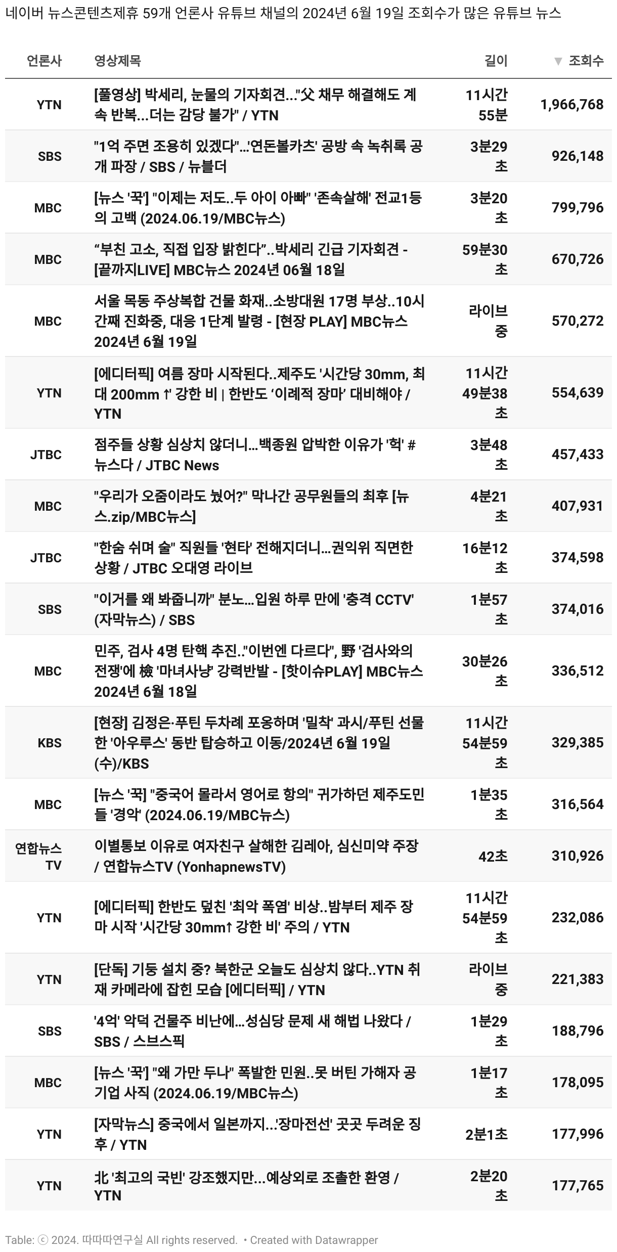 *데이터 수집 기간 : 2024년 6월 10일 *데이터 수집 대상 : 네이버 뉴스콘텐츠제휴 60개 언론사. 종합일간지 10개(경향신문, 국민일보, 동아일보, 문화일보, 서울신문, 세계일보, 조선일보, 중앙일보, 한겨레신문, 한국일보), 방송/통신사 14개(뉴스1, 뉴시스, 연합뉴스, 연합뉴스TV, 채널A, 한국경제TV, JTBC, KBS, MBC, MBN, SBS, SBS BIZ, TV조선, YTN), 경제지 11개(매일경제, 머니투데이, 비즈워치, 서울경제, 아시아경제, 이데일리, 조선비즈, 조세일보, 파이낸셜뉴스, 한국경제(유튜브제외), 헤럴드경제) 인터넷 8개(노컷뉴스, 더팩트, 데일리안, 머니S, 미디어오늘, 아이뉴스24, 오마이뉴스, 프레시안), IT 5개(디지털데일리,디지털타임스, 블로터, 전자신문, 지디넷코리아), 지역 12개(강원도민일보, 강원일보, 경기일보, 국제신문, 대구MBC, 대전일보, 매일신문, 부산일보, 전주MBC, CJB청주방송, JIBS, kbc광주방송)