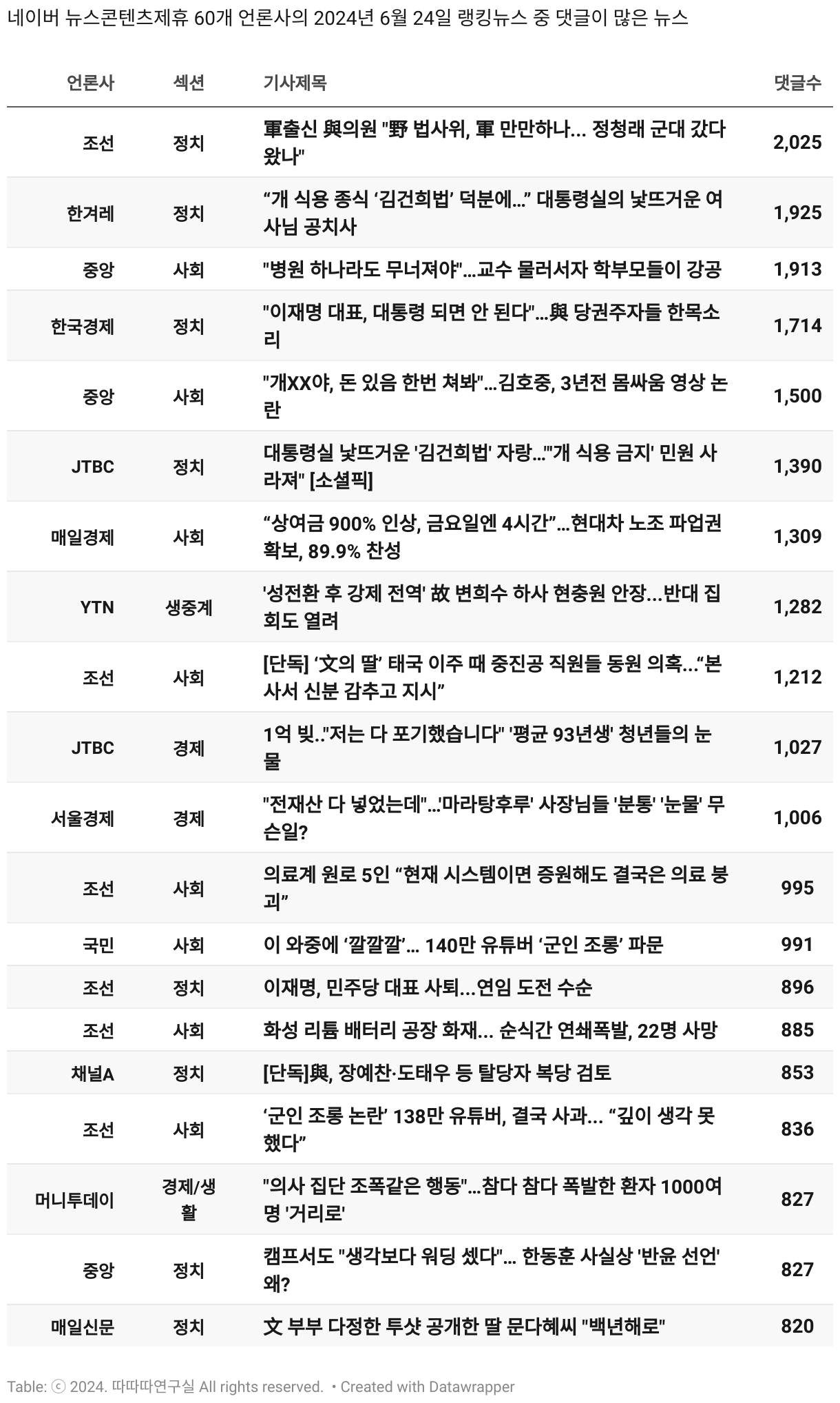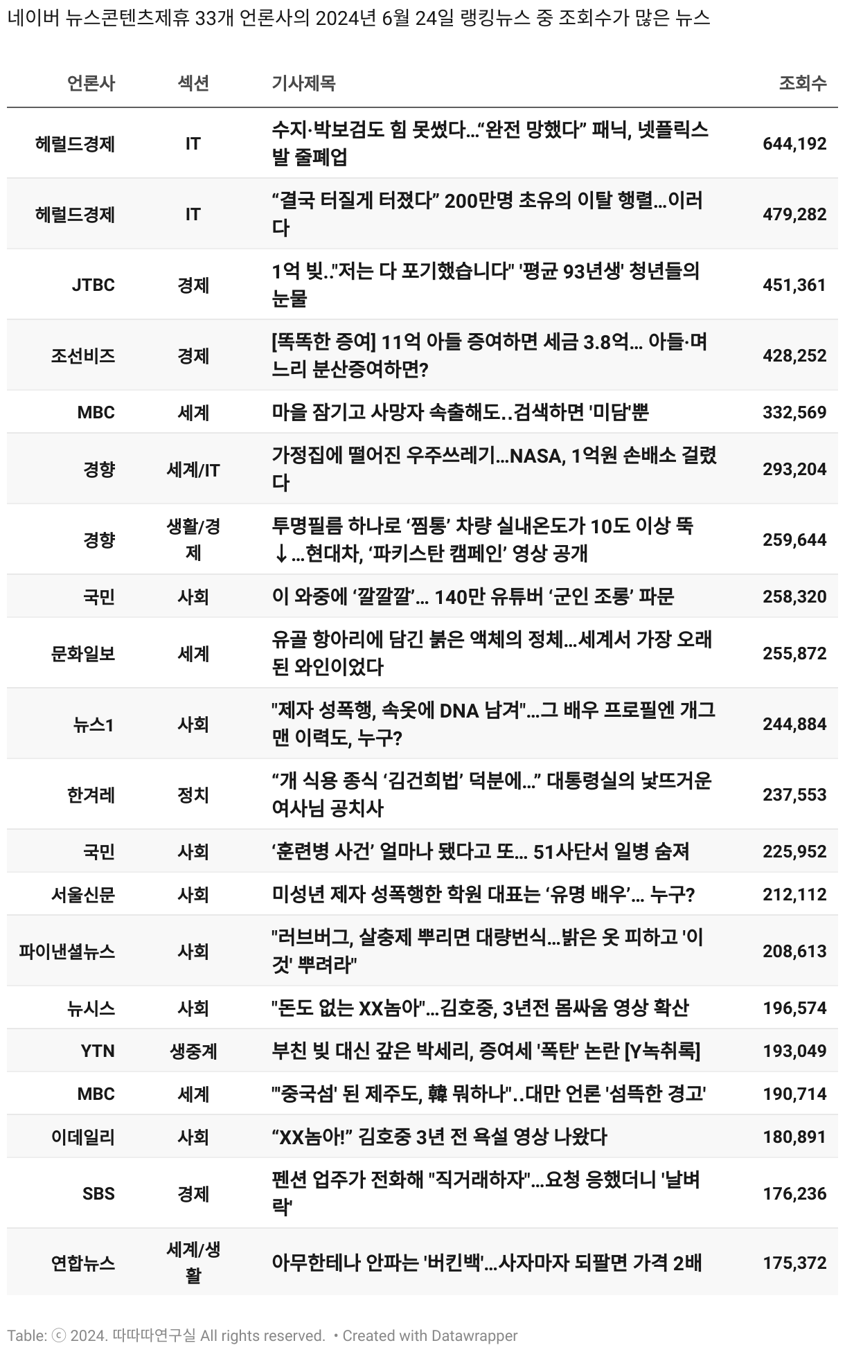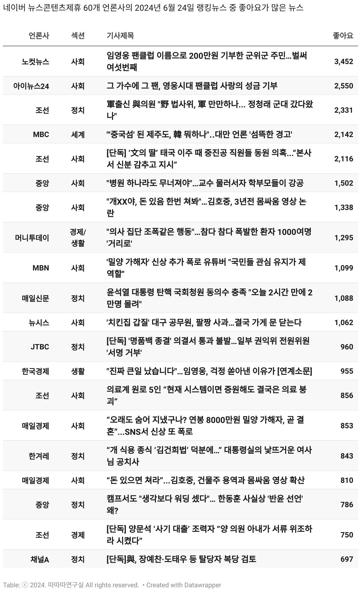 *데이터 수집 기간 : 2024년 6월 10일 *데이터 수집 대상 : 네이버 뉴스콘텐츠제휴 60개 언론사. 종합일간지 10개(경향신문, 국민일보, 동아일보, 문화일보, 서울신문, 세계일보, 조선일보, 중앙일보, 한겨레신문, 한국일보), 방송/통신사 14개(뉴스1, 뉴시스, 연합뉴스, 연합뉴스TV, 채널A, 한국경제TV, JTBC, KBS, MBC, MBN, SBS, SBS BIZ, TV조선, YTN), 경제지 11개(매일경제, 머니투데이, 비즈워치, 서울경제, 아시아경제, 이데일리, 조선비즈, 조세일보, 파이낸셜뉴스, 한국경제(유튜브제외), 헤럴드경제) 인터넷 8개(노컷뉴스, 더팩트, 데일리안, 머니S, 미디어오늘, 아이뉴스24, 오마이뉴스, 프레시안), IT 5개(디지털데일리,디지털타임스, 블로터, 전자신문, 지디넷코리아), 지역 12개(강원도민일보, 강원일보, 경기일보, 국제신문, 대구MBC, 대전일보, 매일신문, 부산일보, 전주MBC, CJB청주방송, JIBS, kbc광주방송)