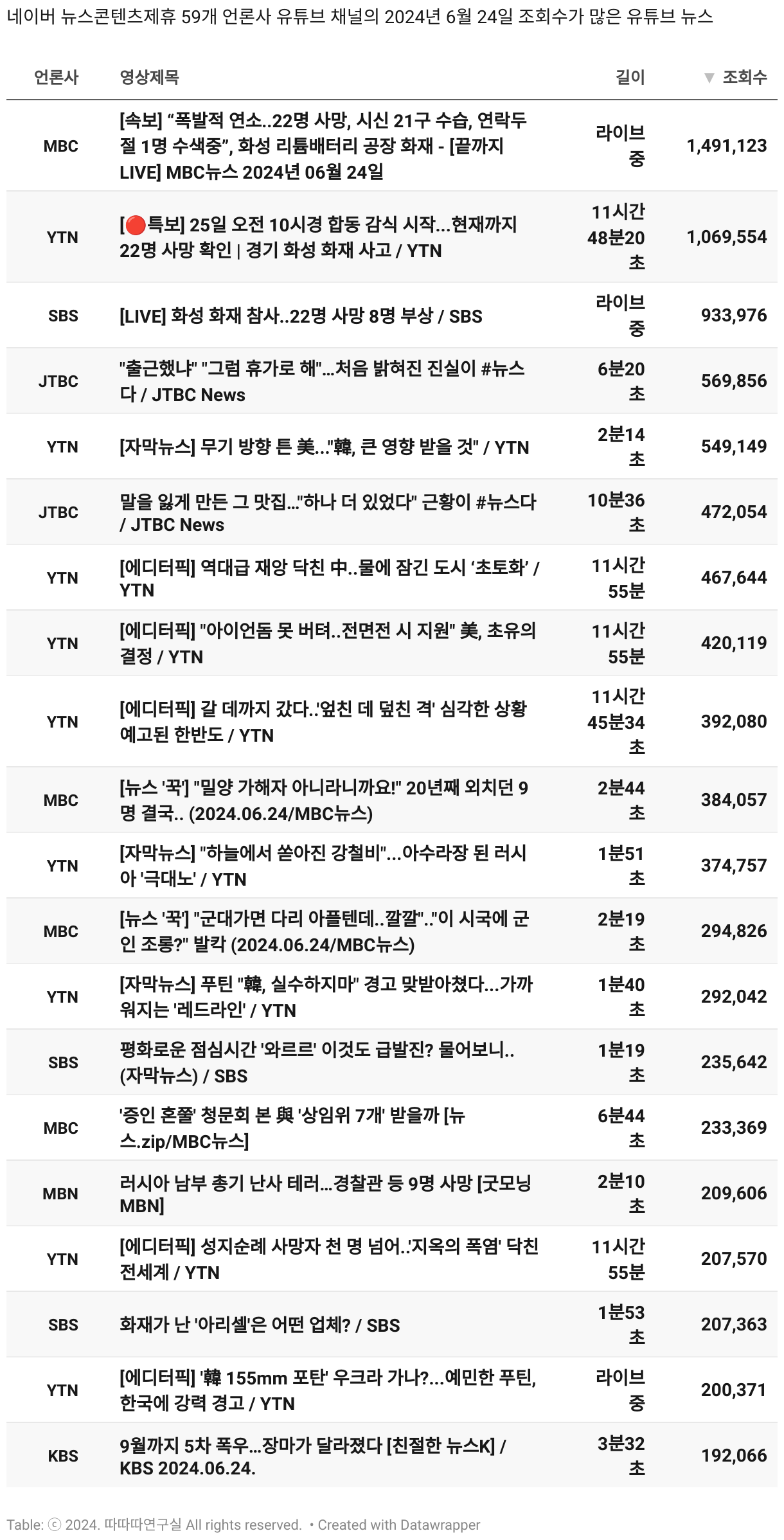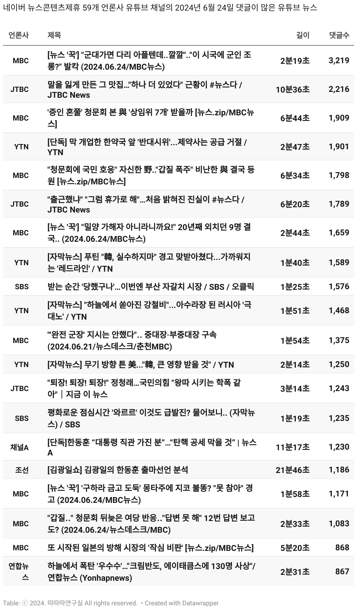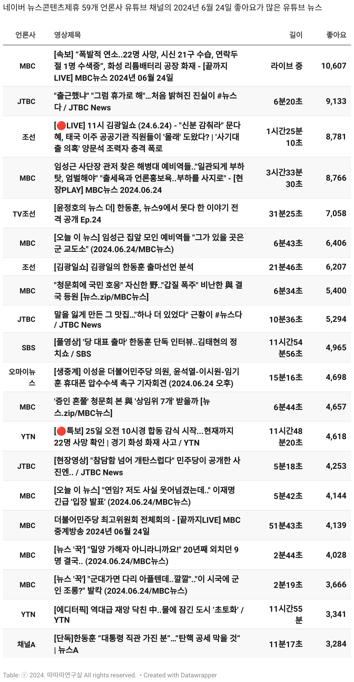 *데이터 수집 기간 : 2024년 6월 10일 *데이터 수집 대상 : 네이버 뉴스콘텐츠제휴 60개 언론사. 종합일간지 10개(경향신문, 국민일보, 동아일보, 문화일보, 서울신문, 세계일보, 조선일보, 중앙일보, 한겨레신문, 한국일보), 방송/통신사 14개(뉴스1, 뉴시스, 연합뉴스, 연합뉴스TV, 채널A, 한국경제TV, JTBC, KBS, MBC, MBN, SBS, SBS BIZ, TV조선, YTN), 경제지 11개(매일경제, 머니투데이, 비즈워치, 서울경제, 아시아경제, 이데일리, 조선비즈, 조세일보, 파이낸셜뉴스, 한국경제(유튜브제외), 헤럴드경제) 인터넷 8개(노컷뉴스, 더팩트, 데일리안, 머니S, 미디어오늘, 아이뉴스24, 오마이뉴스, 프레시안), IT 5개(디지털데일리,디지털타임스, 블로터, 전자신문, 지디넷코리아), 지역 12개(강원도민일보, 강원일보, 경기일보, 국제신문, 대구MBC, 대전일보, 매일신문, 부산일보, 전주MBC, CJB청주방송, JIBS, kbc광주방송)