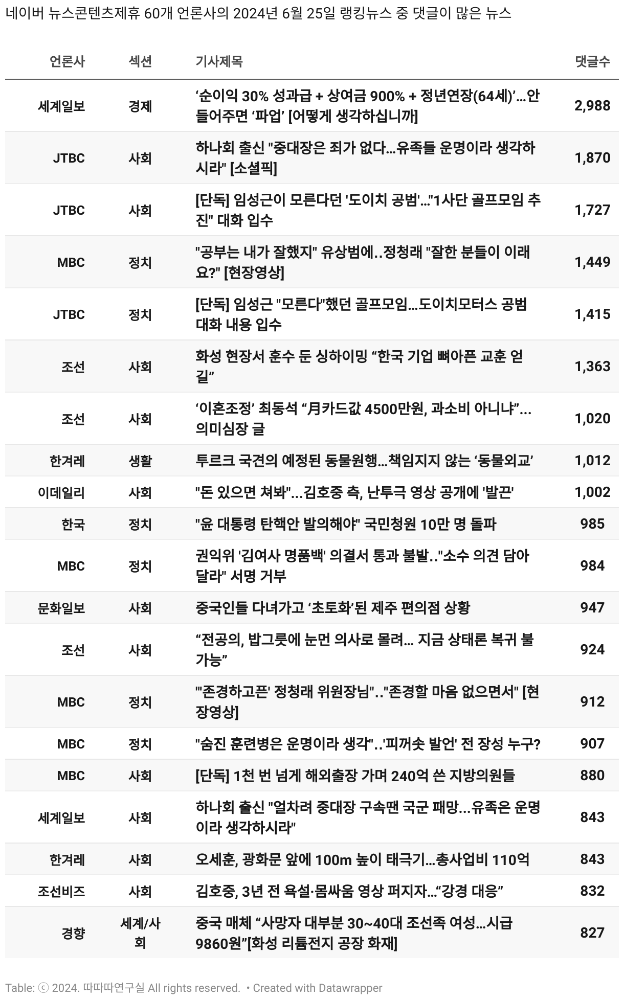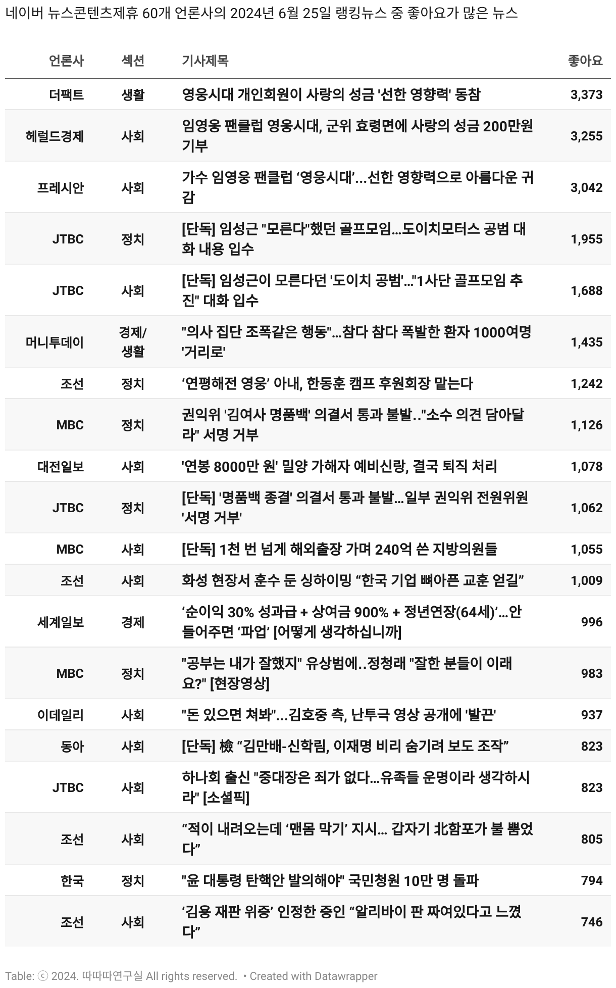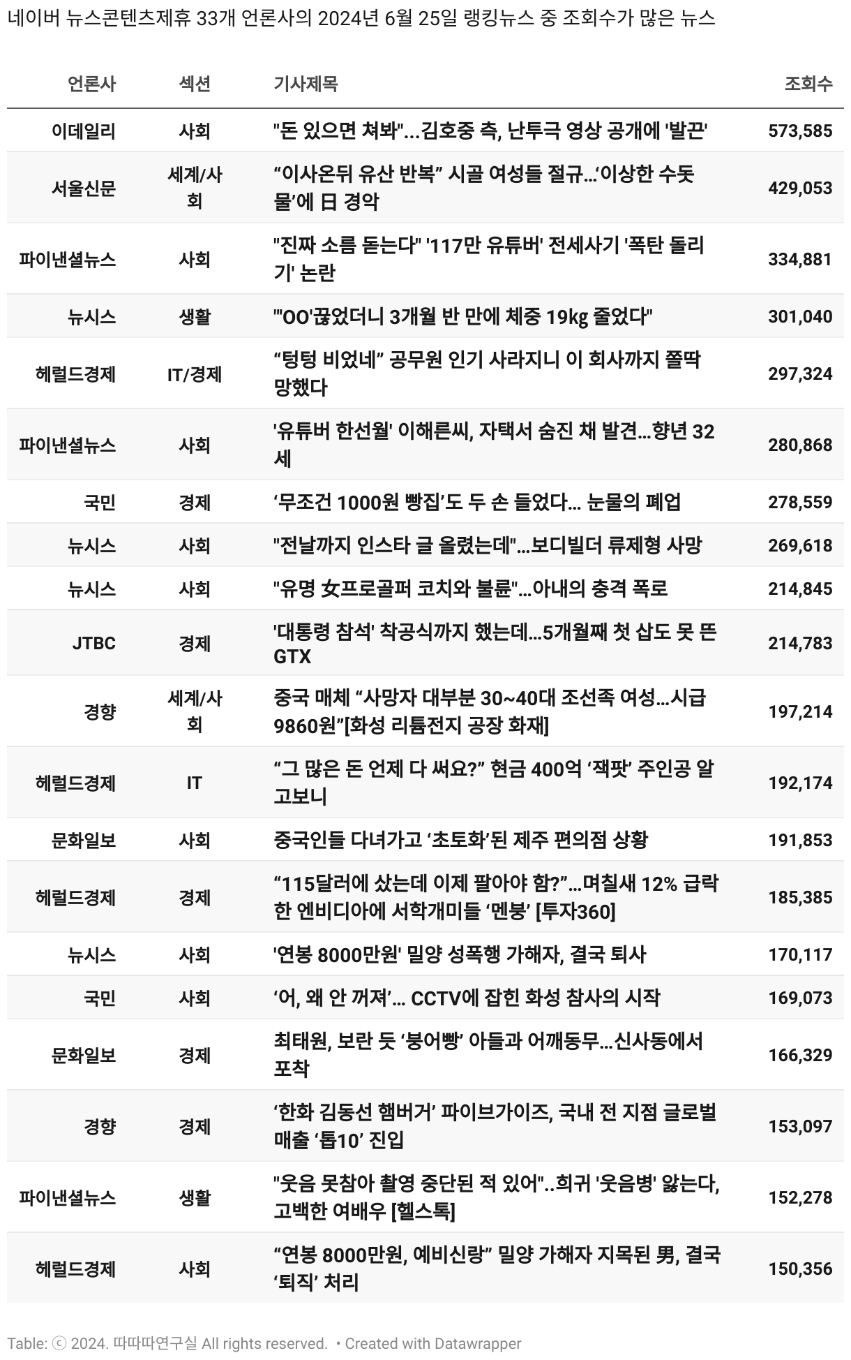 *데이터 수집 기간 : 2024년 6월 10일 *데이터 수집 대상 : 네이버 뉴스콘텐츠제휴 60개 언론사. 종합일간지 10개(경향신문, 국민일보, 동아일보, 문화일보, 서울신문, 세계일보, 조선일보, 중앙일보, 한겨레신문, 한국일보), 방송/통신사 14개(뉴스1, 뉴시스, 연합뉴스, 연합뉴스TV, 채널A, 한국경제TV, JTBC, KBS, MBC, MBN, SBS, SBS BIZ, TV조선, YTN), 경제지 11개(매일경제, 머니투데이, 비즈워치, 서울경제, 아시아경제, 이데일리, 조선비즈, 조세일보, 파이낸셜뉴스, 한국경제(유튜브제외), 헤럴드경제) 인터넷 8개(노컷뉴스, 더팩트, 데일리안, 머니S, 미디어오늘, 아이뉴스24, 오마이뉴스, 프레시안), IT 5개(디지털데일리,디지털타임스, 블로터, 전자신문, 지디넷코리아), 지역 12개(강원도민일보, 강원일보, 경기일보, 국제신문, 대구MBC, 대전일보, 매일신문, 부산일보, 전주MBC, CJB청주방송, JIBS, kbc광주방송)