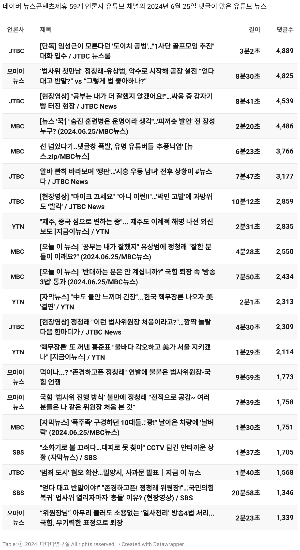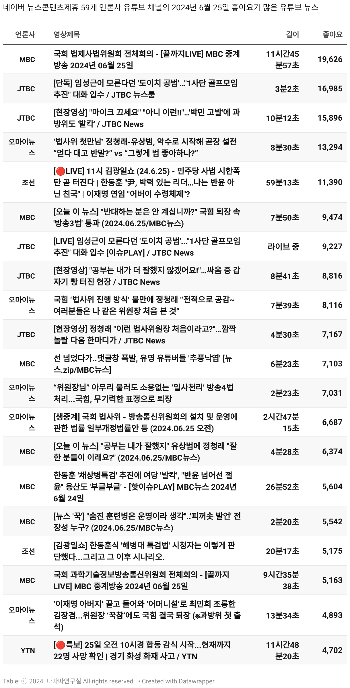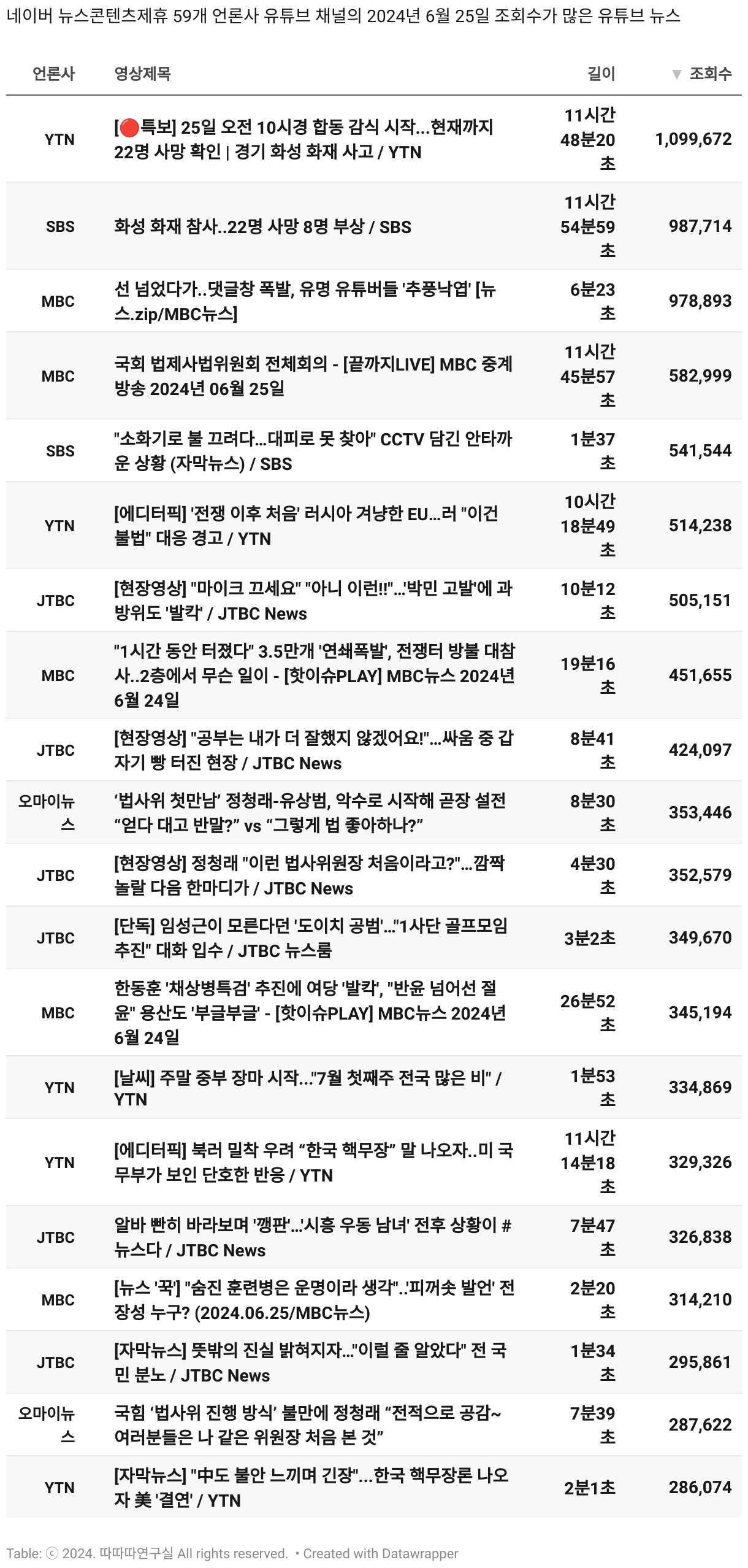 *데이터 수집 기간 : 2024년 6월 10일 *데이터 수집 대상 : 네이버 뉴스콘텐츠제휴 60개 언론사. 종합일간지 10개(경향신문, 국민일보, 동아일보, 문화일보, 서울신문, 세계일보, 조선일보, 중앙일보, 한겨레신문, 한국일보), 방송/통신사 14개(뉴스1, 뉴시스, 연합뉴스, 연합뉴스TV, 채널A, 한국경제TV, JTBC, KBS, MBC, MBN, SBS, SBS BIZ, TV조선, YTN), 경제지 11개(매일경제, 머니투데이, 비즈워치, 서울경제, 아시아경제, 이데일리, 조선비즈, 조세일보, 파이낸셜뉴스, 한국경제(유튜브제외), 헤럴드경제) 인터넷 8개(노컷뉴스, 더팩트, 데일리안, 머니S, 미디어오늘, 아이뉴스24, 오마이뉴스, 프레시안), IT 5개(디지털데일리,디지털타임스, 블로터, 전자신문, 지디넷코리아), 지역 12개(강원도민일보, 강원일보, 경기일보, 국제신문, 대구MBC, 대전일보, 매일신문, 부산일보, 전주MBC, CJB청주방송, JIBS, kbc광주방송)