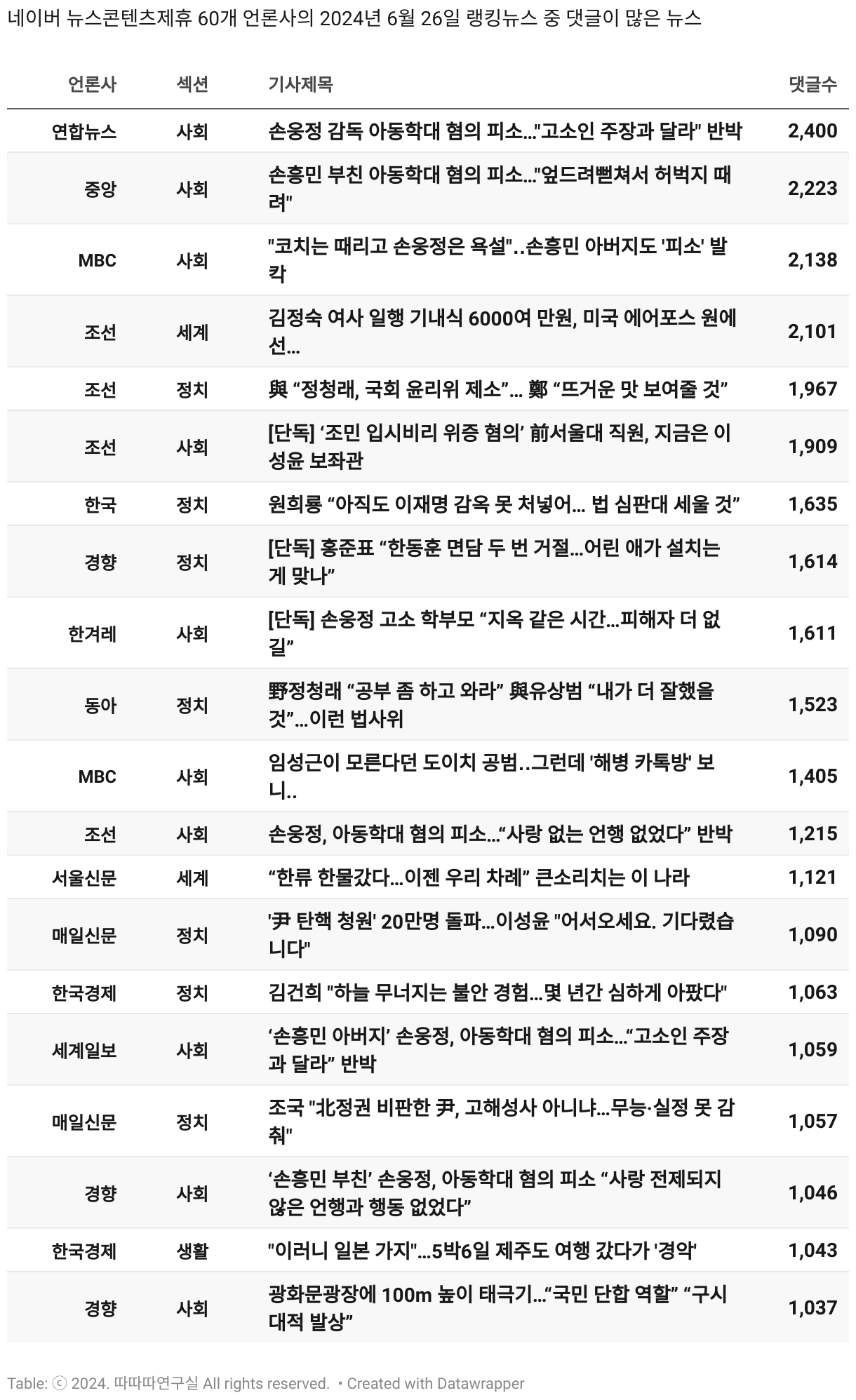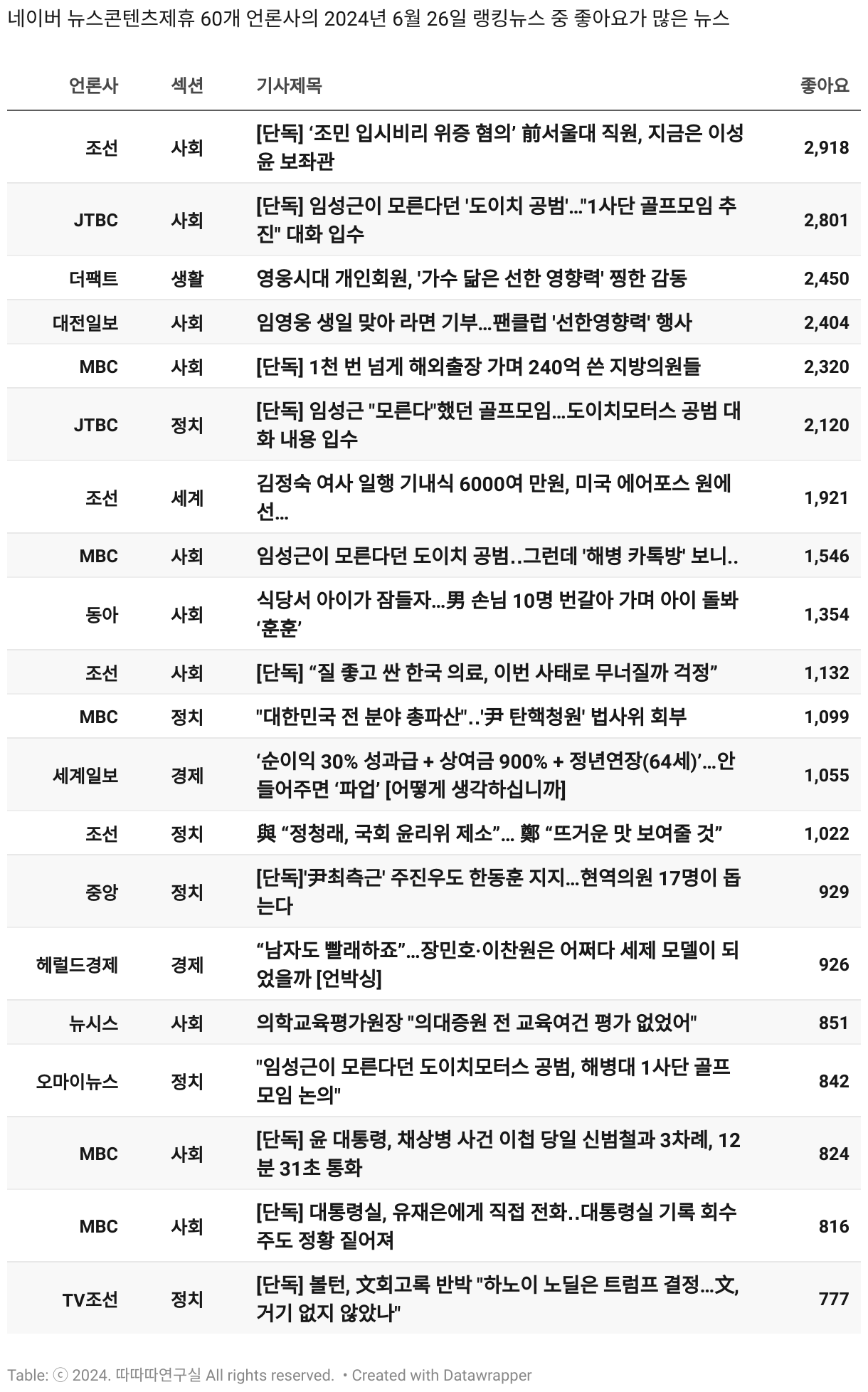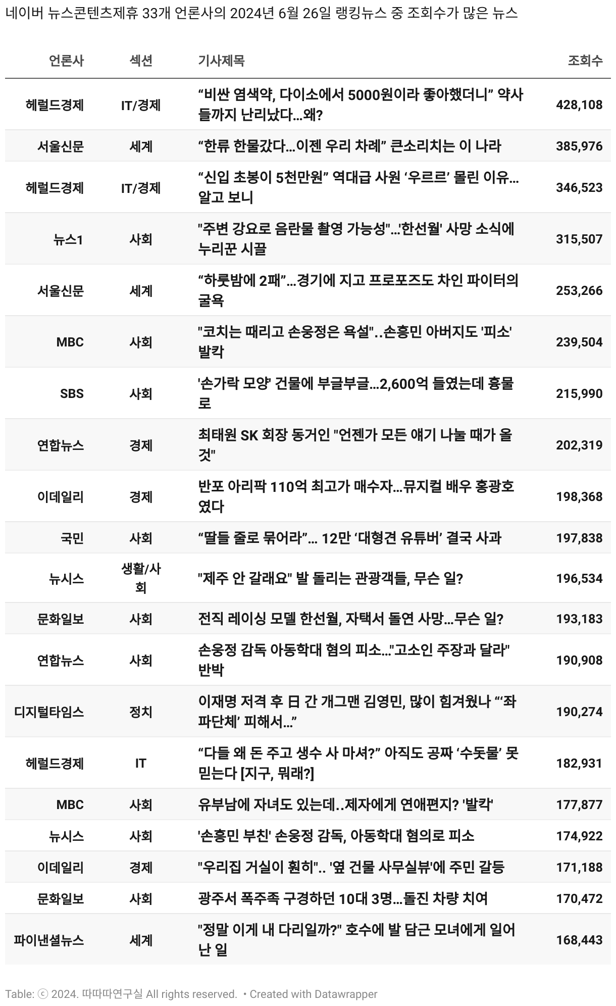 *데이터 수집 기간 : 2024년 6월 10일 *데이터 수집 대상 : 네이버 뉴스콘텐츠제휴 60개 언론사. 종합일간지 10개(경향신문, 국민일보, 동아일보, 문화일보, 서울신문, 세계일보, 조선일보, 중앙일보, 한겨레신문, 한국일보), 방송/통신사 14개(뉴스1, 뉴시스, 연합뉴스, 연합뉴스TV, 채널A, 한국경제TV, JTBC, KBS, MBC, MBN, SBS, SBS BIZ, TV조선, YTN), 경제지 11개(매일경제, 머니투데이, 비즈워치, 서울경제, 아시아경제, 이데일리, 조선비즈, 조세일보, 파이낸셜뉴스, 한국경제(유튜브제외), 헤럴드경제) 인터넷 8개(노컷뉴스, 더팩트, 데일리안, 머니S, 미디어오늘, 아이뉴스24, 오마이뉴스, 프레시안), IT 5개(디지털데일리,디지털타임스, 블로터, 전자신문, 지디넷코리아), 지역 12개(강원도민일보, 강원일보, 경기일보, 국제신문, 대구MBC, 대전일보, 매일신문, 부산일보, 전주MBC, CJB청주방송, JIBS, kbc광주방송)