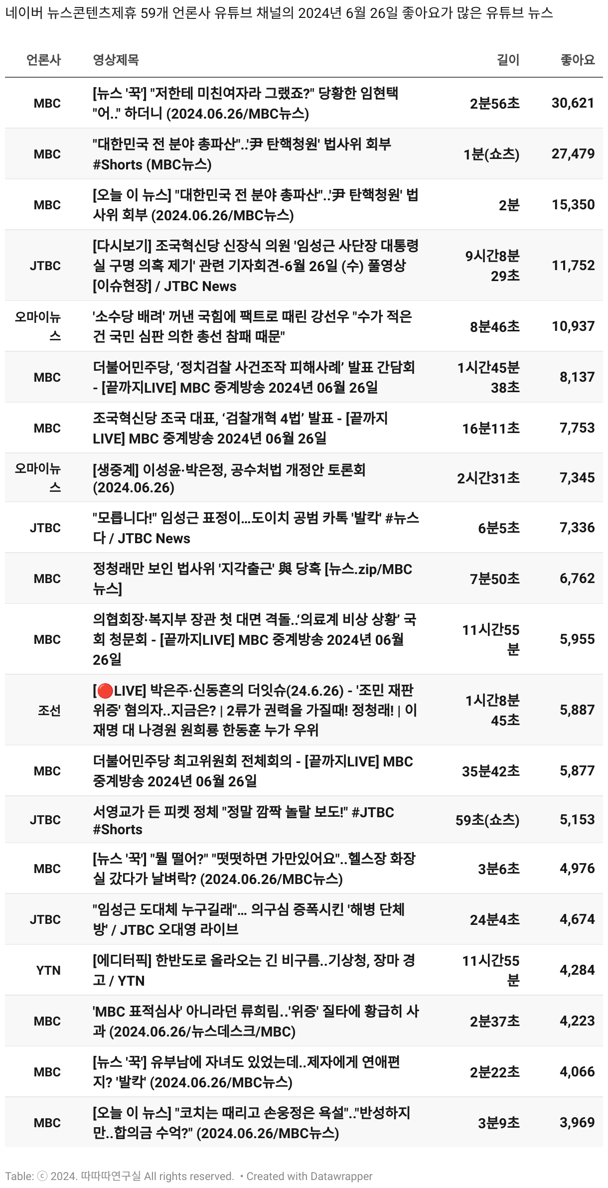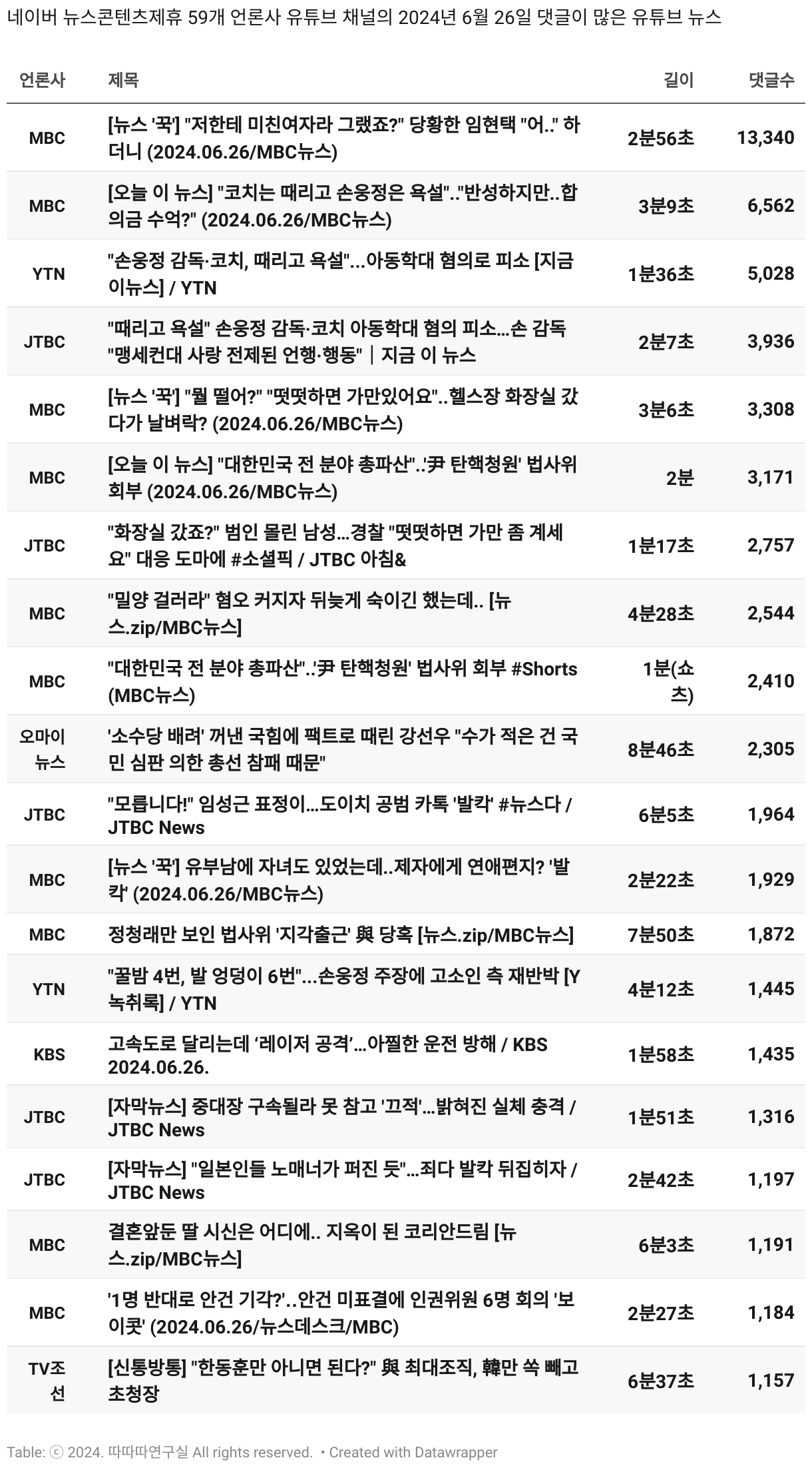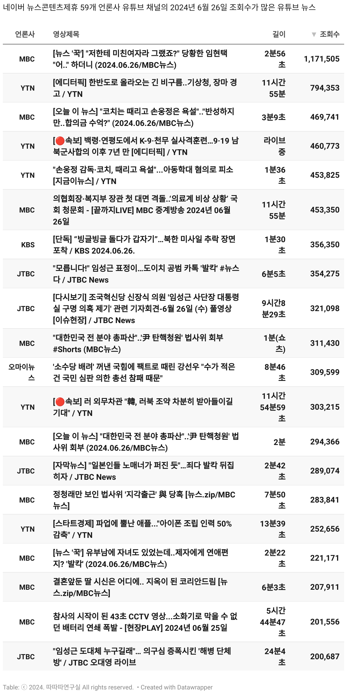 *데이터 수집 기간 : 2024년 6월 10일 *데이터 수집 대상 : 네이버 뉴스콘텐츠제휴 60개 언론사. 종합일간지 10개(경향신문, 국민일보, 동아일보, 문화일보, 서울신문, 세계일보, 조선일보, 중앙일보, 한겨레신문, 한국일보), 방송/통신사 14개(뉴스1, 뉴시스, 연합뉴스, 연합뉴스TV, 채널A, 한국경제TV, JTBC, KBS, MBC, MBN, SBS, SBS BIZ, TV조선, YTN), 경제지 11개(매일경제, 머니투데이, 비즈워치, 서울경제, 아시아경제, 이데일리, 조선비즈, 조세일보, 파이낸셜뉴스, 한국경제(유튜브제외), 헤럴드경제) 인터넷 8개(노컷뉴스, 더팩트, 데일리안, 머니S, 미디어오늘, 아이뉴스24, 오마이뉴스, 프레시안), IT 5개(디지털데일리,디지털타임스, 블로터, 전자신문, 지디넷코리아), 지역 12개(강원도민일보, 강원일보, 경기일보, 국제신문, 대구MBC, 대전일보, 매일신문, 부산일보, 전주MBC, CJB청주방송, JIBS, kbc광주방송)