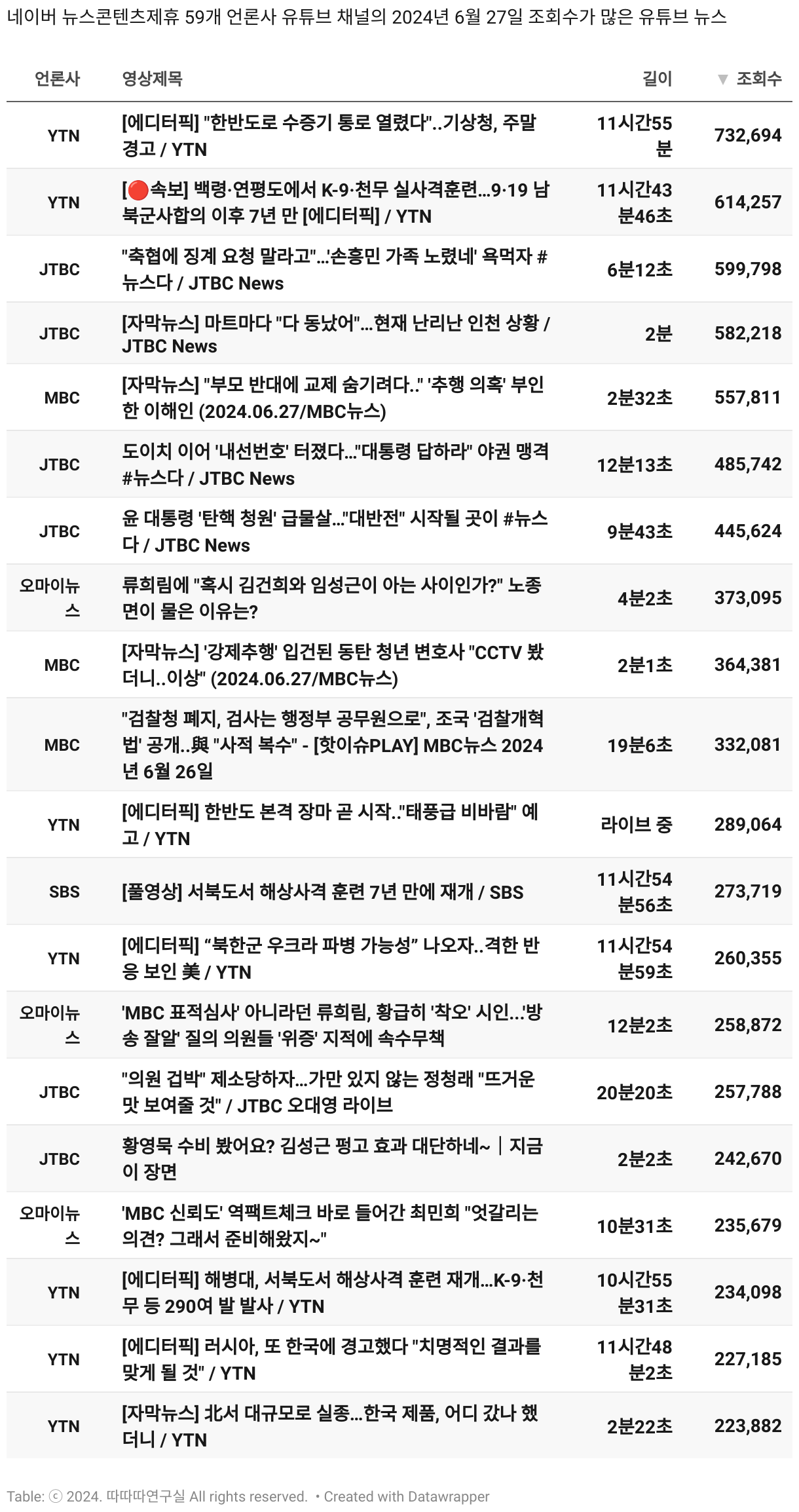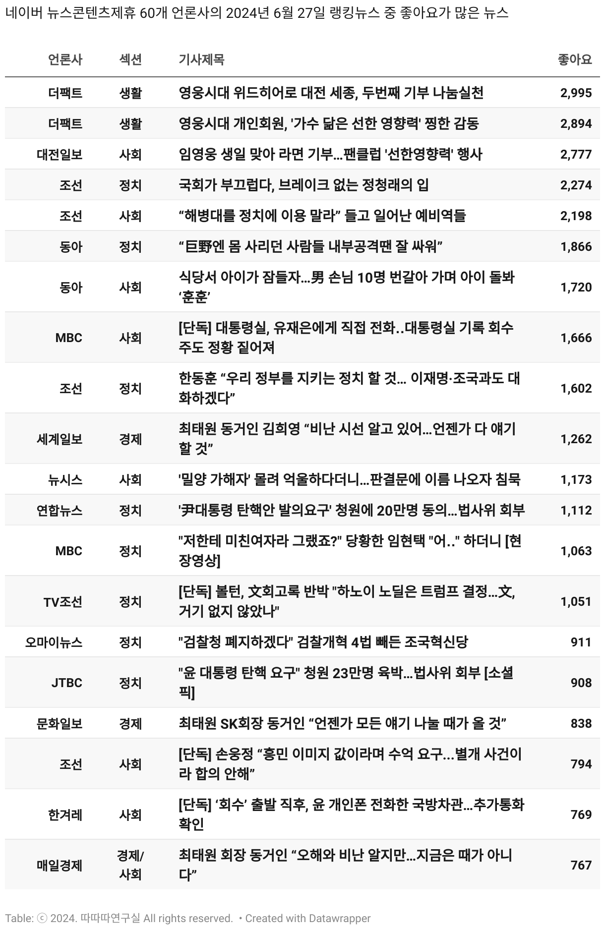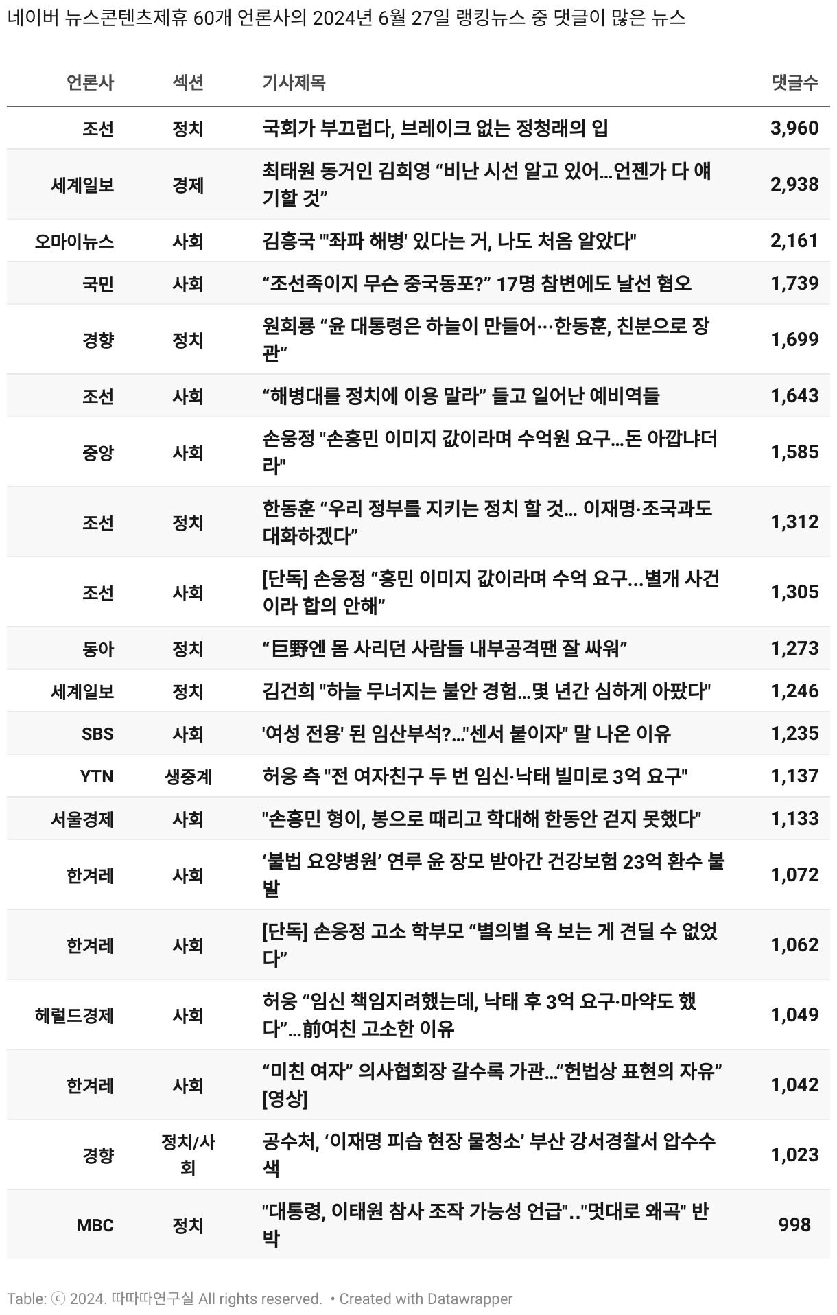 *데이터 수집 기간 : 2024년 6월 10일 *데이터 수집 대상 : 네이버 뉴스콘텐츠제휴 60개 언론사. 종합일간지 10개(경향신문, 국민일보, 동아일보, 문화일보, 서울신문, 세계일보, 조선일보, 중앙일보, 한겨레신문, 한국일보), 방송/통신사 14개(뉴스1, 뉴시스, 연합뉴스, 연합뉴스TV, 채널A, 한국경제TV, JTBC, KBS, MBC, MBN, SBS, SBS BIZ, TV조선, YTN), 경제지 11개(매일경제, 머니투데이, 비즈워치, 서울경제, 아시아경제, 이데일리, 조선비즈, 조세일보, 파이낸셜뉴스, 한국경제(유튜브제외), 헤럴드경제) 인터넷 8개(노컷뉴스, 더팩트, 데일리안, 머니S, 미디어오늘, 아이뉴스24, 오마이뉴스, 프레시안), IT 5개(디지털데일리,디지털타임스, 블로터, 전자신문, 지디넷코리아), 지역 12개(강원도민일보, 강원일보, 경기일보, 국제신문, 대구MBC, 대전일보, 매일신문, 부산일보, 전주MBC, CJB청주방송, JIBS, kbc광주방송)