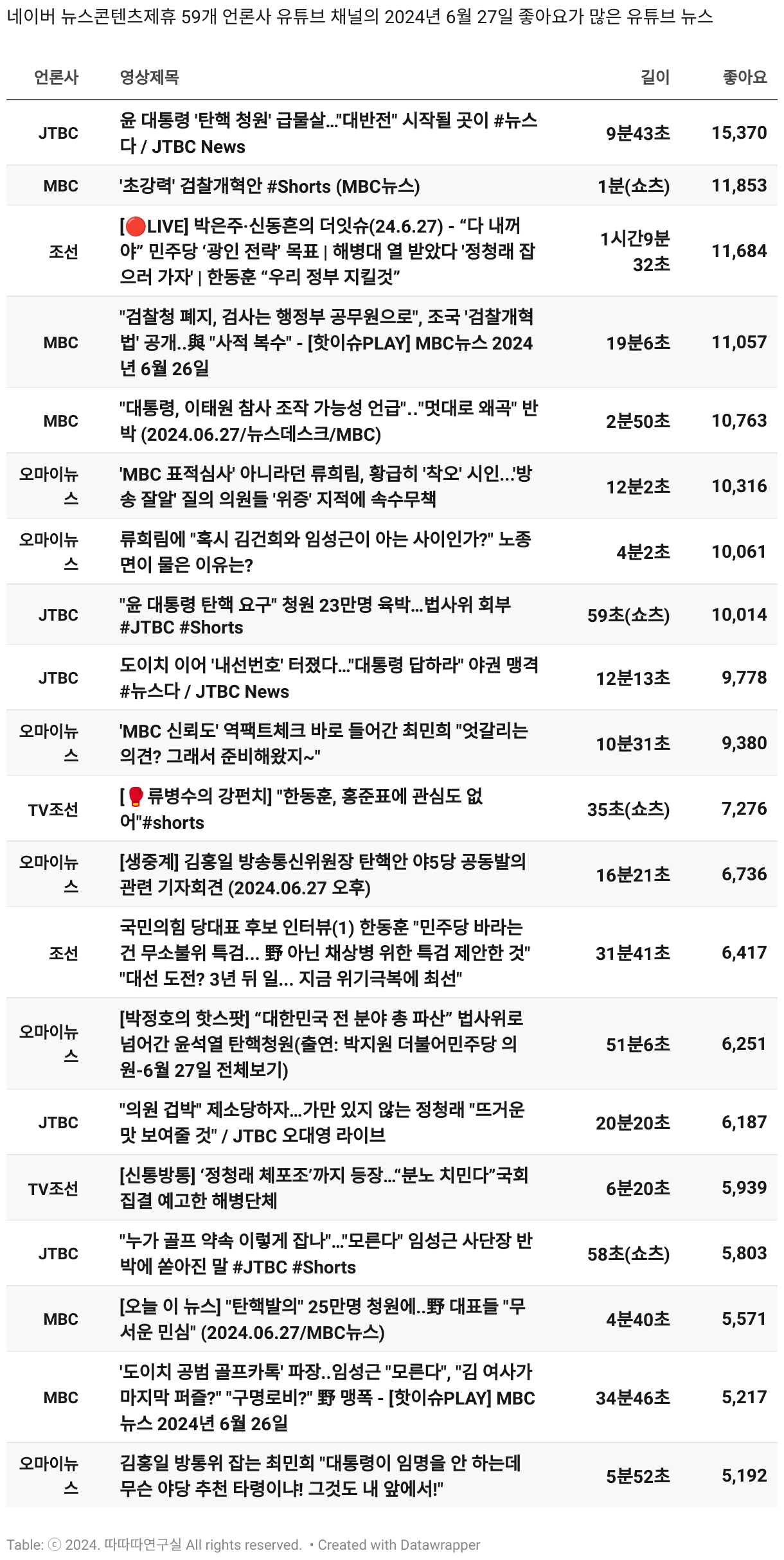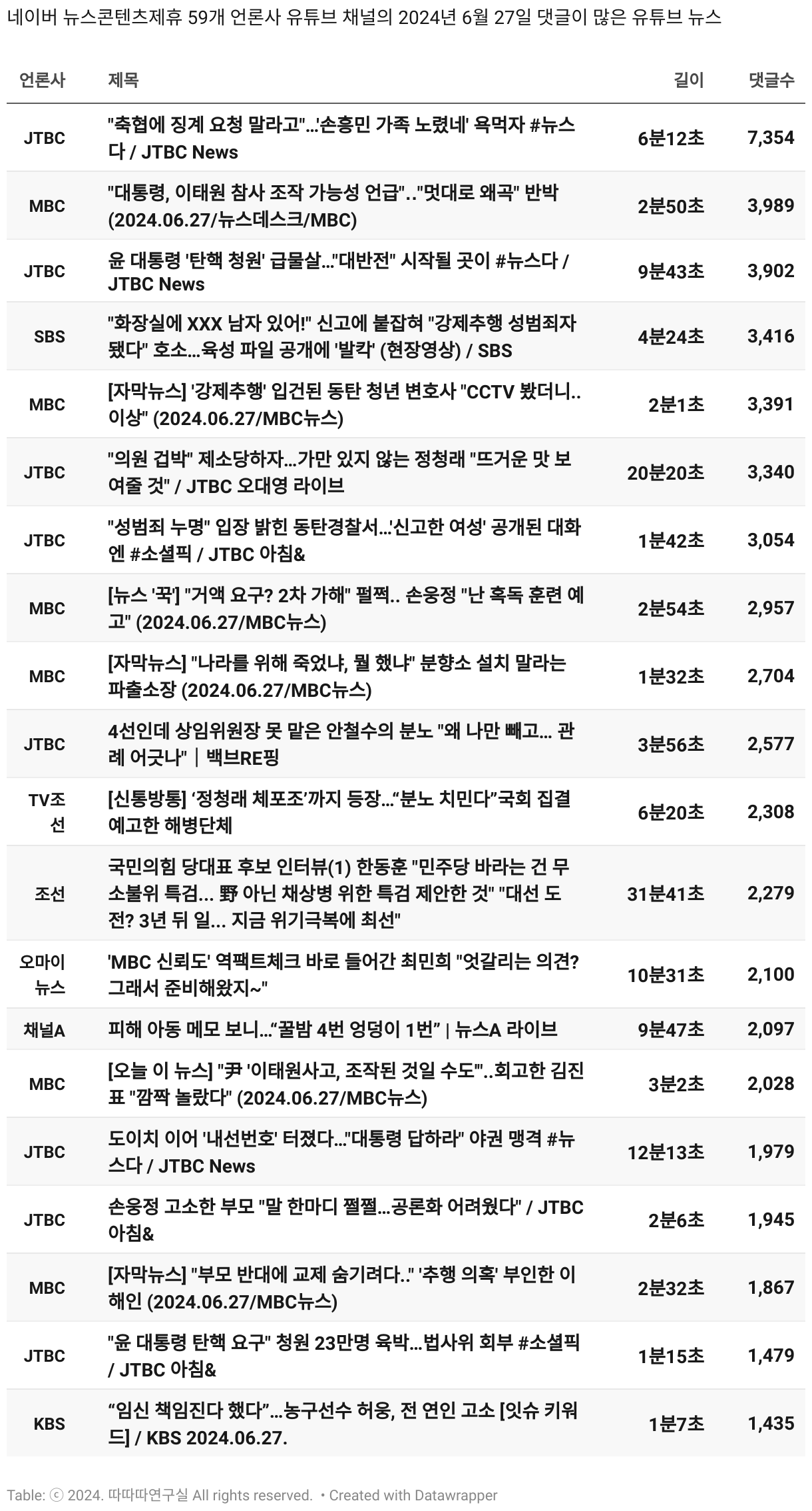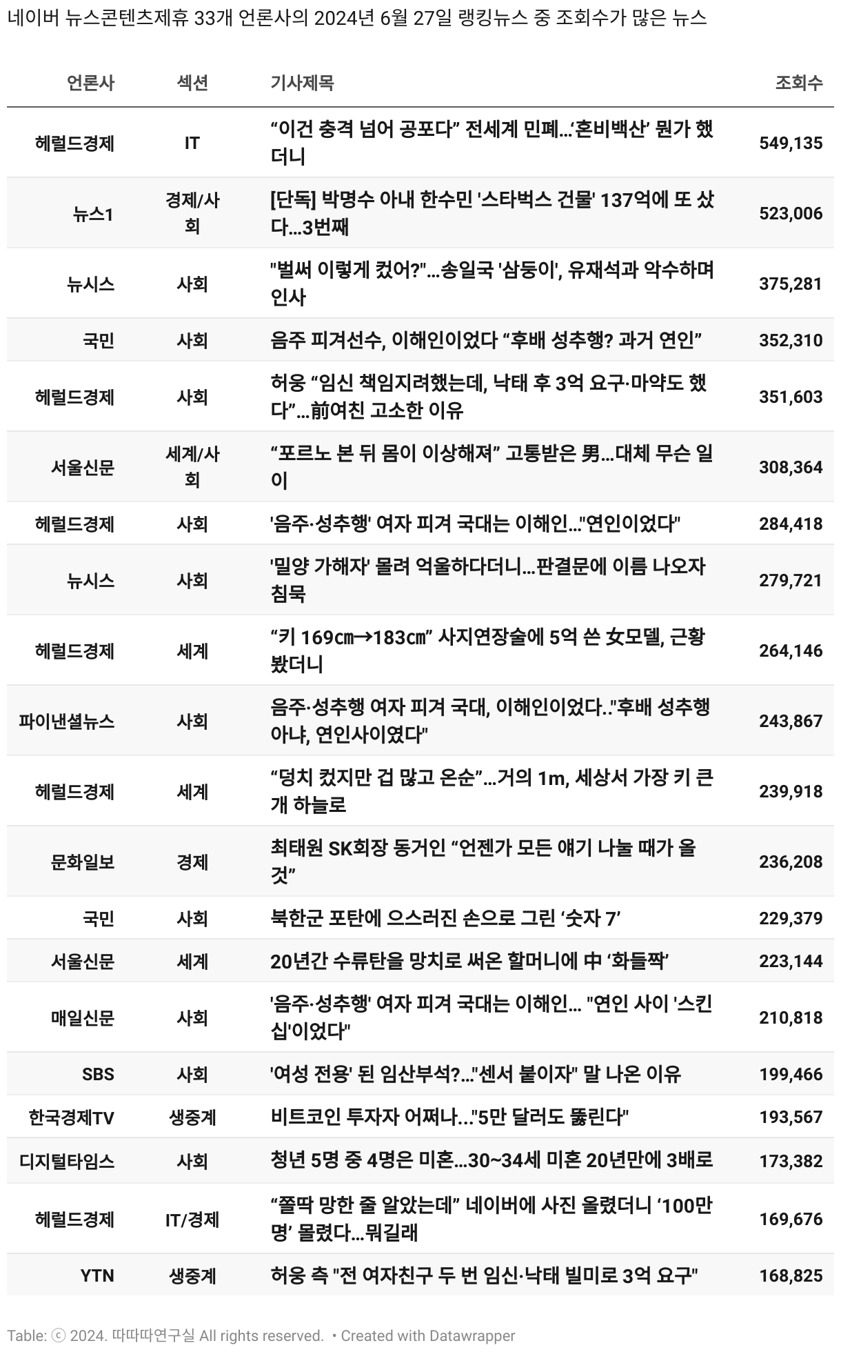 *데이터 수집 기간 : 2024년 6월 10일 *데이터 수집 대상 : 네이버 뉴스콘텐츠제휴 60개 언론사. 종합일간지 10개(경향신문, 국민일보, 동아일보, 문화일보, 서울신문, 세계일보, 조선일보, 중앙일보, 한겨레신문, 한국일보), 방송/통신사 14개(뉴스1, 뉴시스, 연합뉴스, 연합뉴스TV, 채널A, 한국경제TV, JTBC, KBS, MBC, MBN, SBS, SBS BIZ, TV조선, YTN), 경제지 11개(매일경제, 머니투데이, 비즈워치, 서울경제, 아시아경제, 이데일리, 조선비즈, 조세일보, 파이낸셜뉴스, 한국경제(유튜브제외), 헤럴드경제) 인터넷 8개(노컷뉴스, 더팩트, 데일리안, 머니S, 미디어오늘, 아이뉴스24, 오마이뉴스, 프레시안), IT 5개(디지털데일리,디지털타임스, 블로터, 전자신문, 지디넷코리아), 지역 12개(강원도민일보, 강원일보, 경기일보, 국제신문, 대구MBC, 대전일보, 매일신문, 부산일보, 전주MBC, CJB청주방송, JIBS, kbc광주방송)