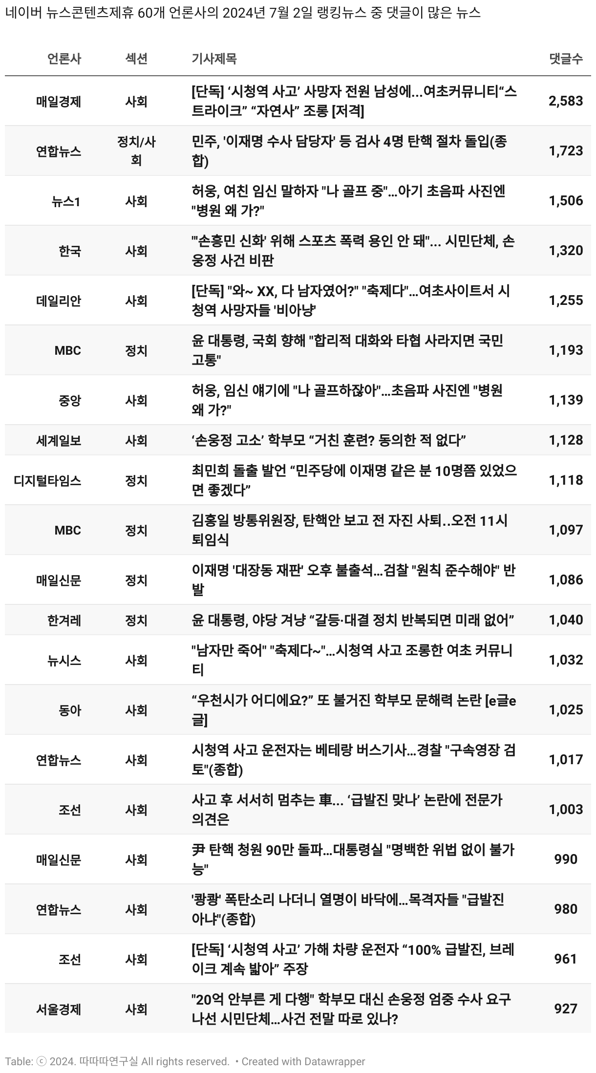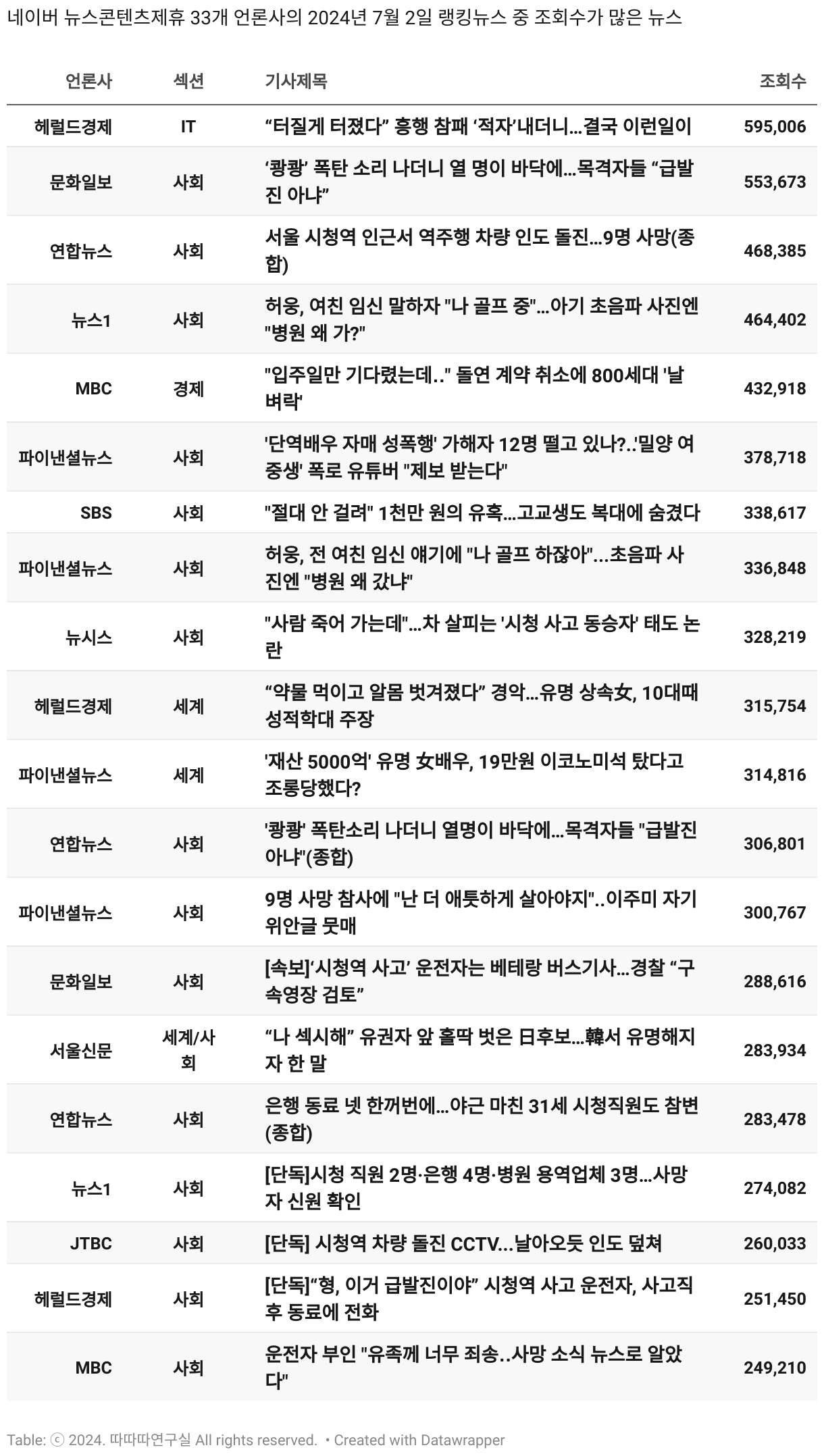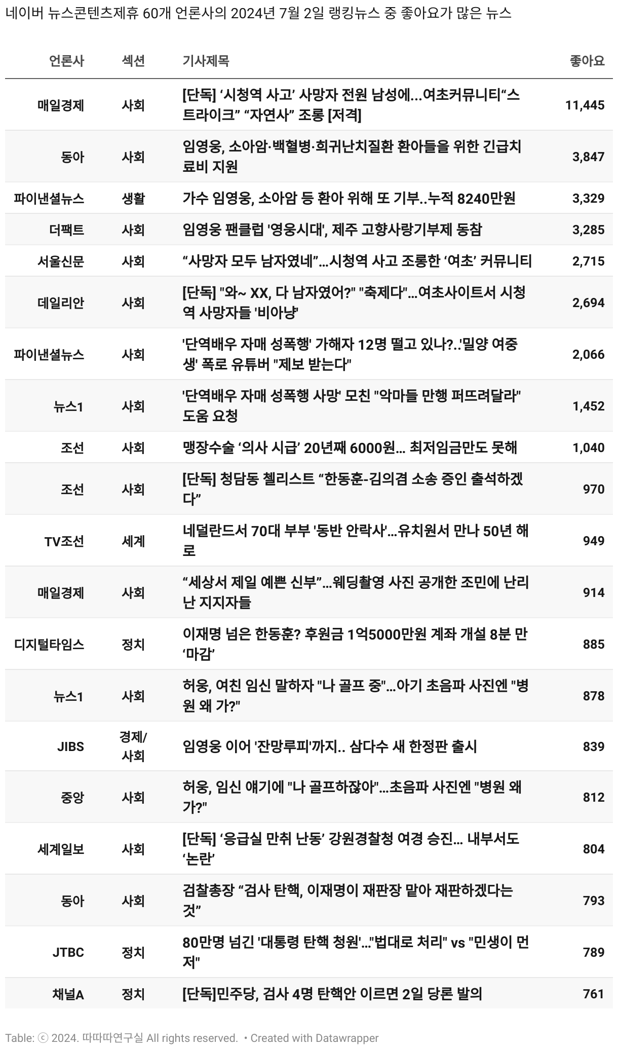 *데이터 수집 기간 : 2024년 6월 10일 *데이터 수집 대상 : 네이버 뉴스콘텐츠제휴 60개 언론사. 종합일간지 10개(경향신문, 국민일보, 동아일보, 문화일보, 서울신문, 세계일보, 조선일보, 중앙일보, 한겨레신문, 한국일보), 방송/통신사 14개(뉴스1, 뉴시스, 연합뉴스, 연합뉴스TV, 채널A, 한국경제TV, JTBC, KBS, MBC, MBN, SBS, SBS BIZ, TV조선, YTN), 경제지 11개(매일경제, 머니투데이, 비즈워치, 서울경제, 아시아경제, 이데일리, 조선비즈, 조세일보, 파이낸셜뉴스, 한국경제(유튜브제외), 헤럴드경제) 인터넷 8개(노컷뉴스, 더팩트, 데일리안, 머니S, 미디어오늘, 아이뉴스24, 오마이뉴스, 프레시안), IT 5개(디지털데일리,디지털타임스, 블로터, 전자신문, 지디넷코리아), 지역 12개(강원도민일보, 강원일보, 경기일보, 국제신문, 대구MBC, 대전일보, 매일신문, 부산일보, 전주MBC, CJB청주방송, JIBS, kbc광주방송)