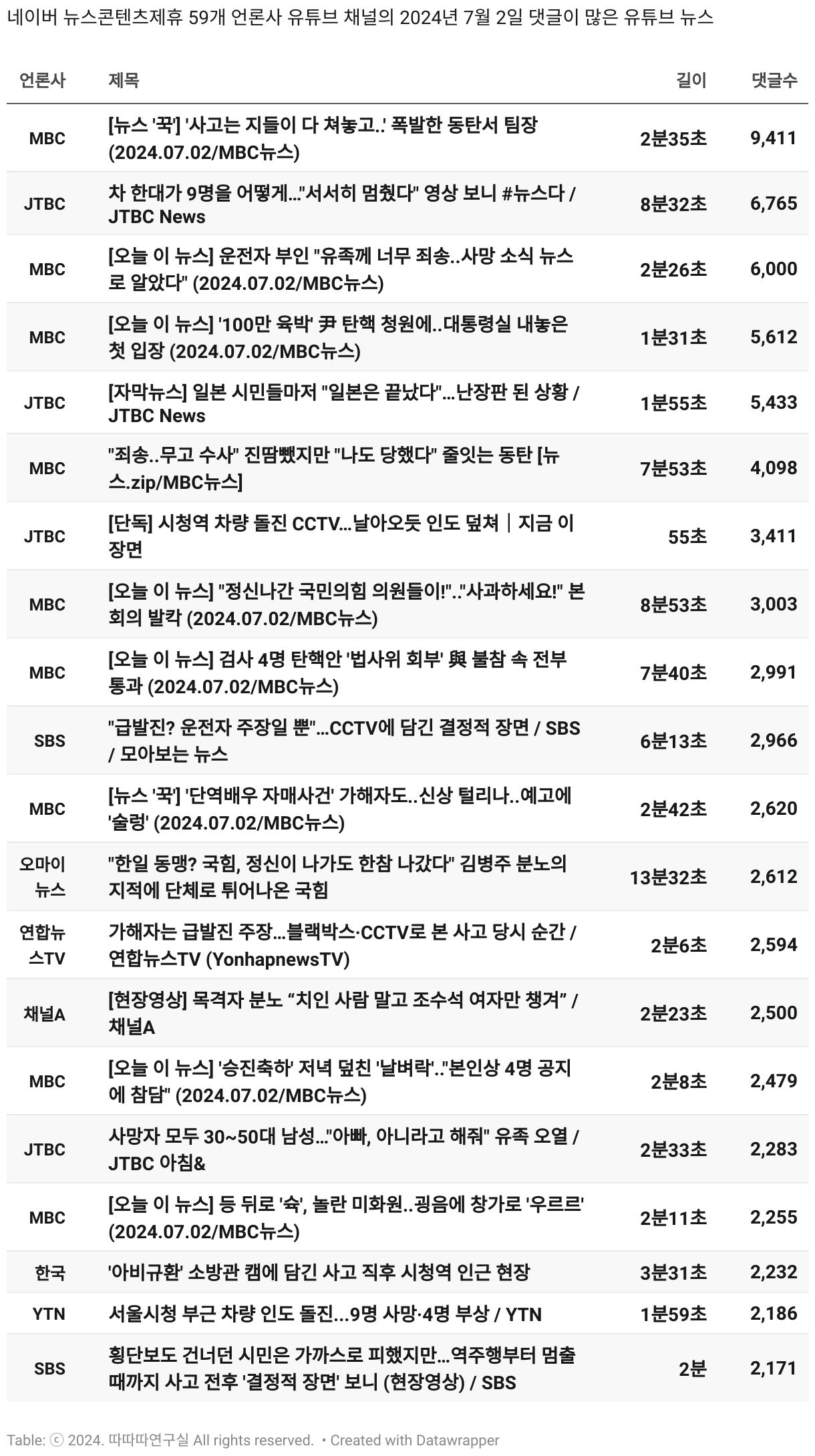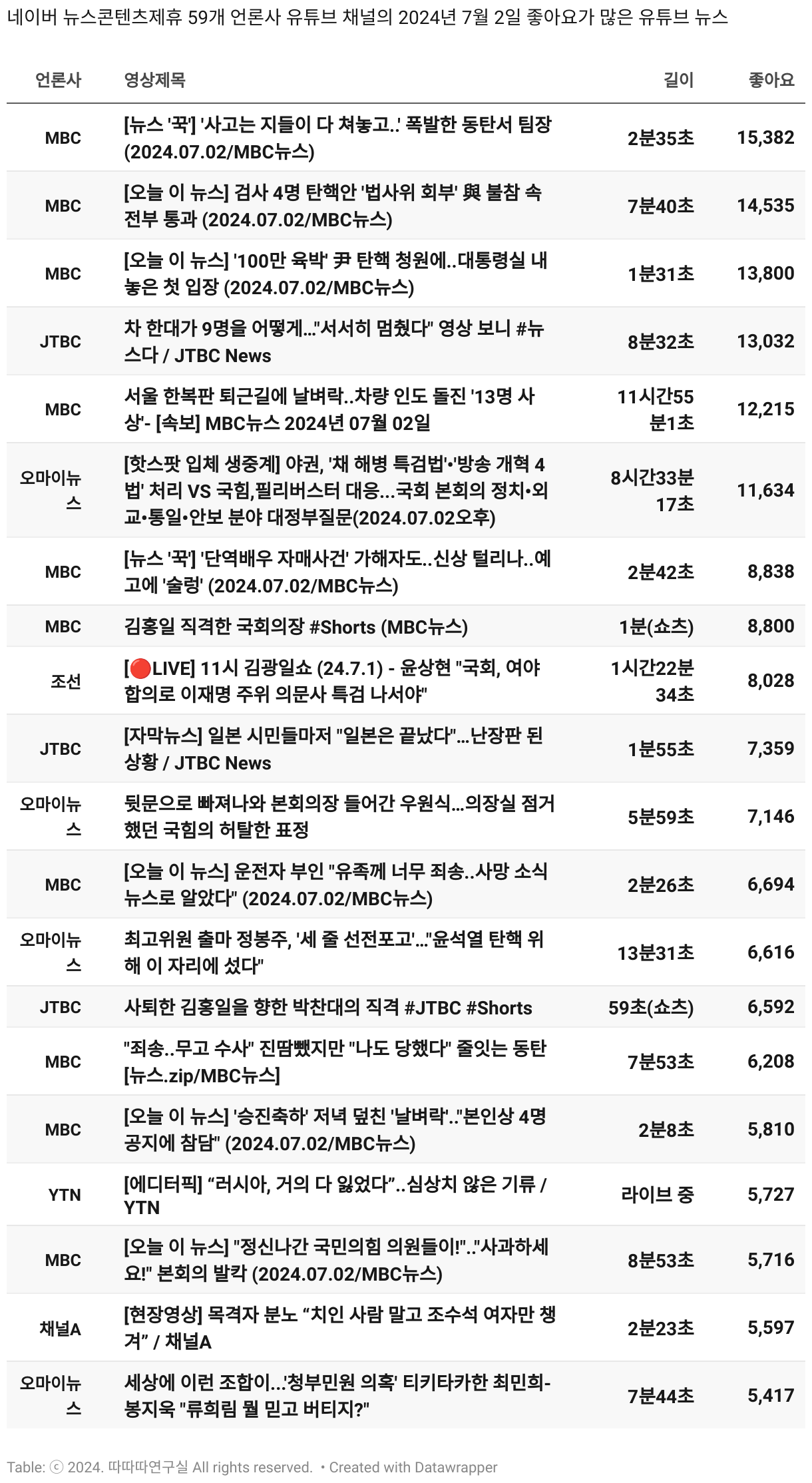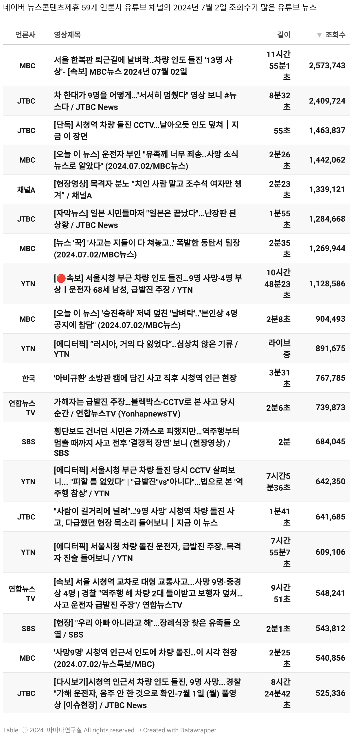 *데이터 수집 기간 : 2024년 6월 10일 *데이터 수집 대상 : 네이버 뉴스콘텐츠제휴 60개 언론사. 종합일간지 10개(경향신문, 국민일보, 동아일보, 문화일보, 서울신문, 세계일보, 조선일보, 중앙일보, 한겨레신문, 한국일보), 방송/통신사 14개(뉴스1, 뉴시스, 연합뉴스, 연합뉴스TV, 채널A, 한국경제TV, JTBC, KBS, MBC, MBN, SBS, SBS BIZ, TV조선, YTN), 경제지 11개(매일경제, 머니투데이, 비즈워치, 서울경제, 아시아경제, 이데일리, 조선비즈, 조세일보, 파이낸셜뉴스, 한국경제(유튜브제외), 헤럴드경제) 인터넷 8개(노컷뉴스, 더팩트, 데일리안, 머니S, 미디어오늘, 아이뉴스24, 오마이뉴스, 프레시안), IT 5개(디지털데일리,디지털타임스, 블로터, 전자신문, 지디넷코리아), 지역 12개(강원도민일보, 강원일보, 경기일보, 국제신문, 대구MBC, 대전일보, 매일신문, 부산일보, 전주MBC, CJB청주방송, JIBS, kbc광주방송)