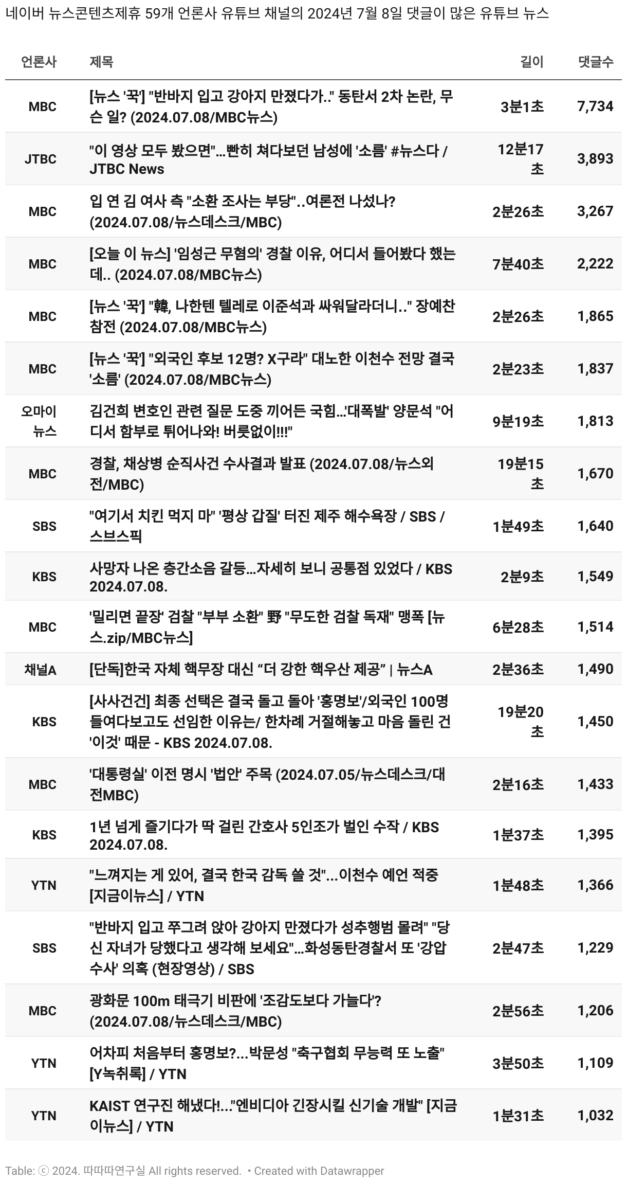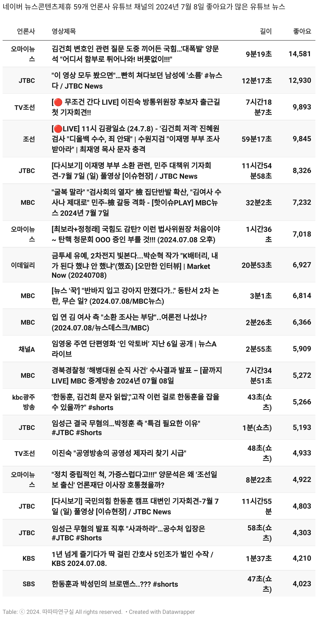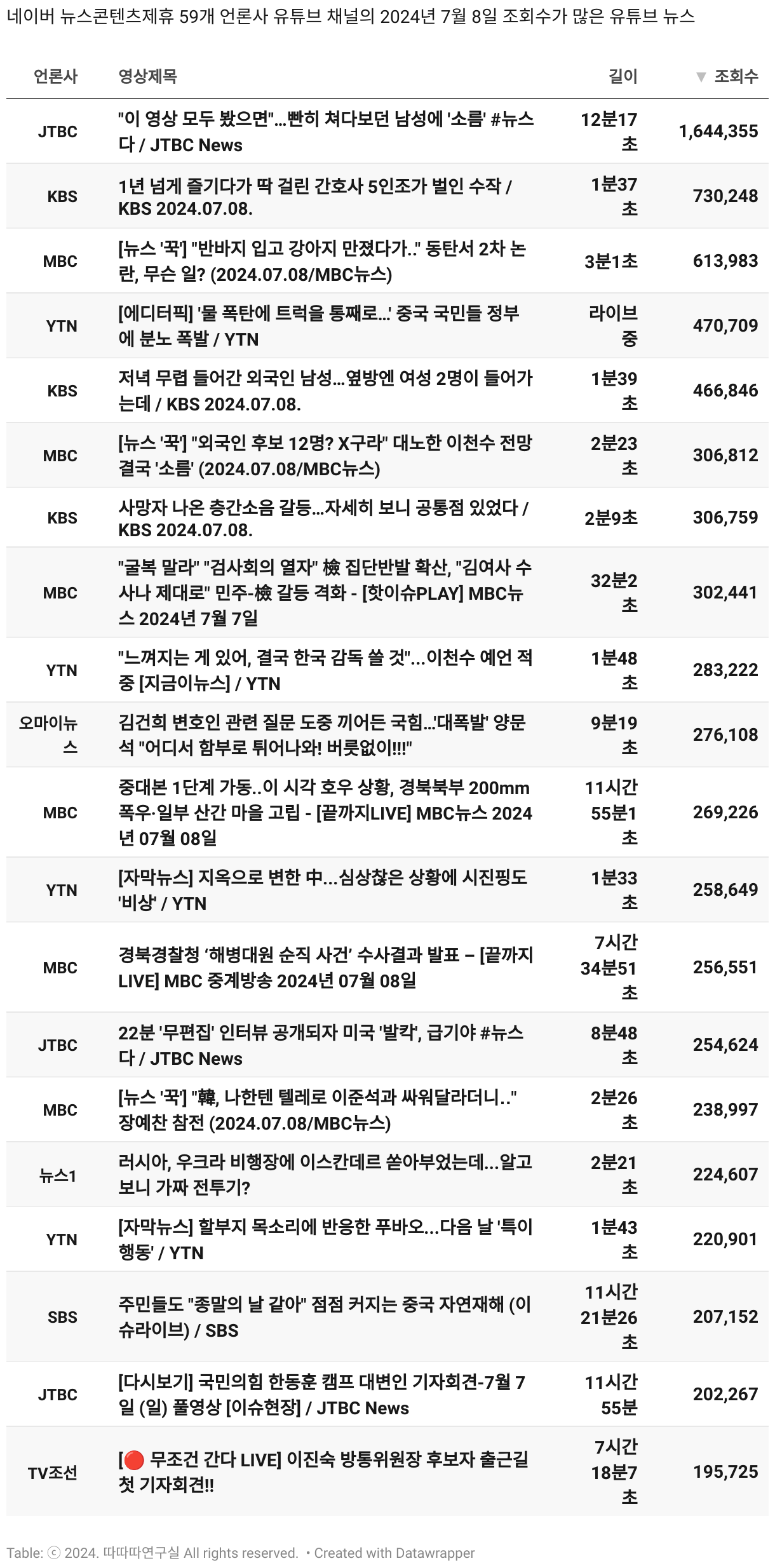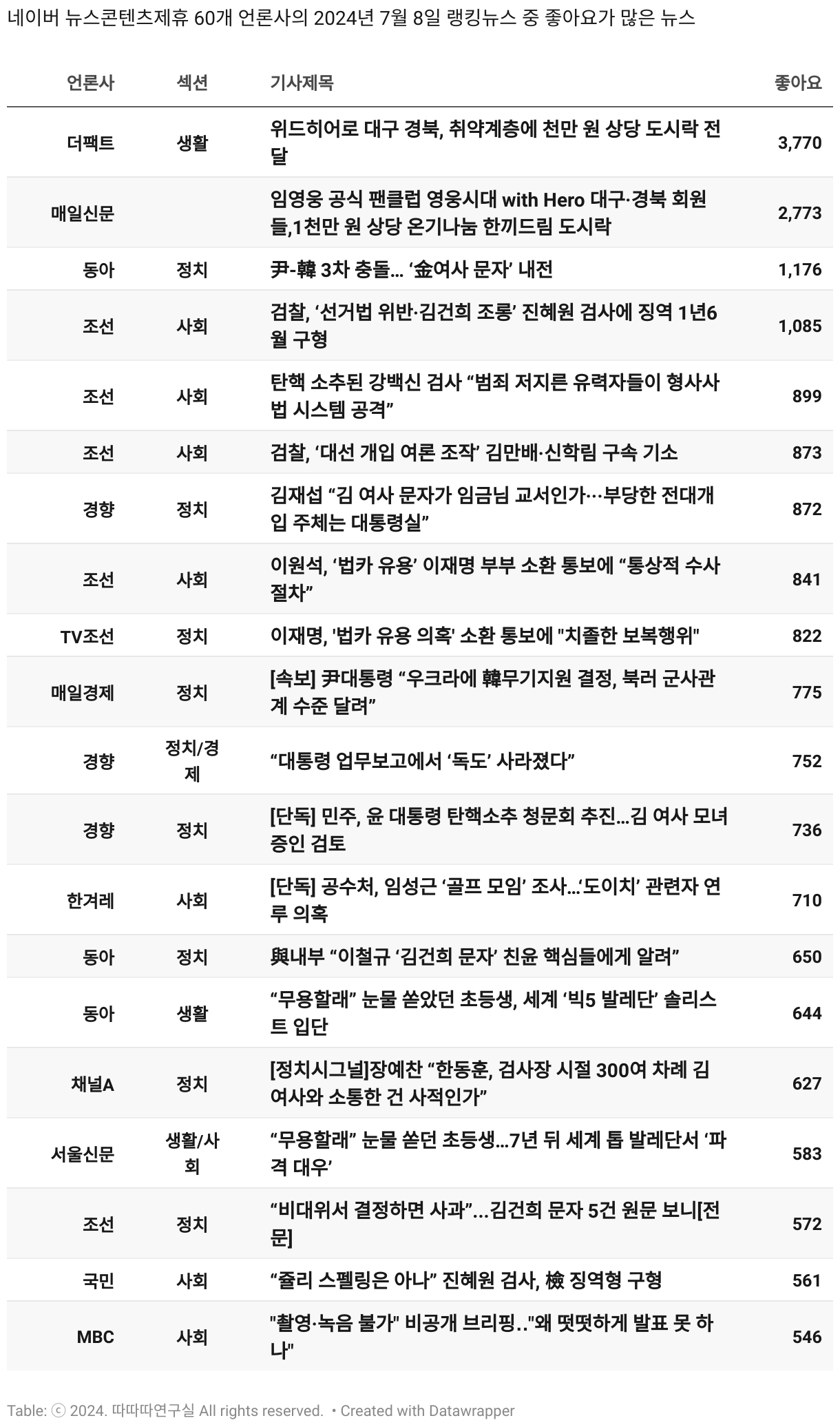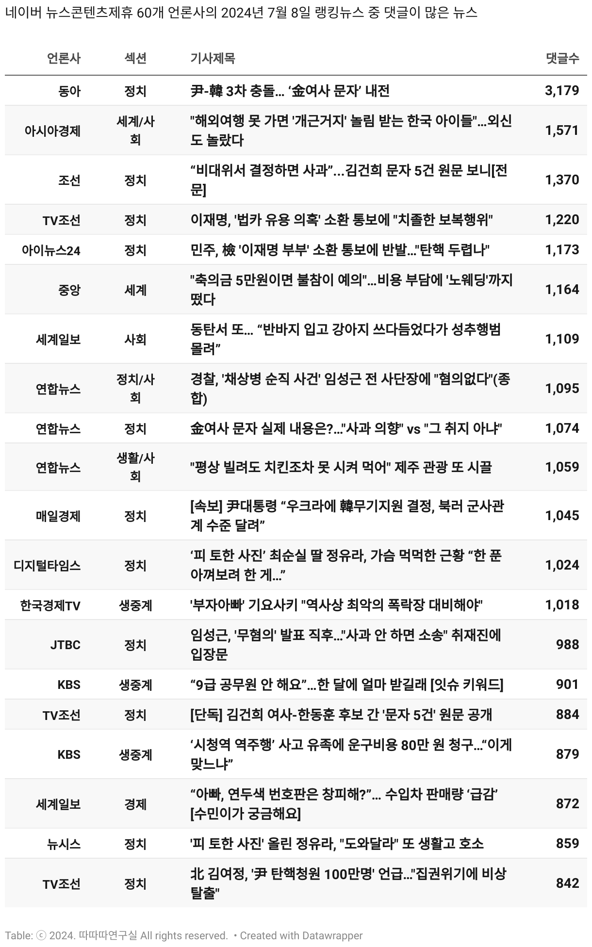 *데이터 수집 기간 : 2024년 6월 10일 *데이터 수집 대상 : 네이버 뉴스콘텐츠제휴 60개 언론사. 종합일간지 10개(경향신문, 국민일보, 동아일보, 문화일보, 서울신문, 세계일보, 조선일보, 중앙일보, 한겨레신문, 한국일보), 방송/통신사 14개(뉴스1, 뉴시스, 연합뉴스, 연합뉴스TV, 채널A, 한국경제TV, JTBC, KBS, MBC, MBN, SBS, SBS BIZ, TV조선, YTN), 경제지 11개(매일경제, 머니투데이, 비즈워치, 서울경제, 아시아경제, 이데일리, 조선비즈, 조세일보, 파이낸셜뉴스, 한국경제(유튜브제외), 헤럴드경제) 인터넷 8개(노컷뉴스, 더팩트, 데일리안, 머니S, 미디어오늘, 아이뉴스24, 오마이뉴스, 프레시안), IT 5개(디지털데일리,디지털타임스, 블로터, 전자신문, 지디넷코리아), 지역 12개(강원도민일보, 강원일보, 경기일보, 국제신문, 대구MBC, 대전일보, 매일신문, 부산일보, 전주MBC, CJB청주방송, JIBS, kbc광주방송)